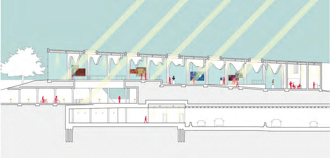 The Synapse Symphony conducts itself towards the local community with integrated musical practice rooms, recreational park space as an extension of Hadley Park, a sweeping monolith serving as a circulatory gallery, and a space for mentorship between Pearl-Cohn High School and HBCUs such as Tennessee State University. By minimizing the highway’s presence at the ground plane, the community is able to re-weave streets, grant access to student resources, and set a precedent for additional communities to take back ownership of what was stolen from them. This design does not reinvent or try to act as a tourist attraction but rather supplements and highlights the pride and richness of the North Nashvillian community.