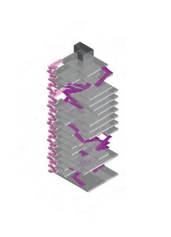 public, semi private, and private lobbies -the elevator unloads passangers as per their access point on the lobby floor from where people circulate using the experiential staircase