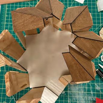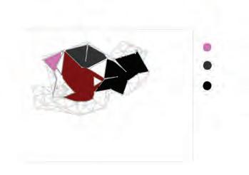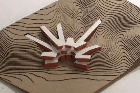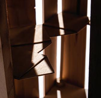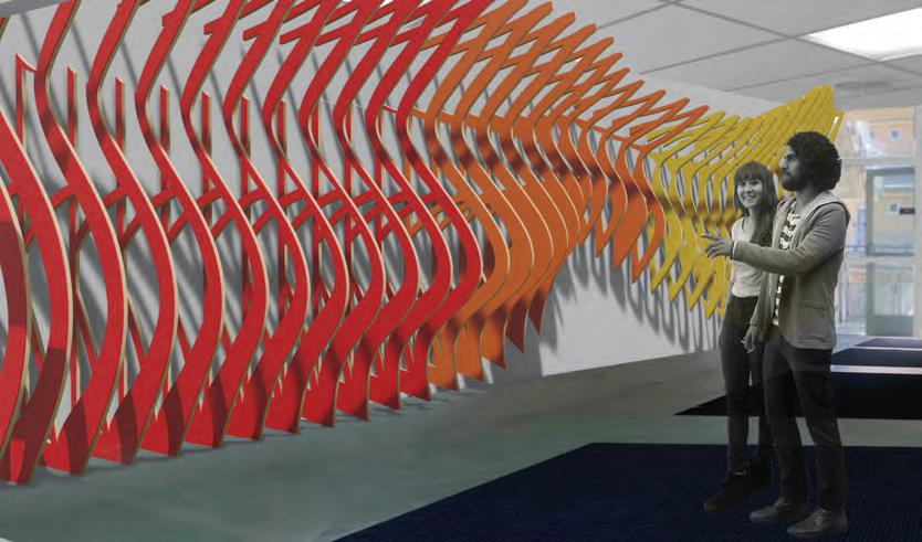 Although the mural is fixed to its frame/wall and is static, there are still options for user interactivity and for the mural to be customized. Implementing LED lighting allows us not only to incorporate the colors of the CAED majors into the design, but also allows the mural to take over the entirety of the bridge gallery through the play of light and shadow. The lighting can also display colors to celebrate CAED’s diversity further on holidays and pride and history months. The mural’s design includes various niches and “pockets” formed by the topography, creating different perceptions of the mural depending on the viewer’s position throughout the space; these hidden spaces provide opportunities for discovery and for displaying models or objects that CAED-affiliated members wish to showcase. Additionally, hooks on more visible planes of the mural will provide students with the opportunity to showcase their work, inform the community of upcoming events or other topics of importance through posters and other hangable items.