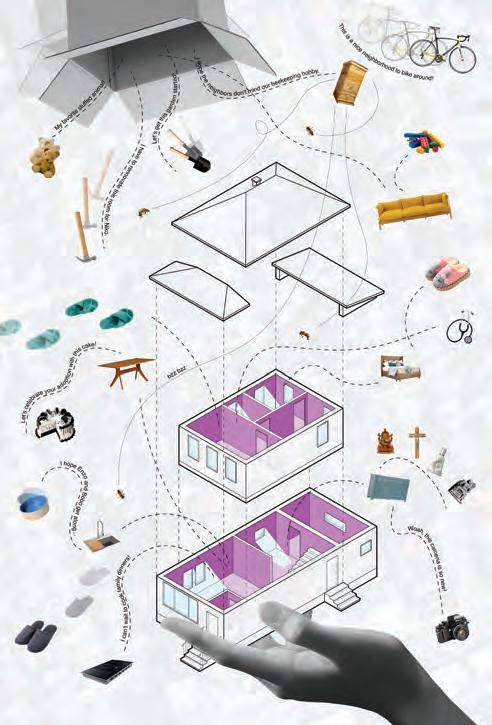 Our design team imagined the legacy of a home as a living architecture that gets to see many families come and go, each group representing a different family in a different collaged manner, our group focusing on the legacy through the accumulation of objects the family aquires through their duration in the home. These three drawings track the journey of one of the many families who inhabit this house. To us the house is not just about the four walls that encapsulate rooms and provide a roof over the head of a family, which of course are invaluable, but also the memories. The home comes from the experiences, the love and care, the good and the bad times, the things we learn and the things we imbibe, and the mementos to which we assign meaning and value. We chose to represent these memories through these objects as we shake them out of the home. This family like any other is not perfect but it is beautiful in its own way. In the first drawing we can see the morning light shining through the windows as the family is finding its grounds and navigating relationships. The second drawing is in daylight as the family has found their flow. The third and last drawing is in sunset as the family is in its last years in the house that they have called home for the last twenty years. It is sad to leave this house but with them they will take the cherished memories, and the objects that have memories attached to them, that made this house a home.