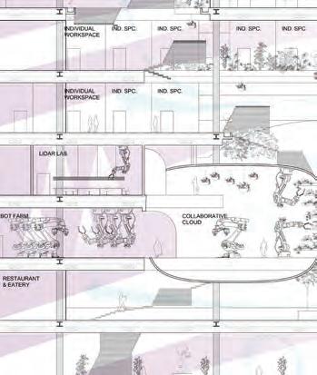 at the top floors the gradually opens up to the collaborative outdoor workspace and recreational facilities for researchers to change their pace of work or recieve an alternate neural activation zone based on their work style preference
