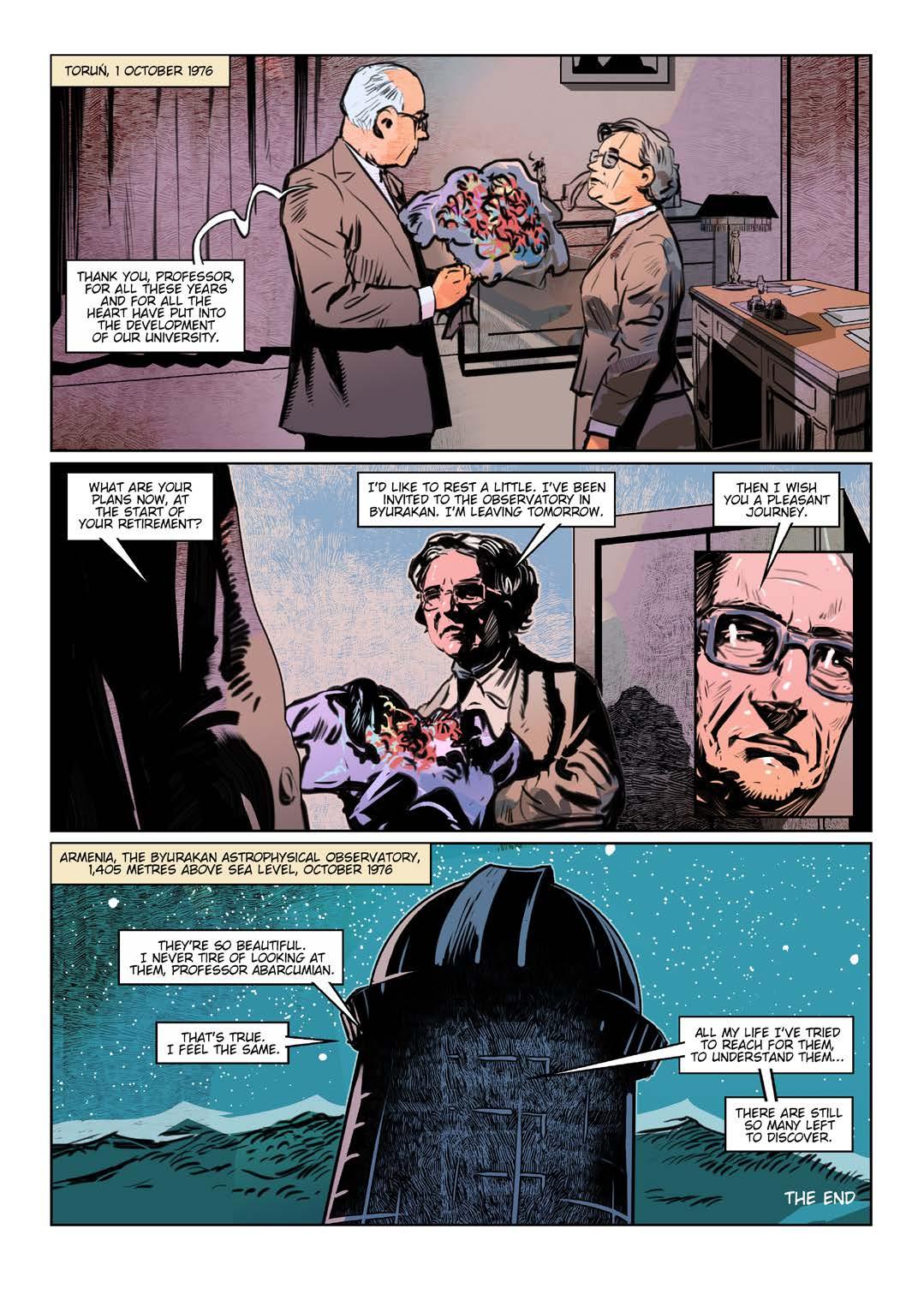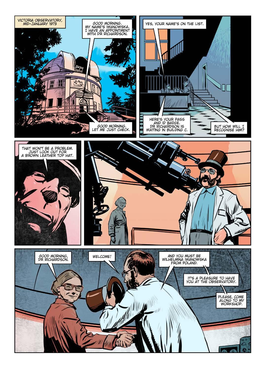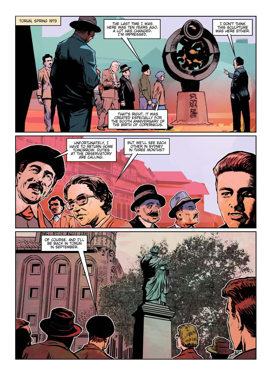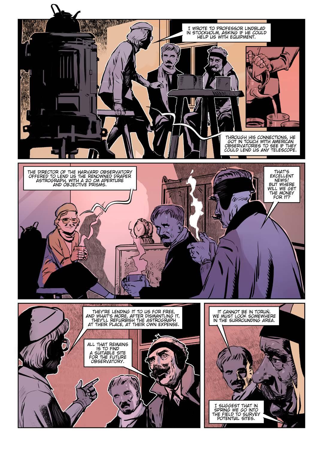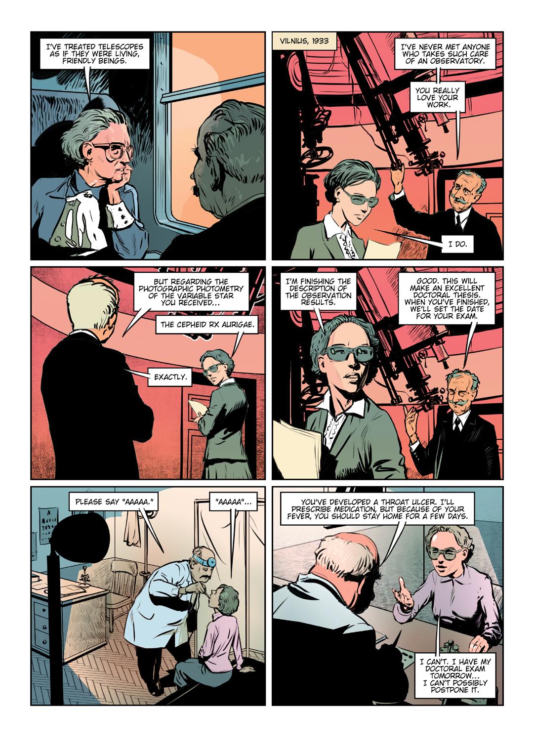 The life and work of Wilhelmina Iwanowska stand as a living testimony to history. Her life is inextricably intertwined with the revival of Polish astronomy after both World Wars. It also reflects the challenging path towards the independence of science during that time. With passion, she devoted part of her career to Copernicus, promoting his vision of the Great Universe. As a diligent witness to the greatest discoveries of the 20th century, she shared them through numerous lectures, interviews, and dozens of popular science articles in Urania and Postępy Astronomii. Today, she serves as an inspiration for many artistic, literary, theatrical, musical, and cinematic endeavours – and for this comic book.
