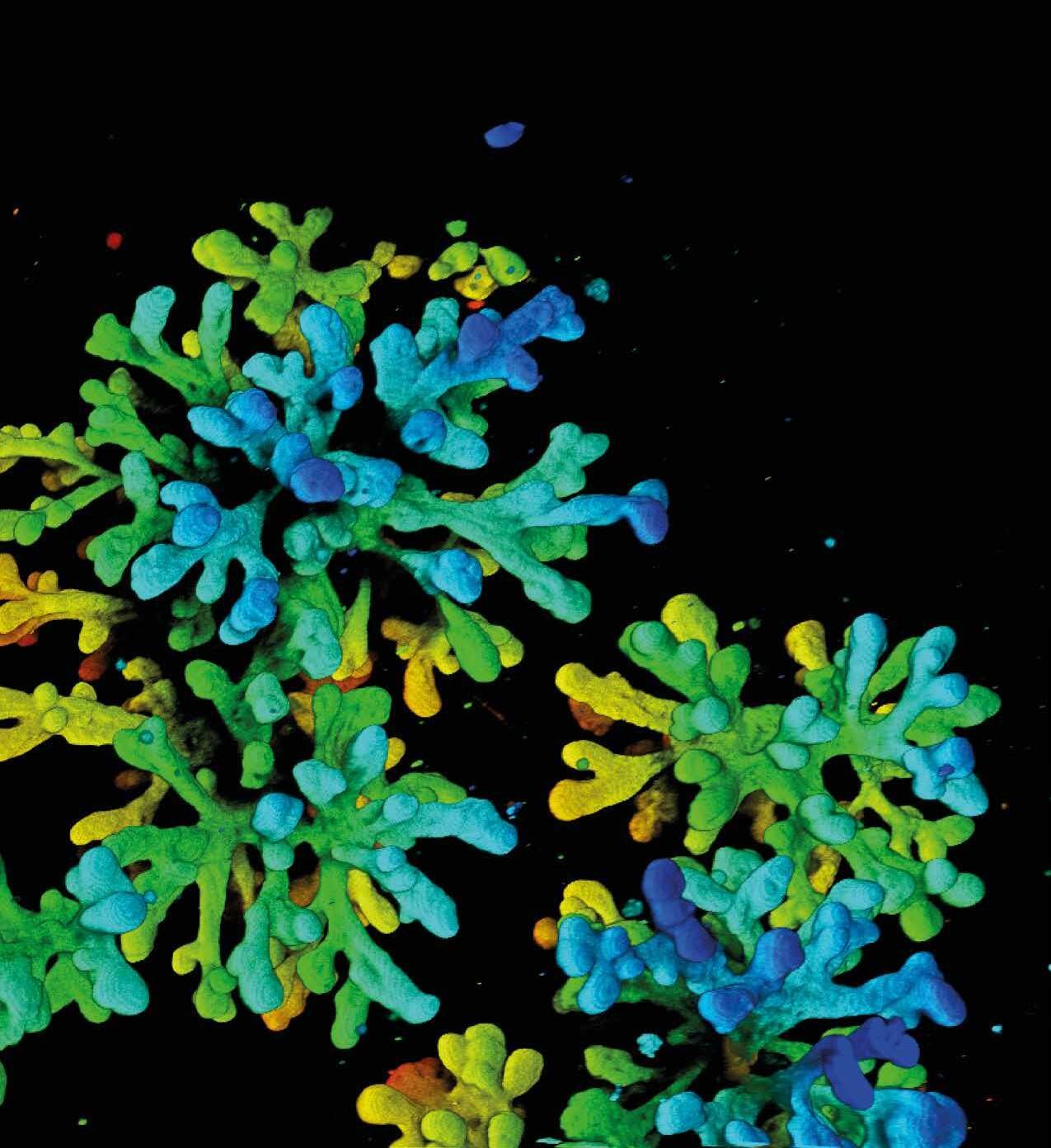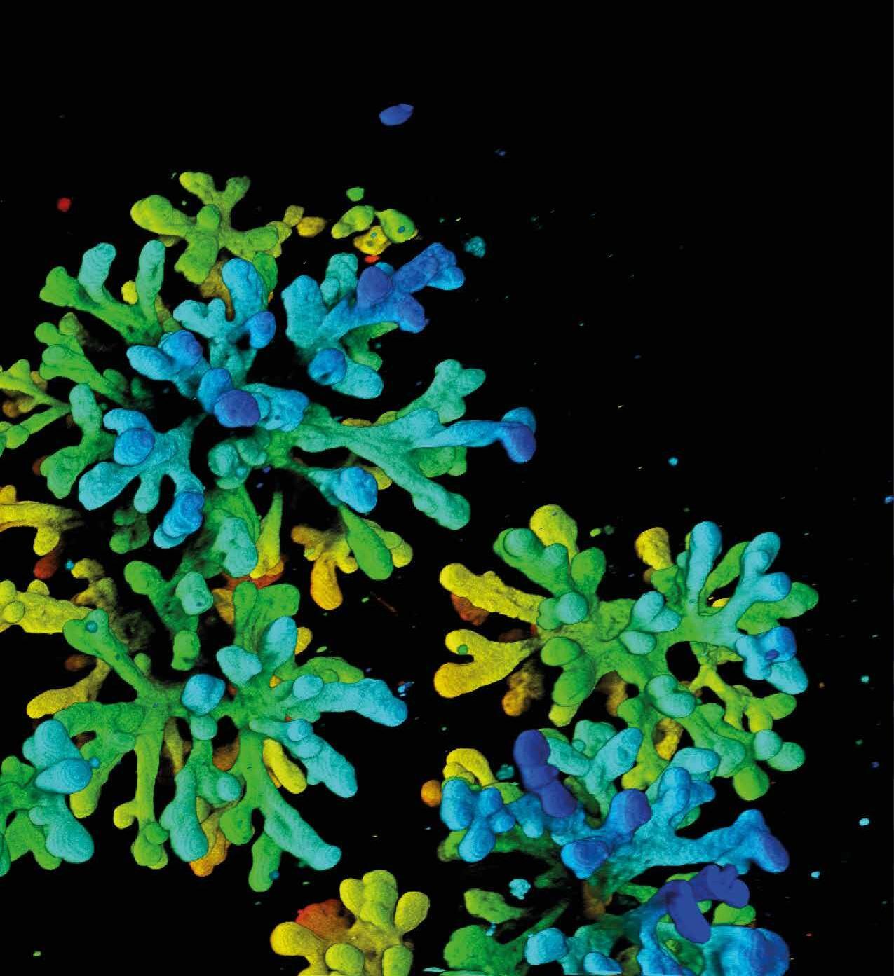 Geen zeewier in donkere wateren, maar een kweekje van de melkklieren uit het borstweefsel van een muis. Het is een organoïde, een 3D-structuur van celletjes in een kweekschaaltje. De delen in het rood zijn het meest veraf gelegen, de blauwe dichtbij. Dit type organoïdes wordt gebruikt bij het onderzoek naar borstkanker, vertelt kankerbioloog Colinda Scheele, hoofd van het Laboratorium voor Intravitale Microscopie en Dynamiek van Tumorprogressie (VIB-KU Leuven).