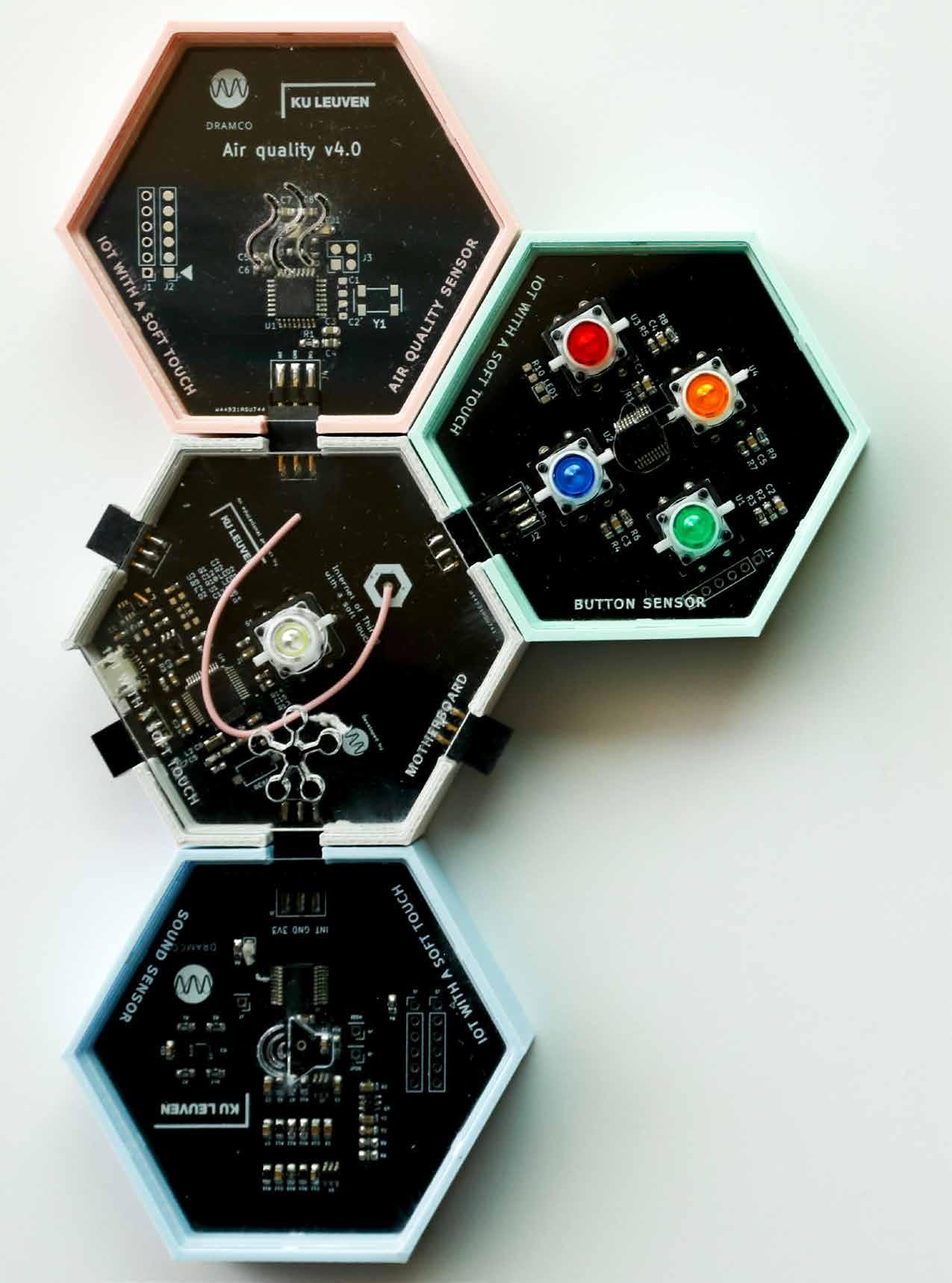 Het pakket dat het team onder de noemer ‘IoT with a Soft Touch’ bedacht, bestaat uit zeshoekige paneeltjes. Eén daarvan is een microcomputertje – het brein van het systeem – dat meetgegevens verzamelt en draadloos doorstuurt. In dat moederbord kunnen de leerlingen een aantal sensoren pluggen. Zo is er een module met een microfoontje dat het geluidsniveau registreert, een andere meet omgevingsfactoren als temperatuur en luchtkwaliteit. Er is ook een paneeltje met vier drukknopjes, waarmee ze quizjes of polls kunnen doen. Via een online dashboard krijgen ze een overzicht van alle meetgegevens.