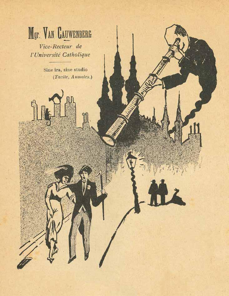 Vicerector Jean van Cauwenbergh was bijzonder impopulair bij de studenten vanwege zijn niet aflatende inspanningen om studenten te betrappen op inbreuken op het reglement. In 1913 verscheen deze karikatuur in de studentikoze publicatie Nos maîtres et nos poires. Galerie académique humoristique.
