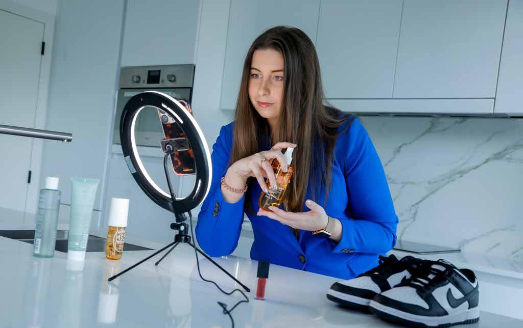 Elisabeth Lucie Baeten, terwijl ze een melding checkt op haar smartphone. “Alleen al aan Instagram spendeer ik twee uur per dag … Maar een socialmediabreak zit er niet in – dit is mijn leven nu. Het is niet leuk om constant ‘aan’ te staan en alles te moeten opvolgen, maar ik ben ook dankbaar. Zonder was ik wellicht niet waar ik nu ben.”