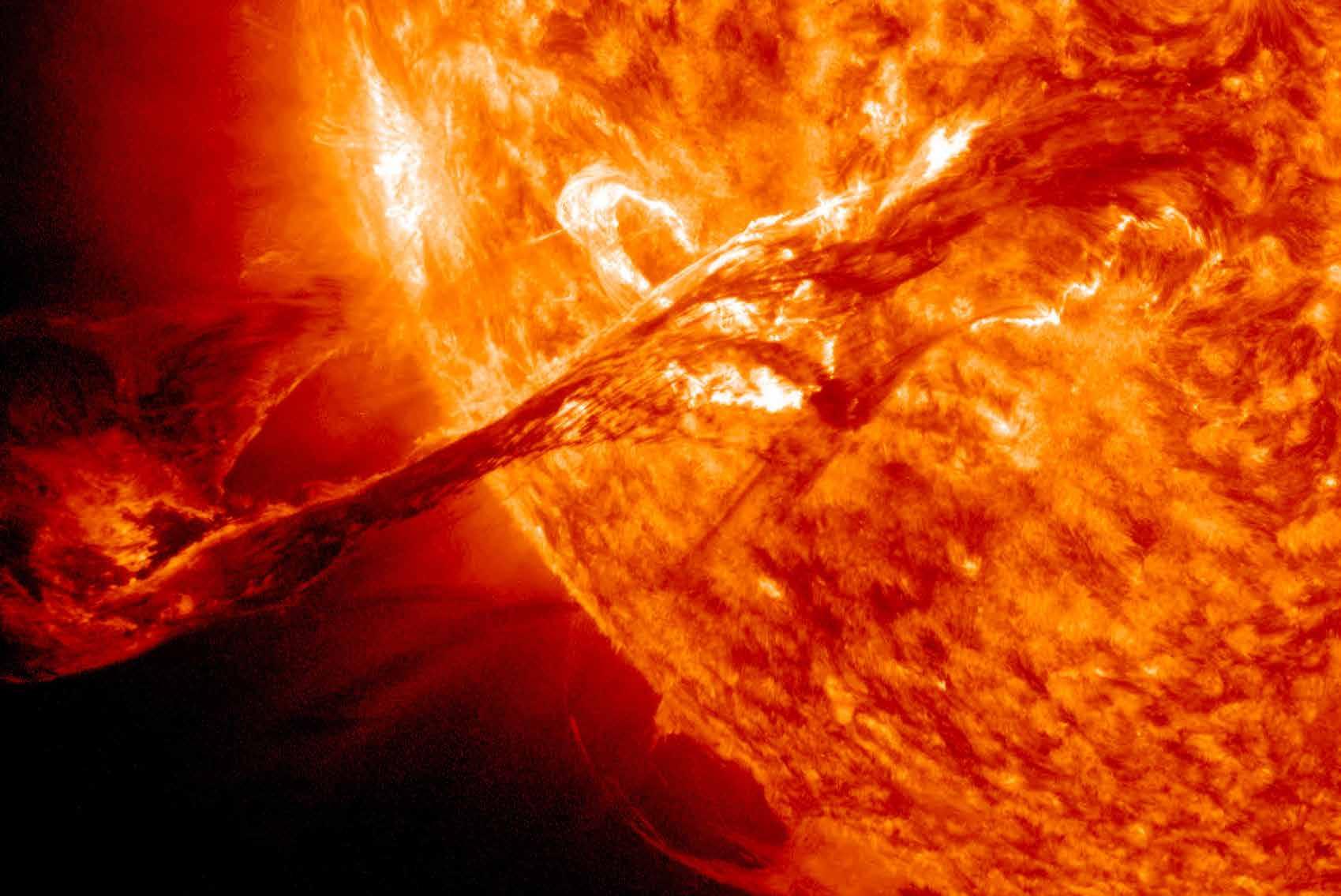 Bij een zonnestorm wordt een grote plasmawolk uit de corona – zeg maar de buitenste atmosfeer van de zon – weggeslingerd in de ruimte met snelheden tot soms wel 3.000 kilometer per seconde. Hier vastgelegd door de SOHO-ruimtetelescoop, in 2015.