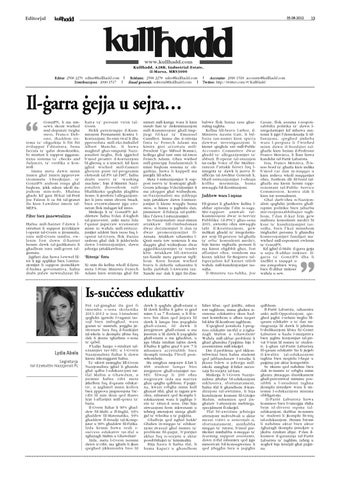www.kullhadd.com Kull˙add, A28B, Industrial Estate, il-Marsa, MRS3000 Editur: 2568 2270 editur@kullhadd.com | Reklami: 2568 2278 sales@kullhadd.com | Accounts: 2090 1518 accounts@kullhadd.com Distribuzzjoni: 2090 1517 | Email ©enerali: editorial@kullhadd.com | Twitter: http://twitter.com/#!/KullHadd