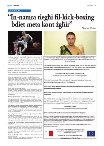 Kemm ilek tipprattika l-kick-boxing u kif bdejt f'dan l-isport? Ilni nittrenja l-kick-boxing g˙al dawn l-a˙˙ar ˙mistax -il sena. Innamra tieg˙i fil-kick-boxing bdiet minn meta kont Ωg˙ir g˙ax kont naffaxxina ˙afna ru˙i mill-arti marzjali u b’hekk kont nara ˙afna films. MaΩ-Ωmien ku©in tieg˙i kien jittrenja mall-‘Ying Yang Kickboxing Club’ u kien ˙e©©i©ni biex nibda nittrenja dan l-isport. Mill-ewwel kien og˙©obni u b’hekk bqajt immur nittrenja sa minn età Ωg˙ira. Kemm tqatta ˙in tit˙arre© kuljum? Meta ma jkollix xi kompetizzjoni fil-qrib normalment nittrenja madwar 3 darbiet fil-©img˙a. Kull sezzjoni tat-ta˙ri© iddum madwar sag˙tejn. Filwaqt li meta l- kompetizzjoni toqrob g˙al tlett xhur nibda nittrenja kuljum u nΩid fil-˙in billi nittrenja iktar minn darba kuljum. X'inhuma dawk il-fatturi li jag˙mlu kick-boxer tajjeb? Ma teΩisti l-ebda teknika partikolari biex wie˙ed ikun kick-boxer tajjeb g˙aliex kul˙add g˙andu l-istil tieg˙u. Madanakollu na˙seb li hu importanti ˙afna li jkollok flessibilità tajba, kowç serju li jmexxik fid-direzzjoni t-tajba, determinazzjoni qawwija u objettiv çar ta’ fejn tixtieq li tasal fil-futur. Óadt sehem f'diversi kompetizzjonijiet li w˙ud minnhom kienu presti©©juΩi ˙afna g˙al dan l-isport. Xi tg˙idilna dwarhom? Kull kompetizzjoni li kelli g˙alija huma presti©©juΩi ˙afna g˙ax f’kull kompetizzjoni titg˙allem xi ˙a©a imma l-iktar li huma ta’ pre©ju il-kompetizzjonijiet ta’ meta bdejt nikkompeti fil-livell ta’ kick-boxer professjonali. Fil-jiem li g˙addew inti rnexxielek tirba˙ ©lieda importanti ˙afna. Kif kienet din l-esperjenza? Din kienet kompetizzjoni bejn sitt atleti Maltin kontra sitt atleti IrlandiΩi fejn fiha ksibna suççess g˙al Malta g˙aliex minn sitta konna ˙amsa li rba˙na. F’din il- kompetizzjonji jien ˙ri©t sodisfatt ˙afna g˙aliex irnexxieli nag˙mel knock-out mall- ewwel rawnd. Ta˙seb li dan l-isport qieg˙ed jing˙ata biΩΩejjed importanza fuq baΩi lokali? Niftakar li meta bdejt dan l-isport ma kienet teΩisti l-ebda tip ta’ prominenza lejn il-kick-boxing. Illum l-importanza lejn din iddixxiplina kibret ftit iktar iΩda xorta mux biΩΩejjed. Personalment nistenna ˙afna iktar u li dan l-isport jing˙ata l-istess importanza b˙alma jing˙ataw dixxiplini sportivi o˙rajn g˙aliex meta nipparteçipaw fix-xena internazzjonali inkunu qed nirrapreΩentaw lil Malta b˙al atleti o˙ra. Finalment g˙andek xi ˙olma partikolari li tixtieq twettaq b'rabta mall-kick-boxing? Il-˙olma tieg˙i hi li jkolli iktar ˙in biex nittrenja ˙alli nkun nista’ nwettaq iktar kompetizzjonijiet internazzjonali.