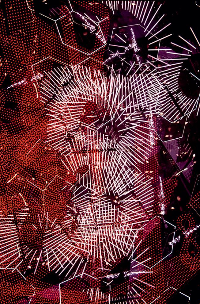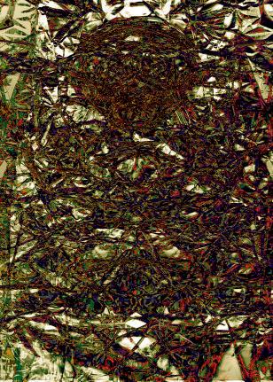 Gábos digitális ornamentikája részletgazdagságával, változatos játékosságával kápráztatja el nézőjét; ér-, vagy testnedvek végeláthatatlanjel-hálózataez.