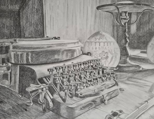 Blumenschein Ágota finom rajzolatú alkotásán egy öreg talán Remmington írógép pihen egy az asztalon. Minden adott, hogy egy elfeledett, régi történet írásába kezdjen rajta valaki. A múltba tekint is. Héder Mária Szögletes fénycsóvák világítanak meg egy régi épületet. A fénycsóvák megvilágítanak, de el is rejtenek részleteket a múltból.