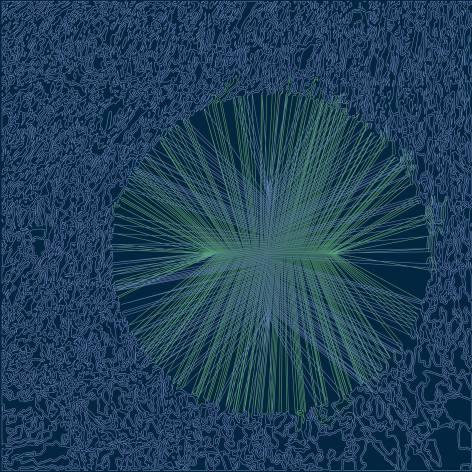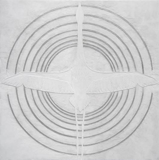 P. Boros Ilona jesztett szárnyú gázlómadár vitorlázik a táguló körgyűrűk fölött. A madártest a négy égtáj felé