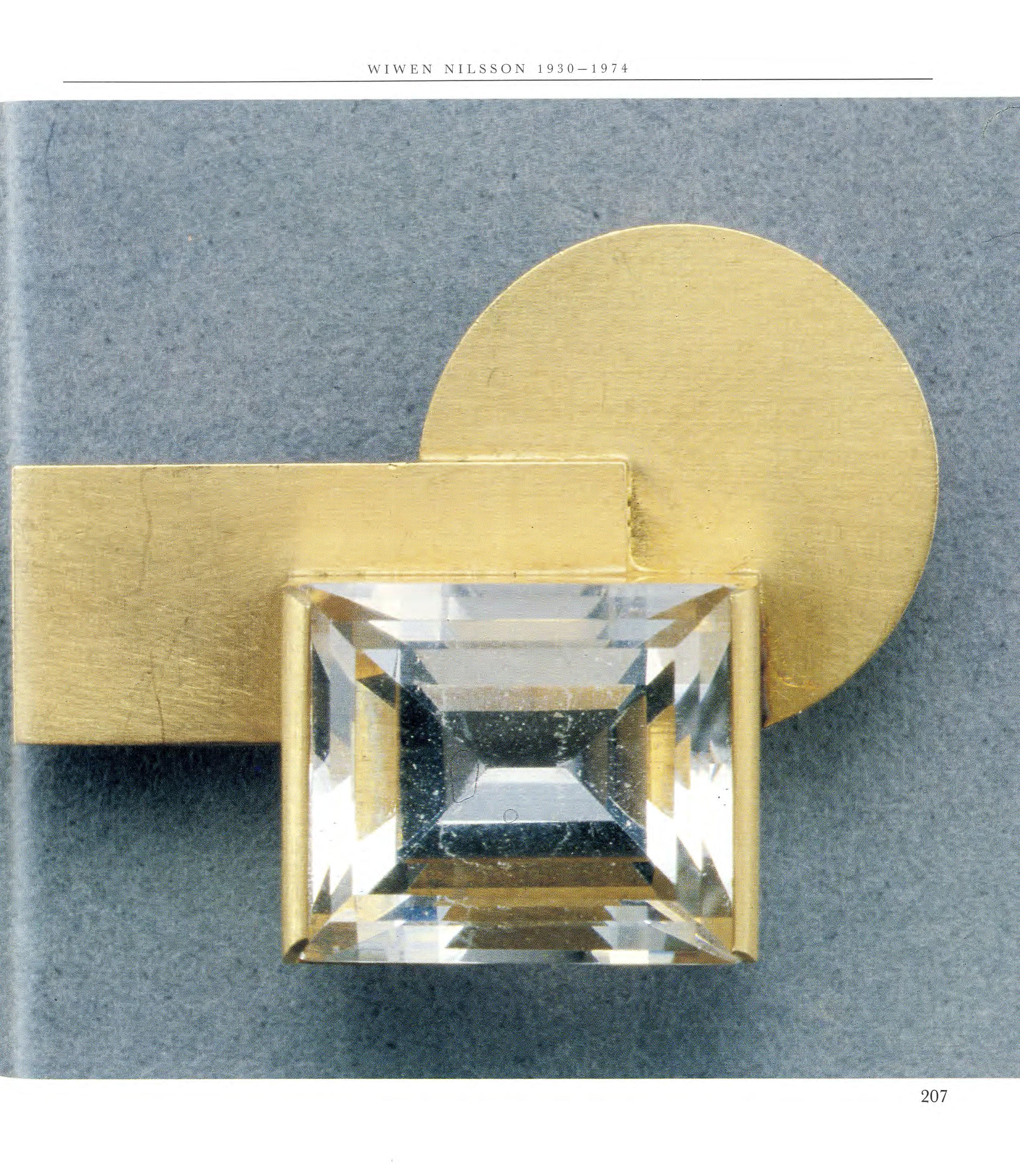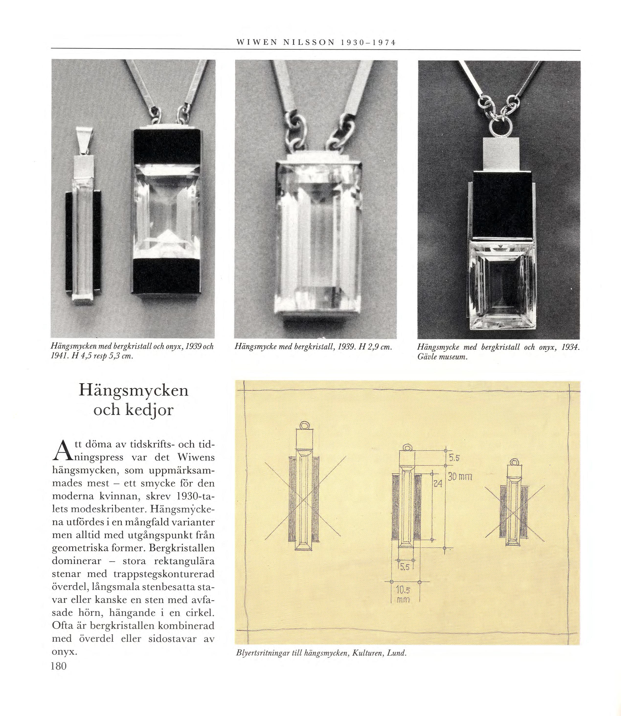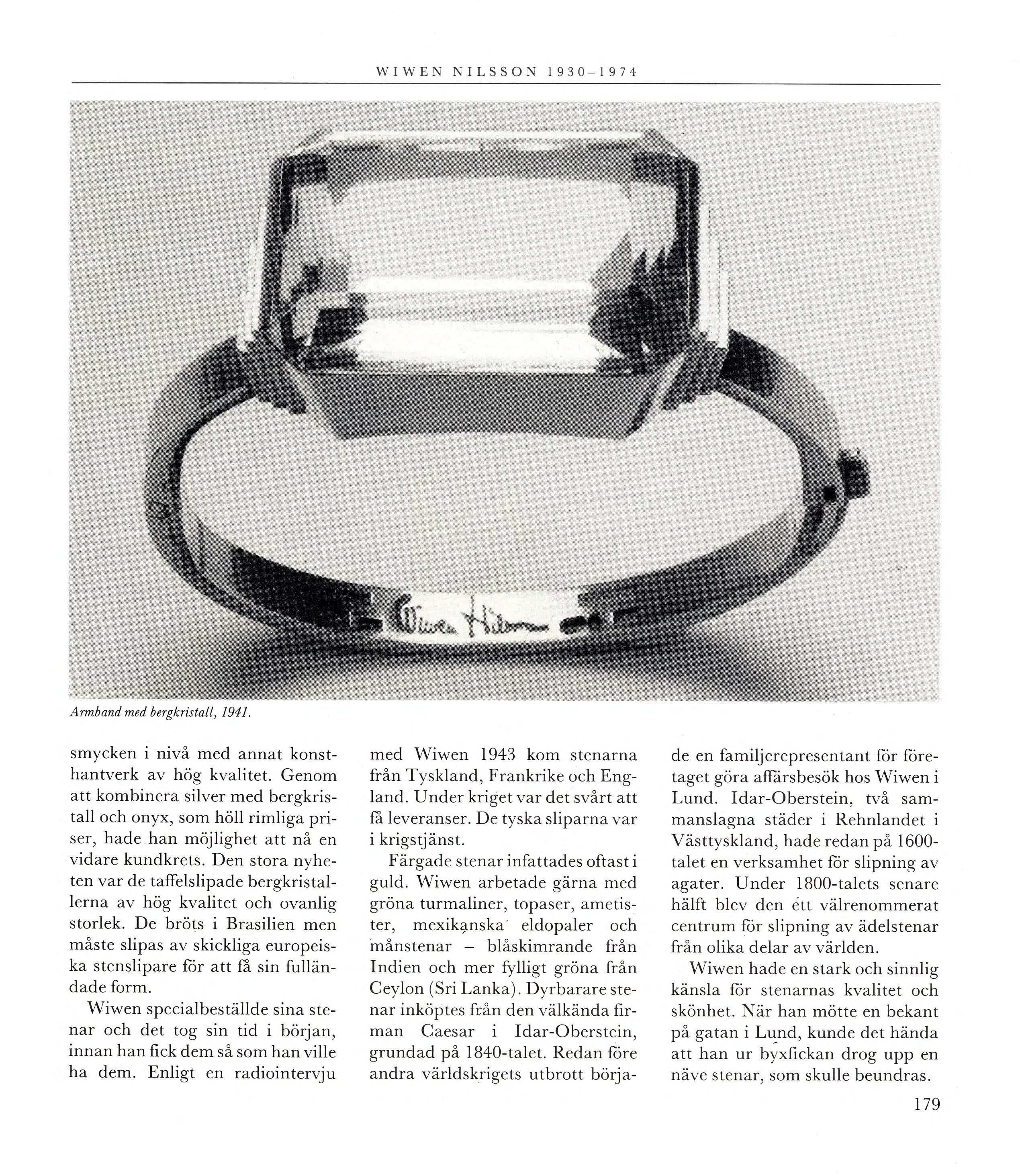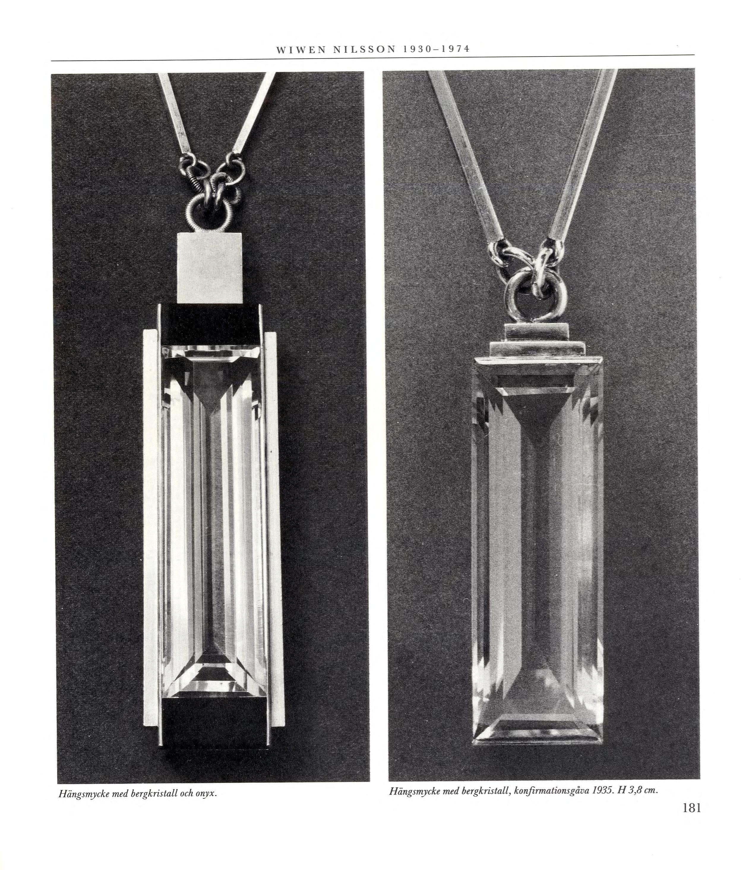 jewelry in Sweden to the level of other high-quality applied arts. He began producing jewelry around 1930. He often combined white stones with black onyx, which by itselfwas no novelty- often the exclusive jewelry companies in Paris used that color combination in their art deco jewelry. They however used expensive materials like platinum, white gold and diamonds which due to their price could only be small , while Nilsson on the other hand custom ordered very large, high quality, emerald cut rock crystals , which gave his jewelry a definite monumentality , and set the stones in silver, a com paratively inexpensive metal. This allowed him to reach a wider, more price-conscious public.