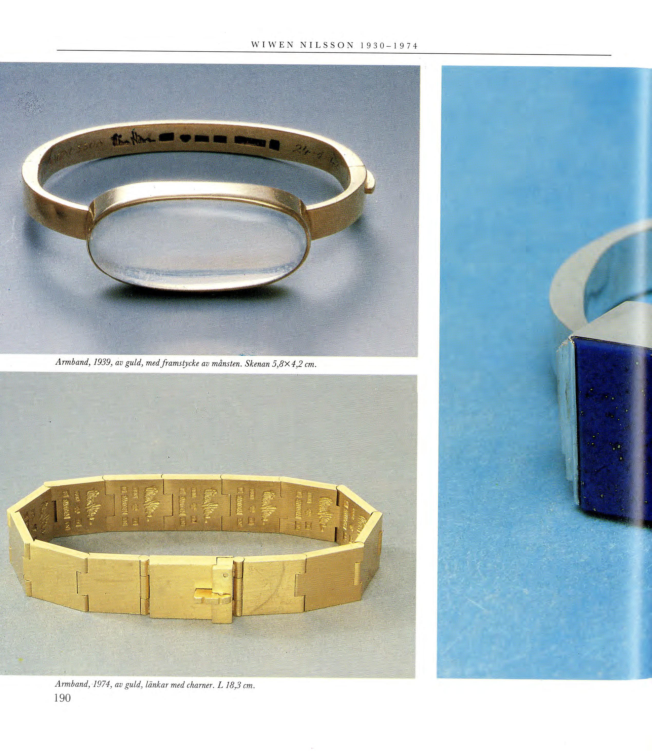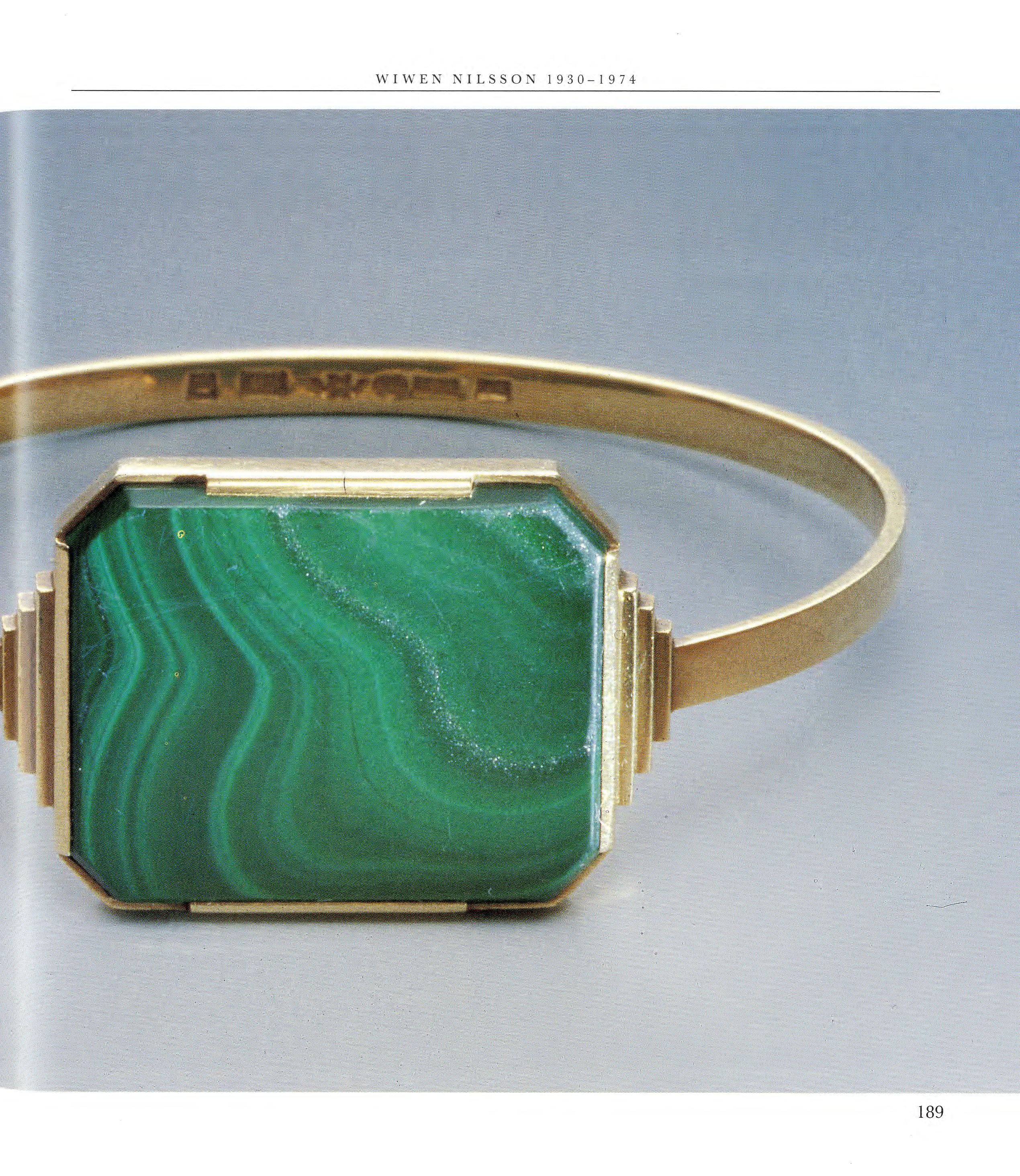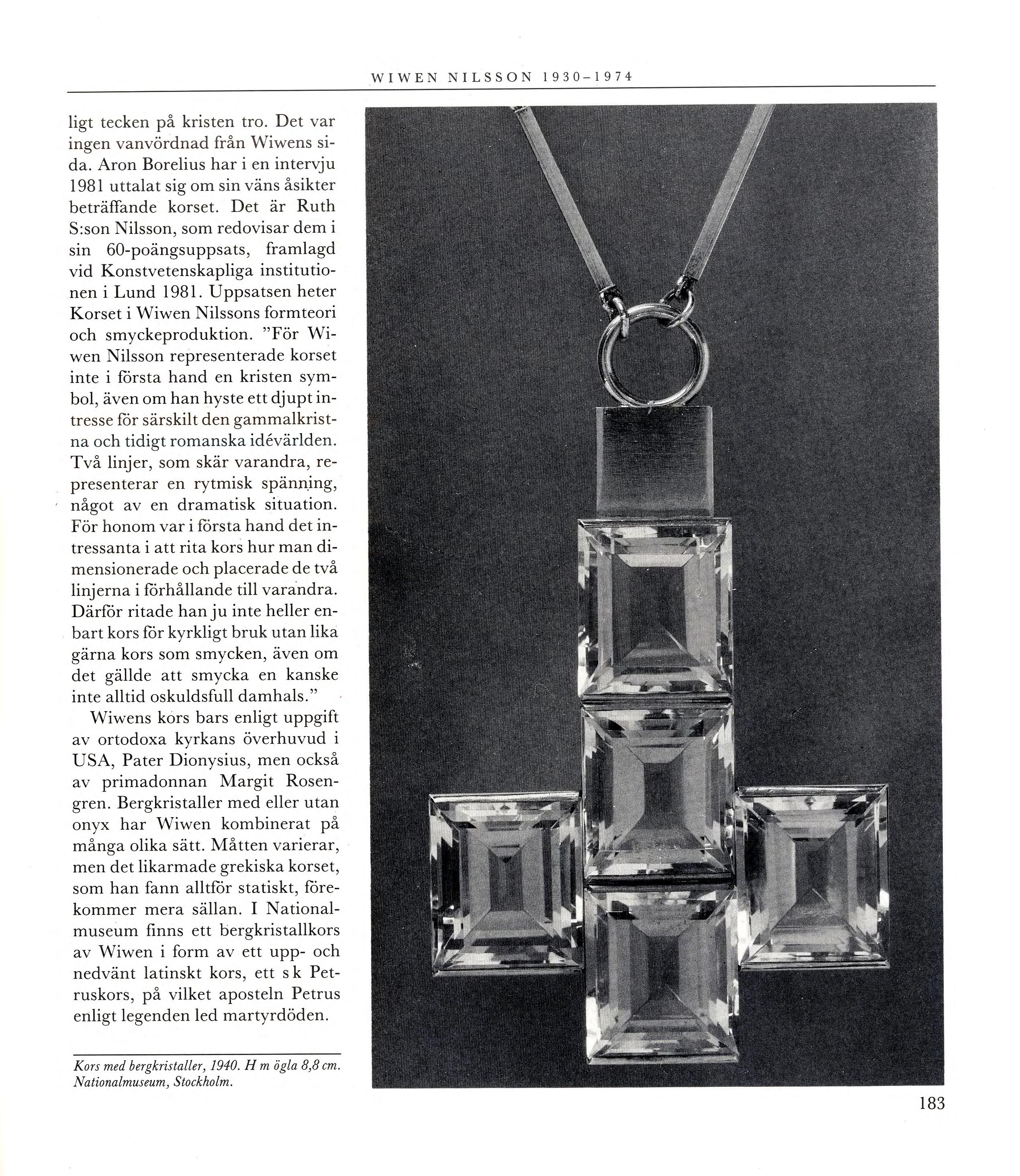 jewelry in Sweden to the level of other high-quality applied arts. He began producing jewelry around 1930. He often combined white stones with black onyx, which by itselfwas no novelty- often the exclusive jewelry companies in Paris used that color combination in their art deco jewelry. They however used expensive materials like platinum, white gold and diamonds which due to their price could only be small , while Nilsson on the other hand custom ordered very large, high quality, emerald cut rock crystals , which gave his jewelry a definite monumentality , and set the stones in silver, a com paratively inexpensive metal. This allowed him to reach a wider, more price-conscious public.