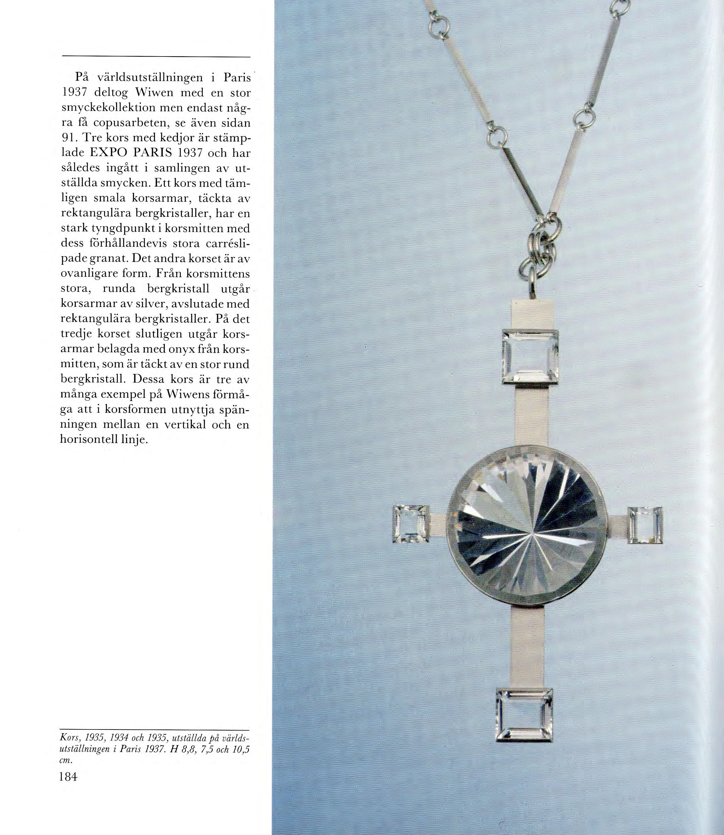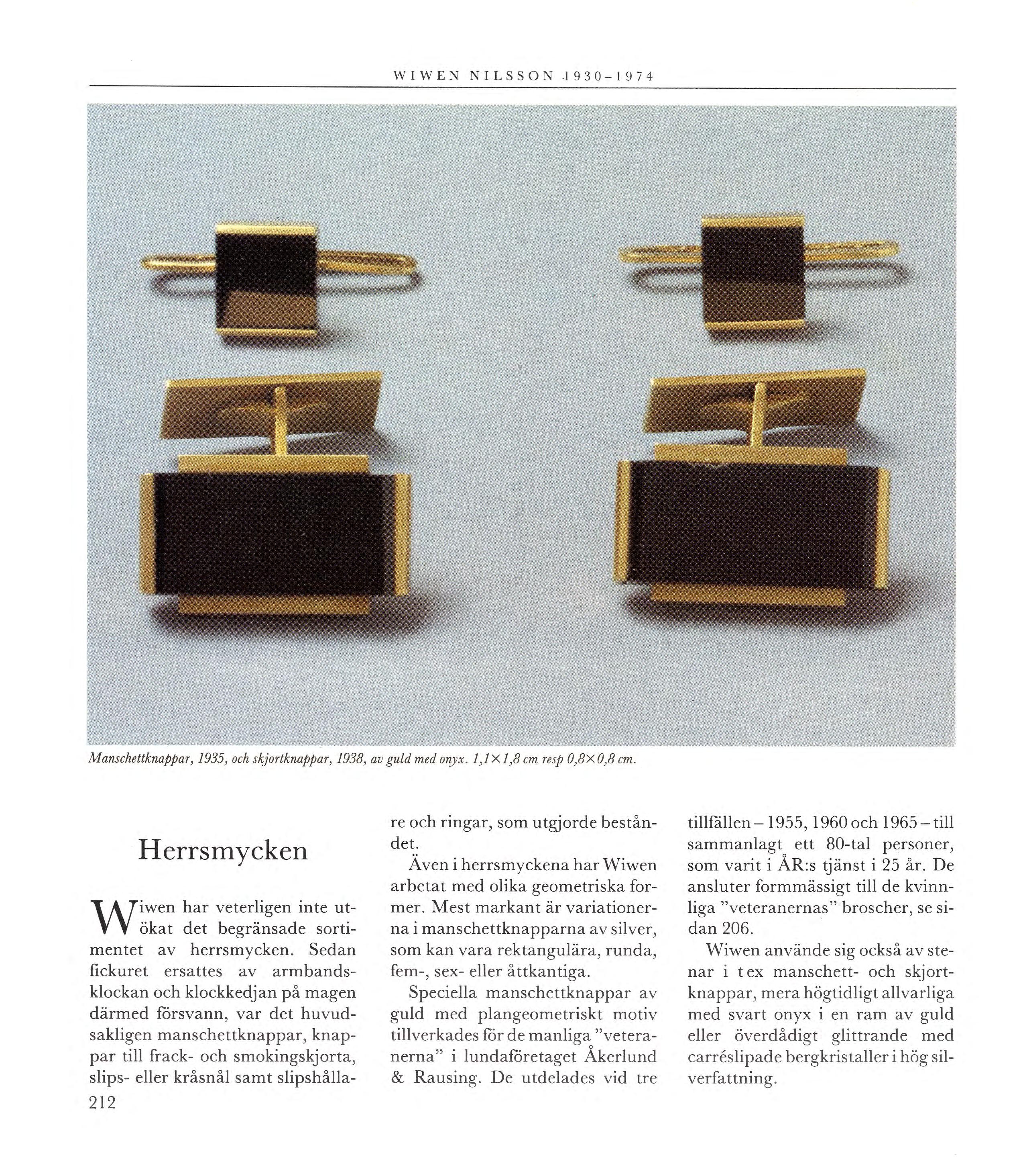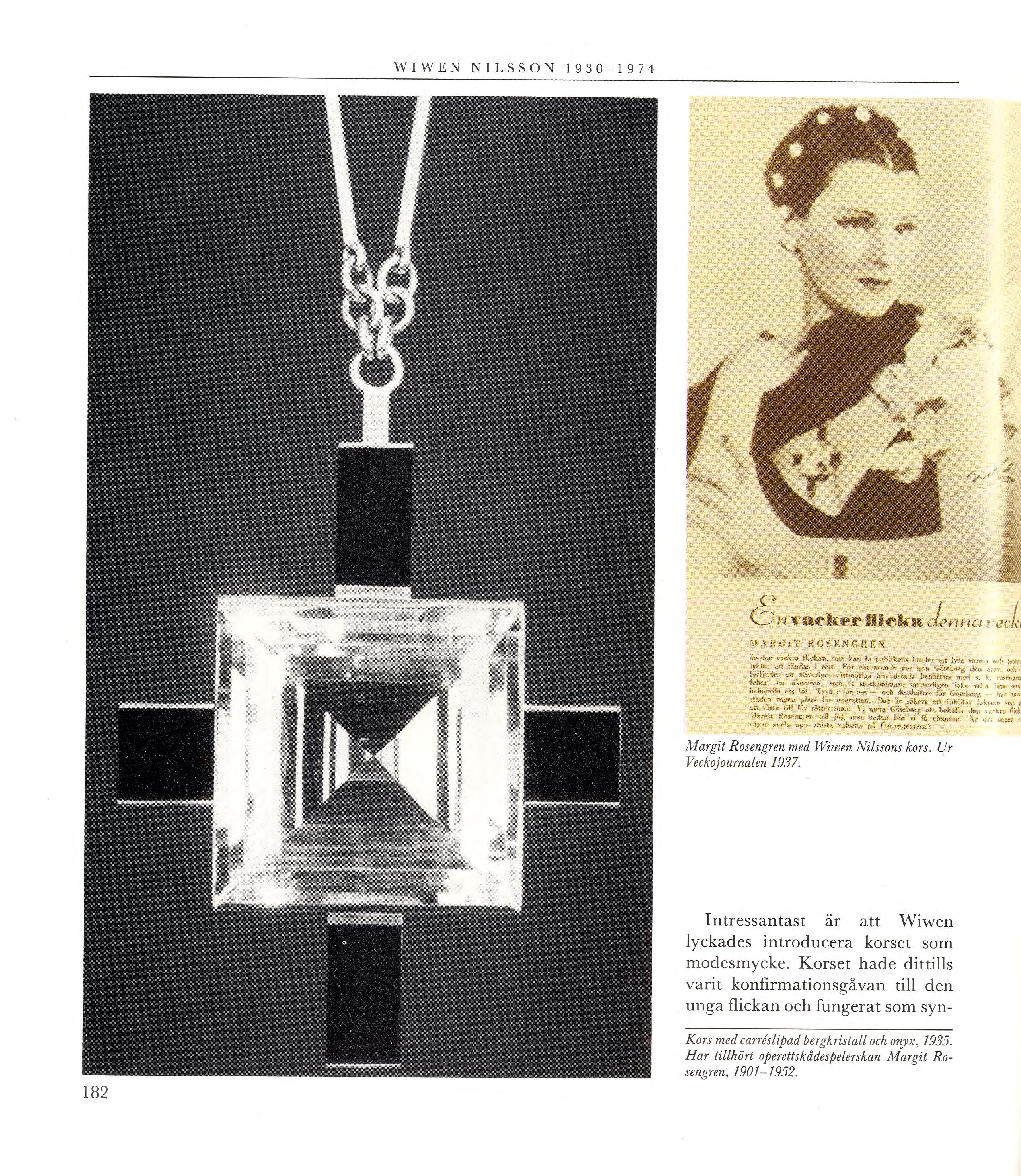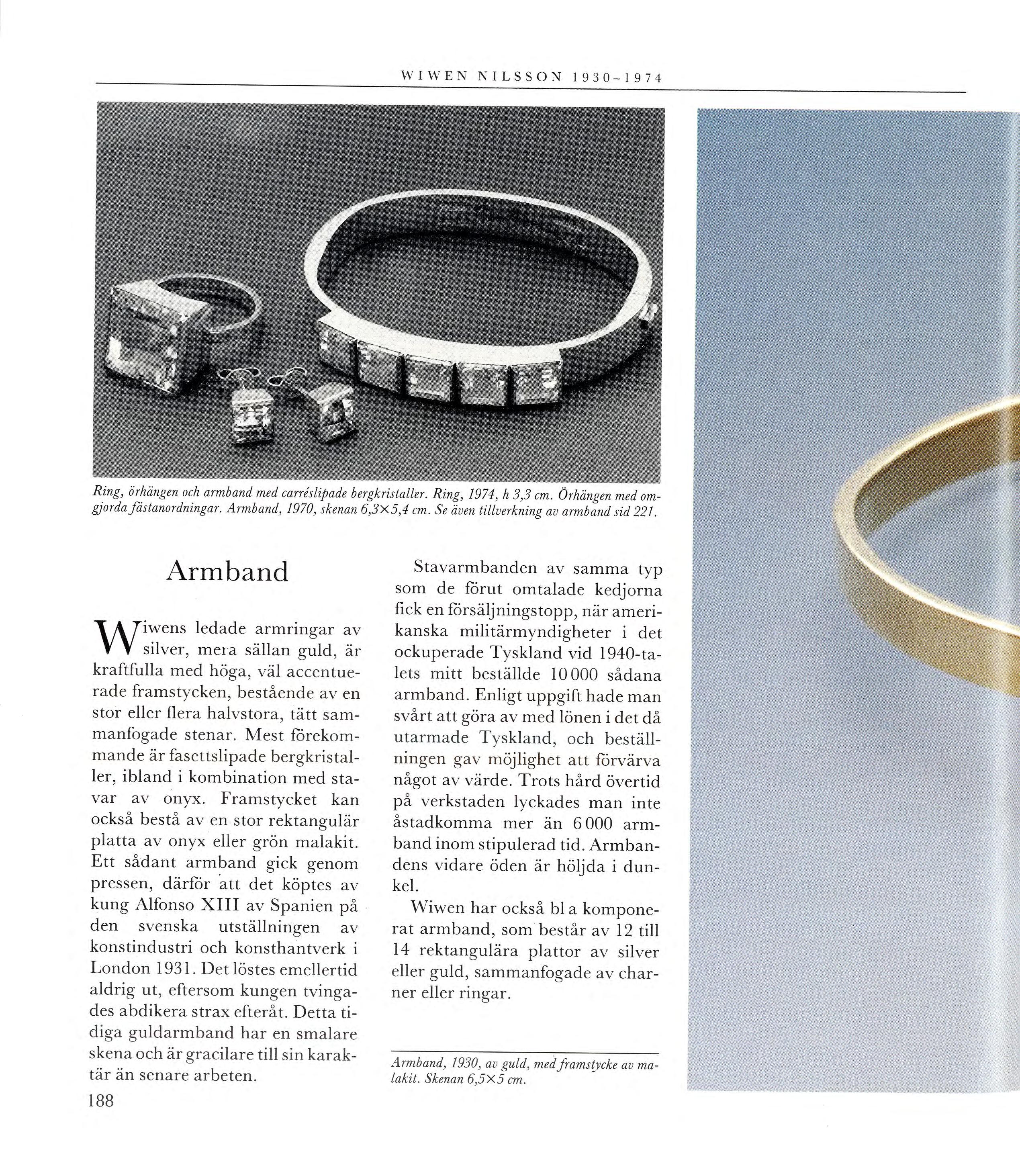 jewelry in Sweden to the level of other high-quality applied arts. He began producing jewelry around 1930. He often combined white stones with black onyx, which by itselfwas no novelty- often the exclusive jewelry companies in Paris used that color combination in their art deco jewelry. They however used expensive materials like platinum, white gold and diamonds which due to their price could only be small , while Nilsson on the other hand custom ordered very large, high quality, emerald cut rock crystals , which gave his jewelry a definite monumentality , and set the stones in silver, a com paratively inexpensive metal. This allowed him to reach a wider, more price-conscious public.