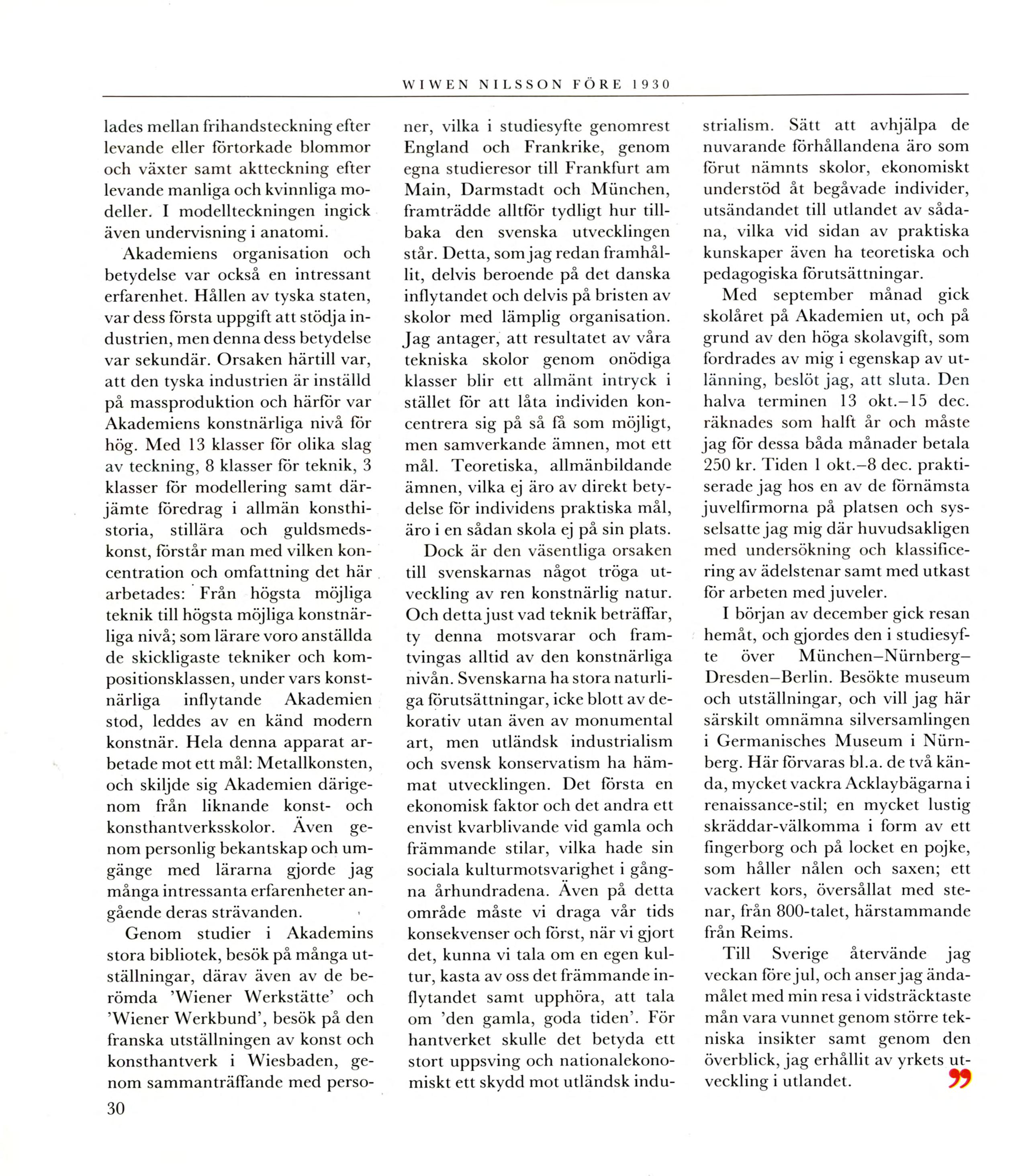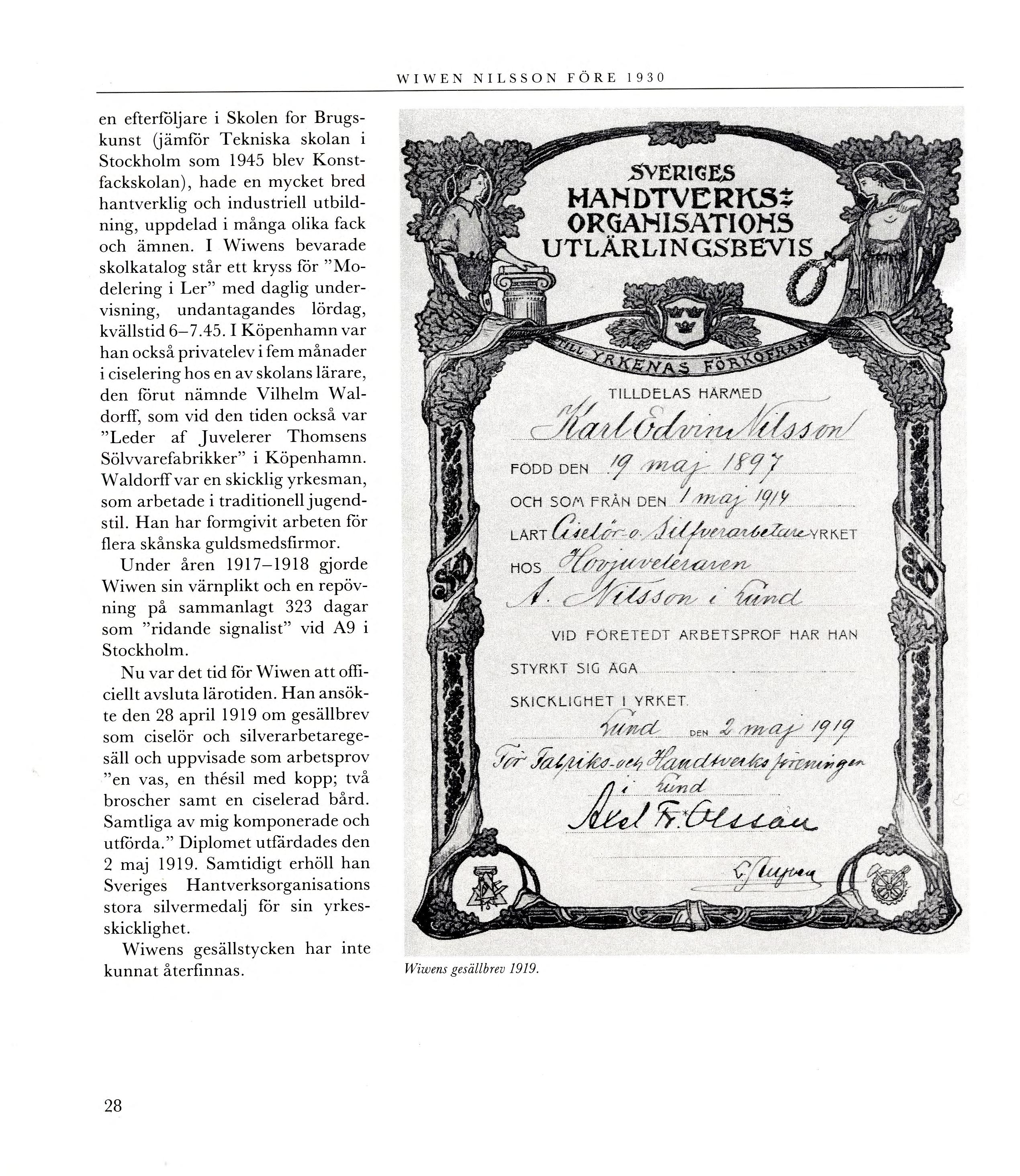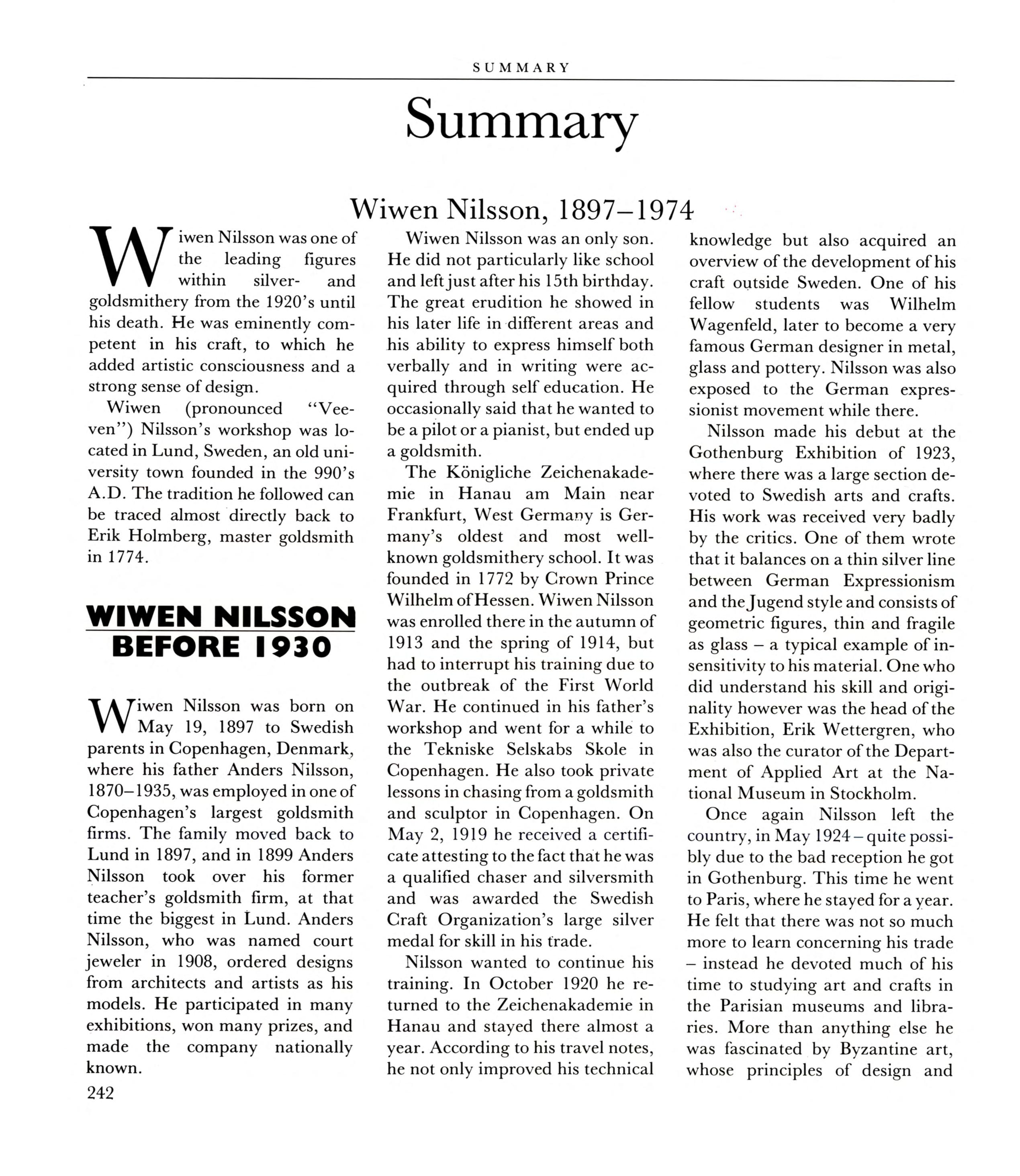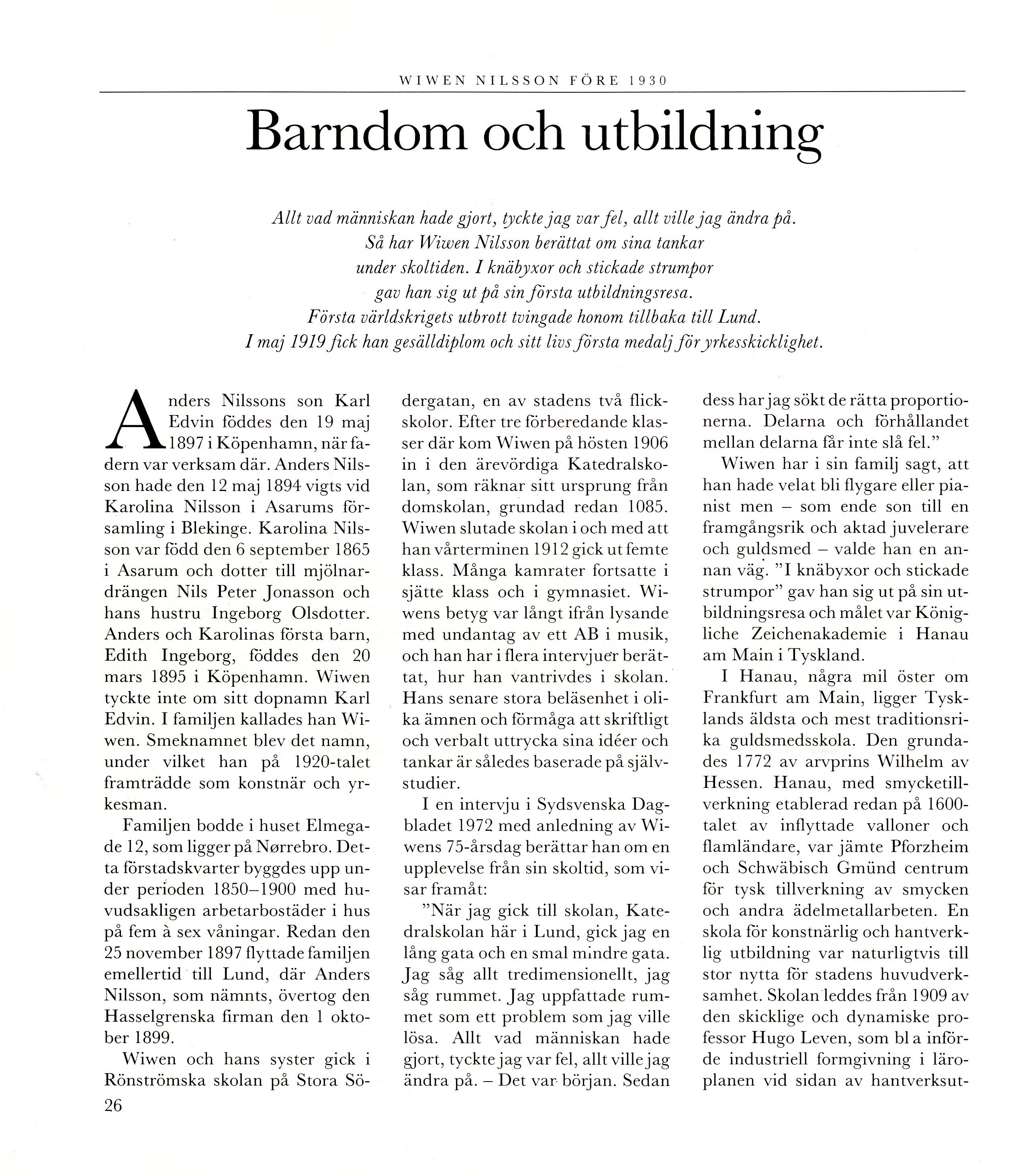 Wiwen Nilsson was an only son. He did not particularly lik e school an d leftjust after his 15th birthday . The great erudition he showed in his l ater life in different areas and bis ability to express himself both verbally and in writing were acquired through self education. He occasiona ll y said that he wanted to be a pilot or a pianist, but ended up a go ld smith.