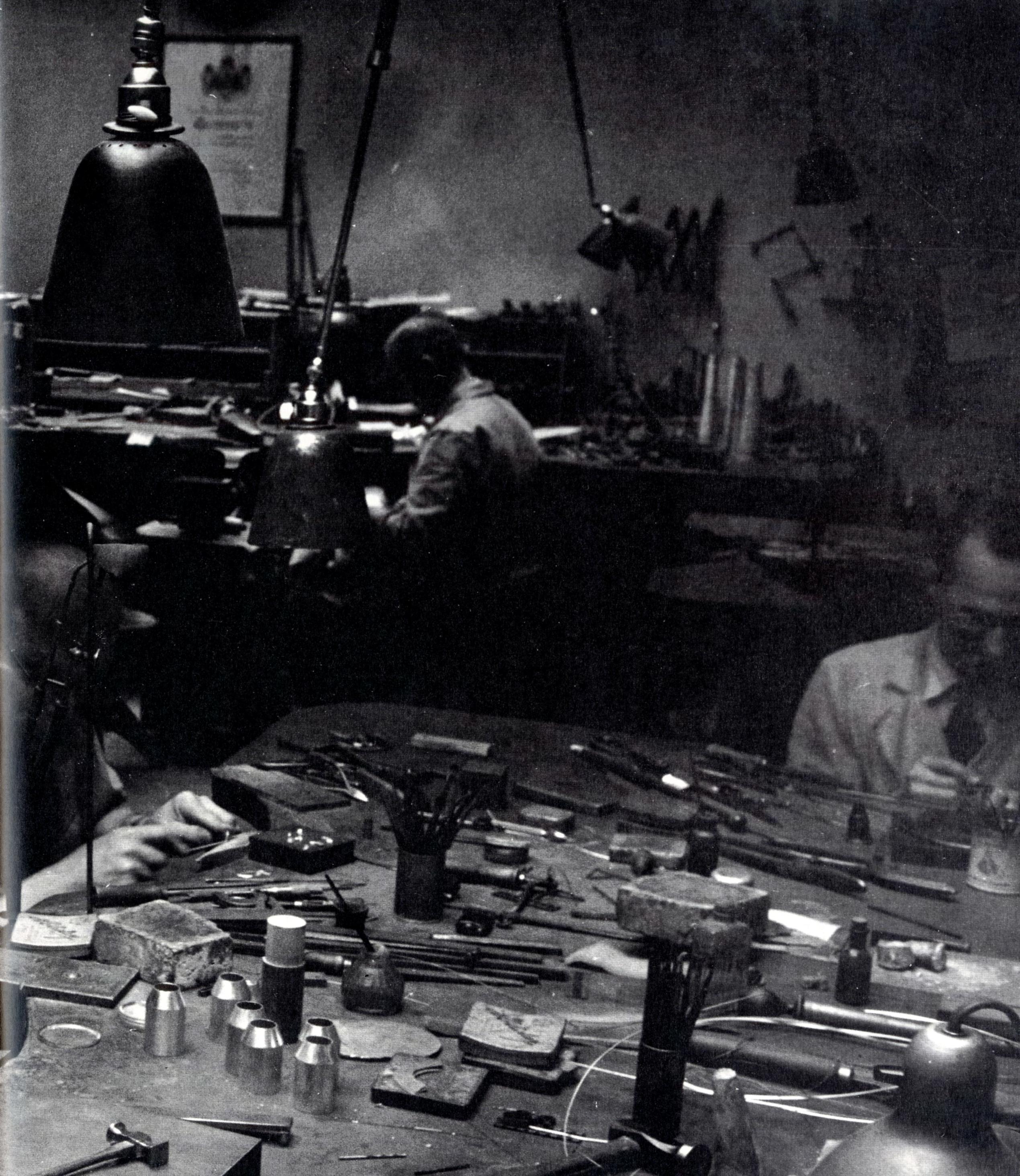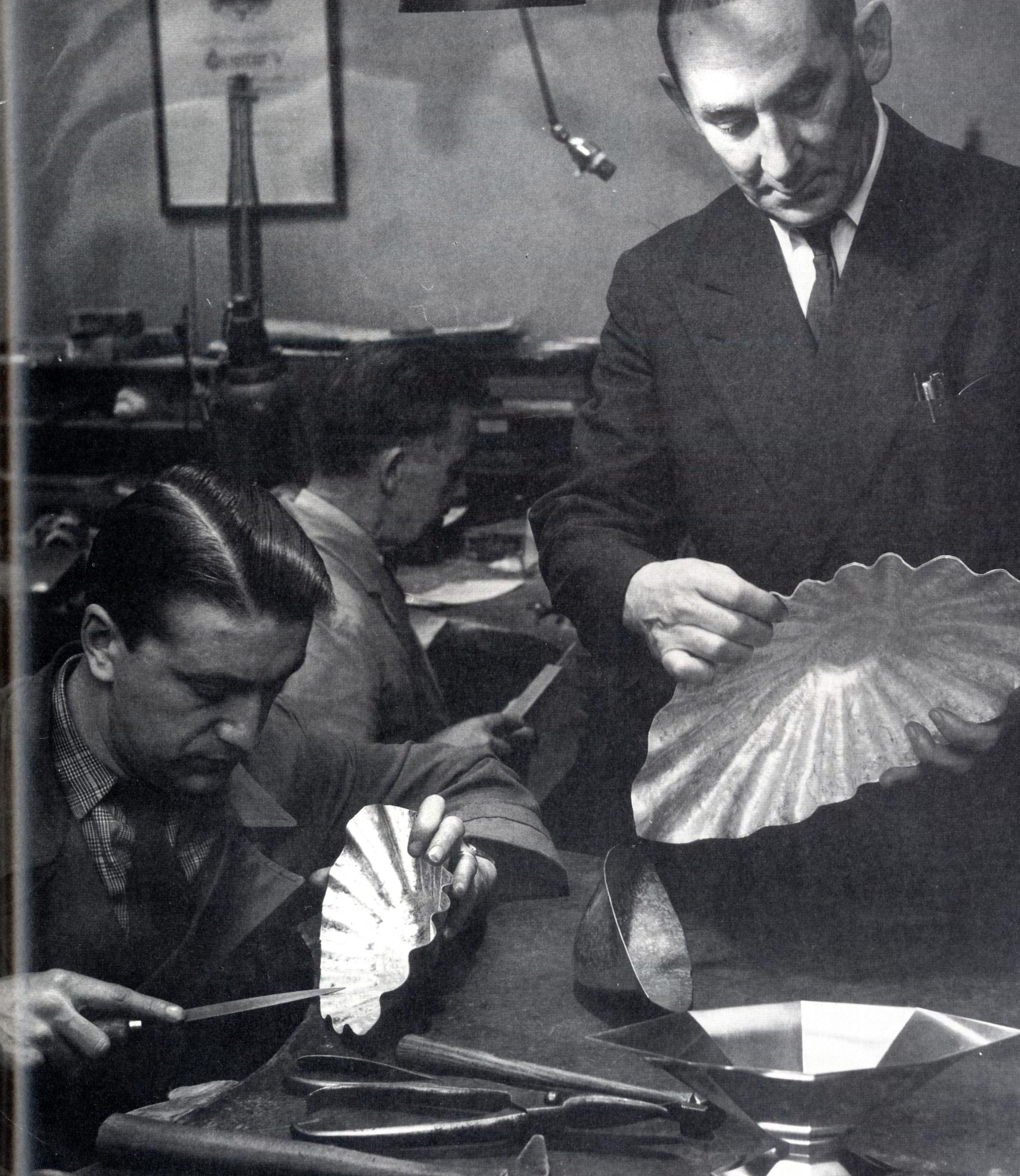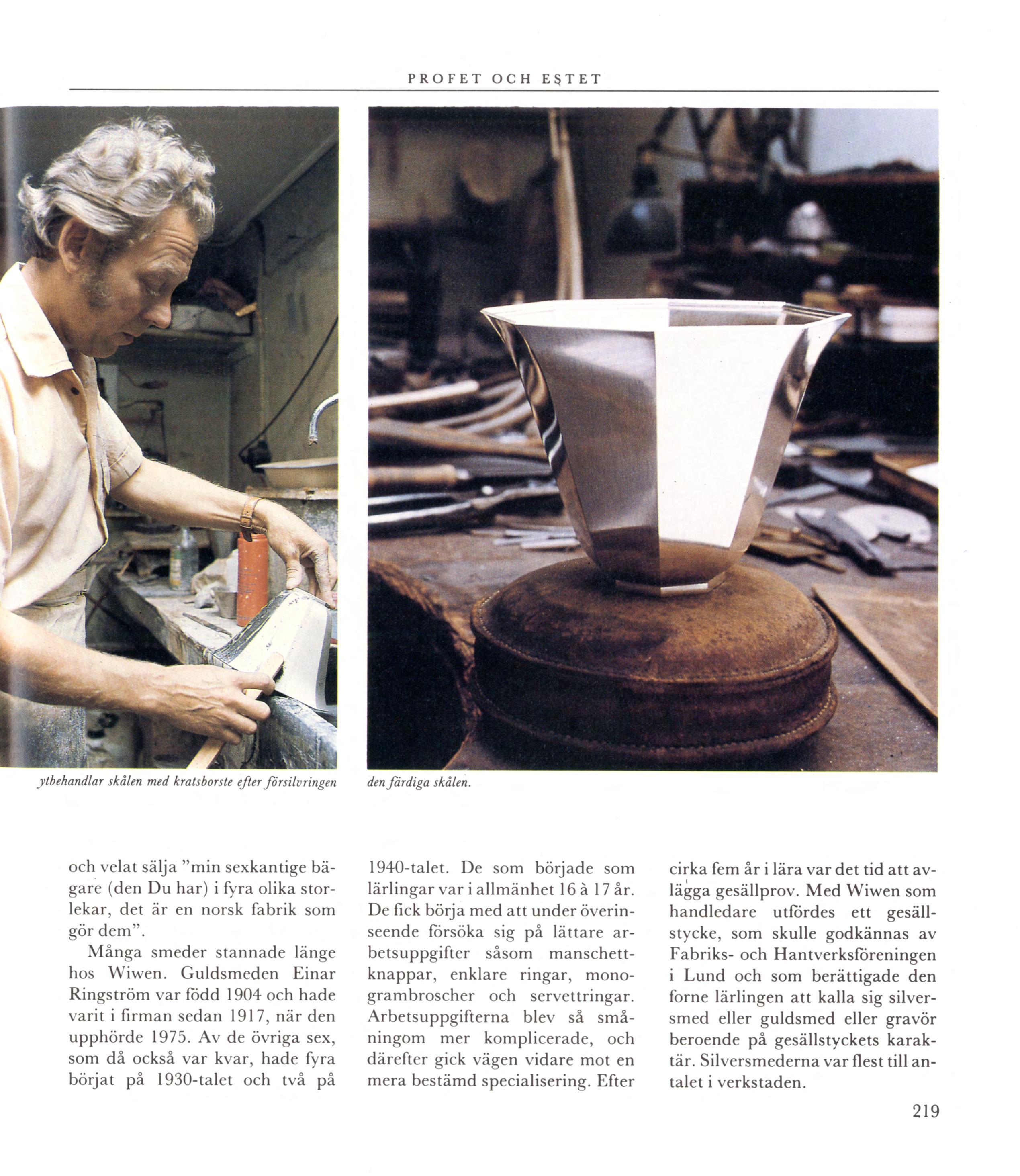Many people-up to 30-worked in Wiwen Nilsson's workshops: some were apprentices but most were craftsmen who had often specialized in tableware, silver ware or jewelry. Nilsson himself was employer, foreman and designer, which is an unusual combination. Production was completely by hand there were only three machines in the workshop , a drawbench , a lathe and a polishing machine . Usually Nilsson was in daily contact with his fellow workers. His excellent background as a craftsman allowed him to devise new methods and through discussions, solve problems concerning them . In that way the road between idea and product was short. This combination of skilled craftsmanship and sense of design
