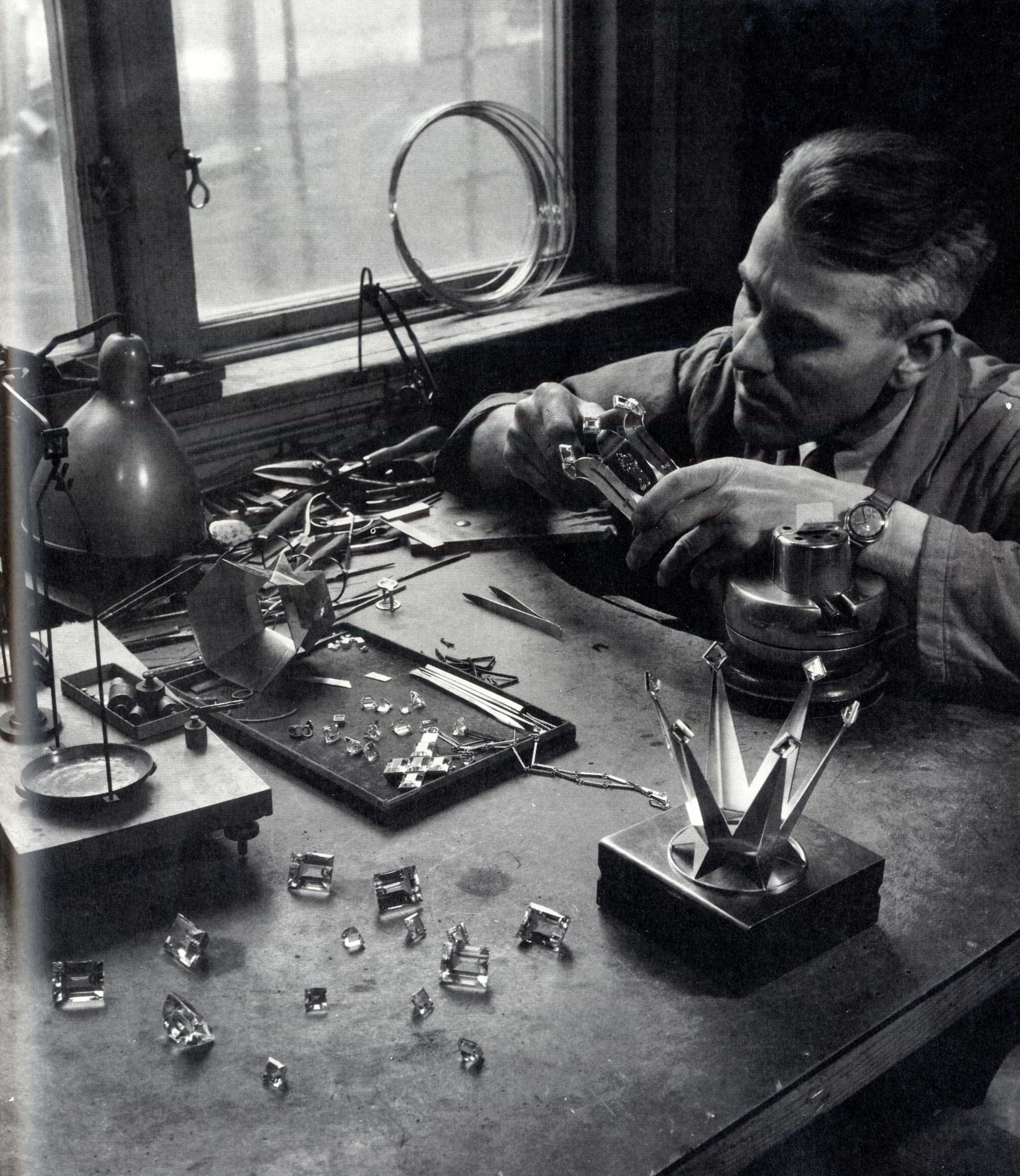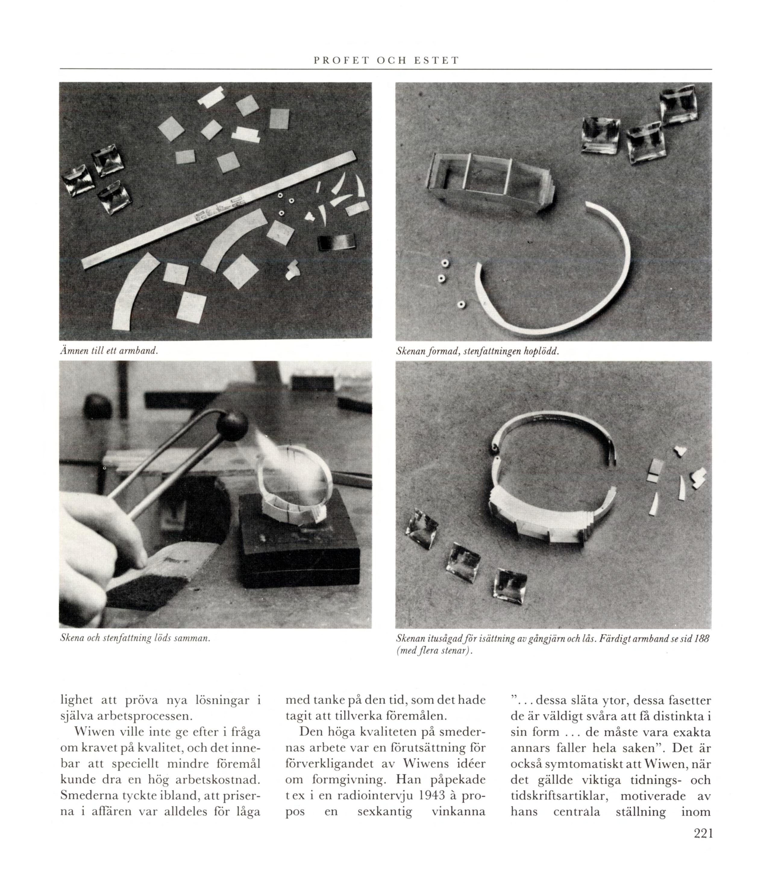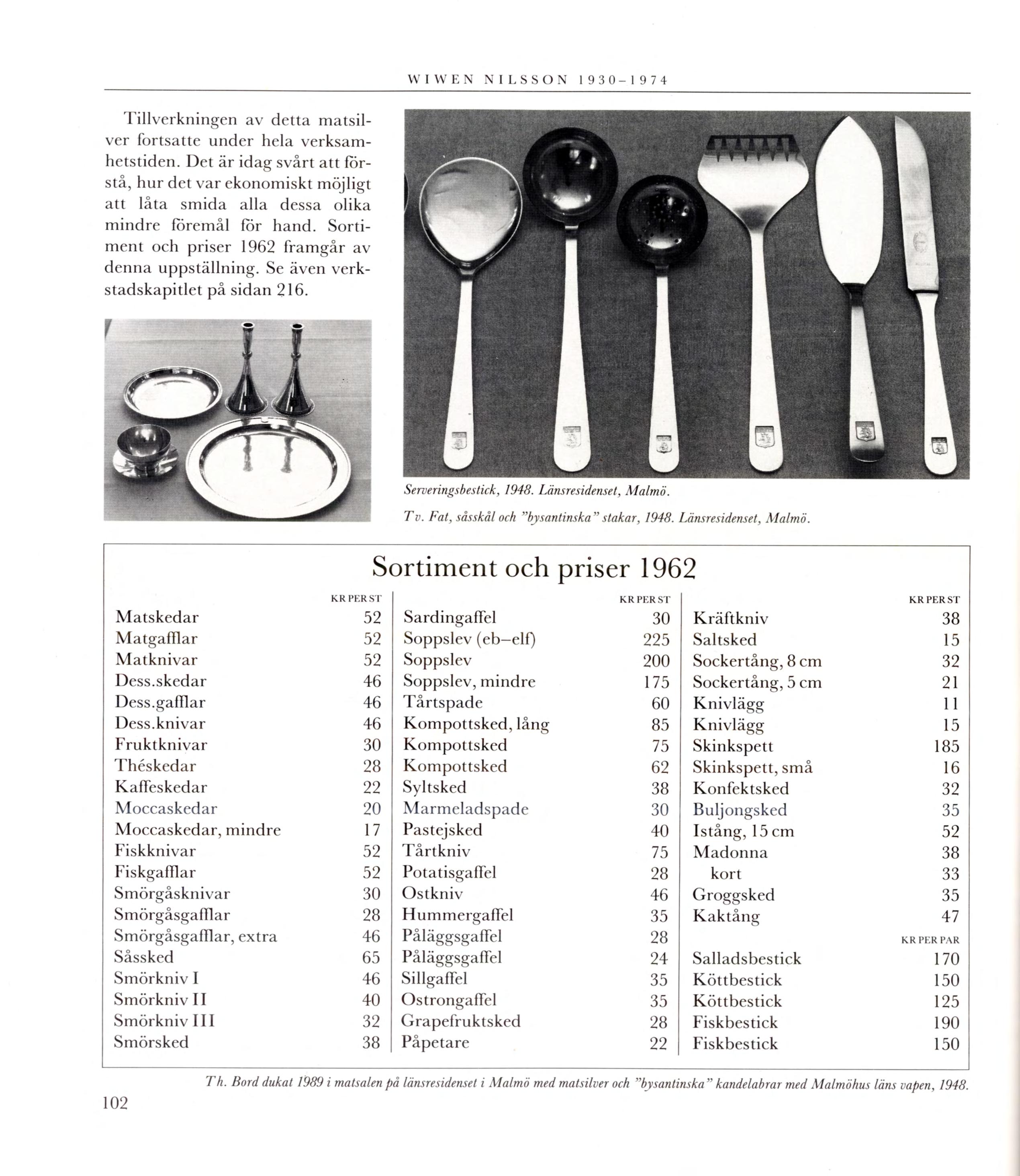 Many people-up to 30-worked in Wiwen Nilsson's workshops: some were apprentices but most were craftsmen who had often specialized in tableware, silver ware or jewelry. Nilsson himself was employer, foreman and designer, which is an unusual combination. Production was completely by hand there were only three machines in the workshop , a drawbench , a lathe and a polishing machine . Usually Nilsson was in daily contact with his fellow workers. His excellent background as a craftsman allowed him to devise new methods and through discussions, solve problems concerning them . In that way the road between idea and product was short. This combination of skilled craftsmanship and sense of design