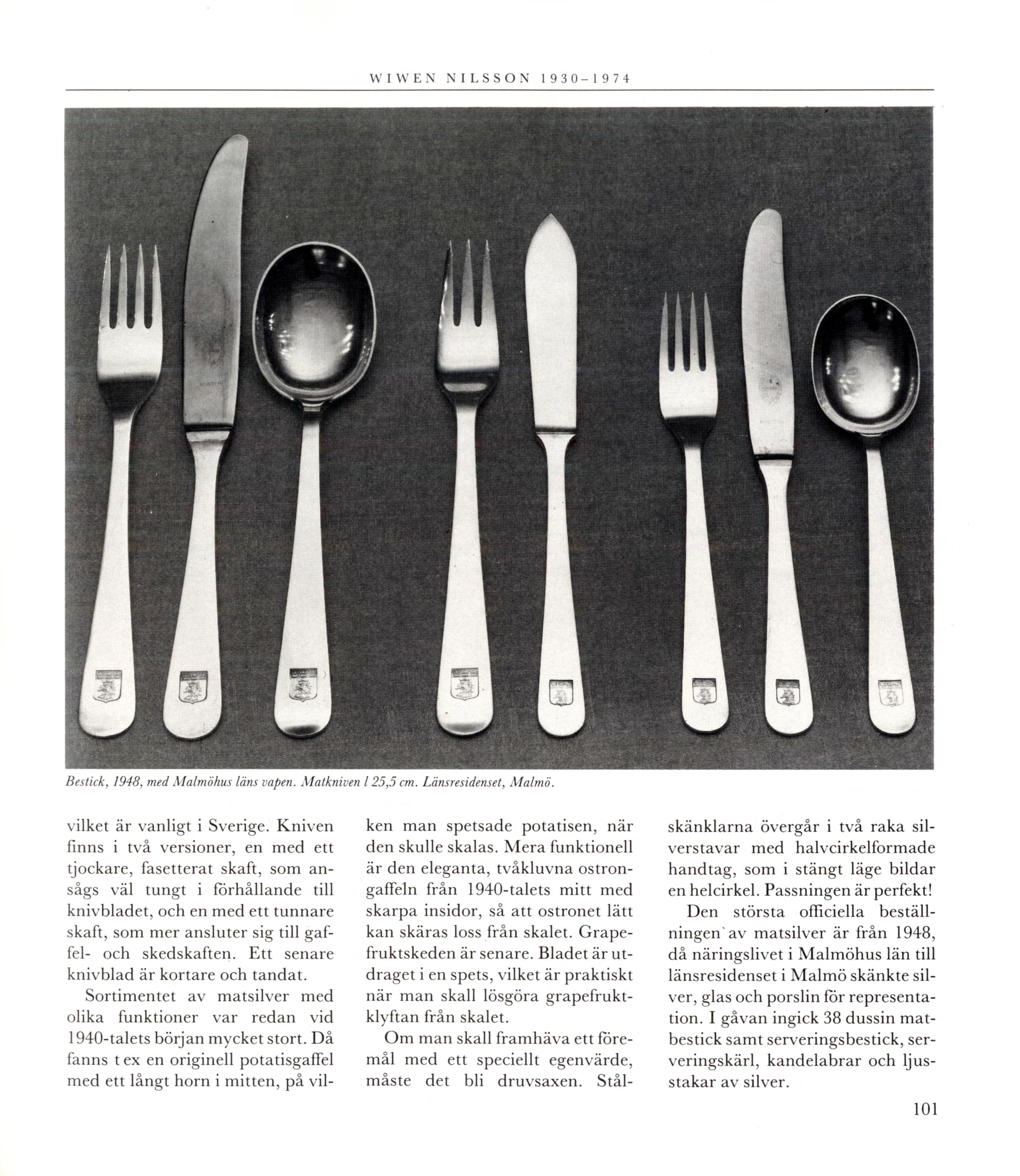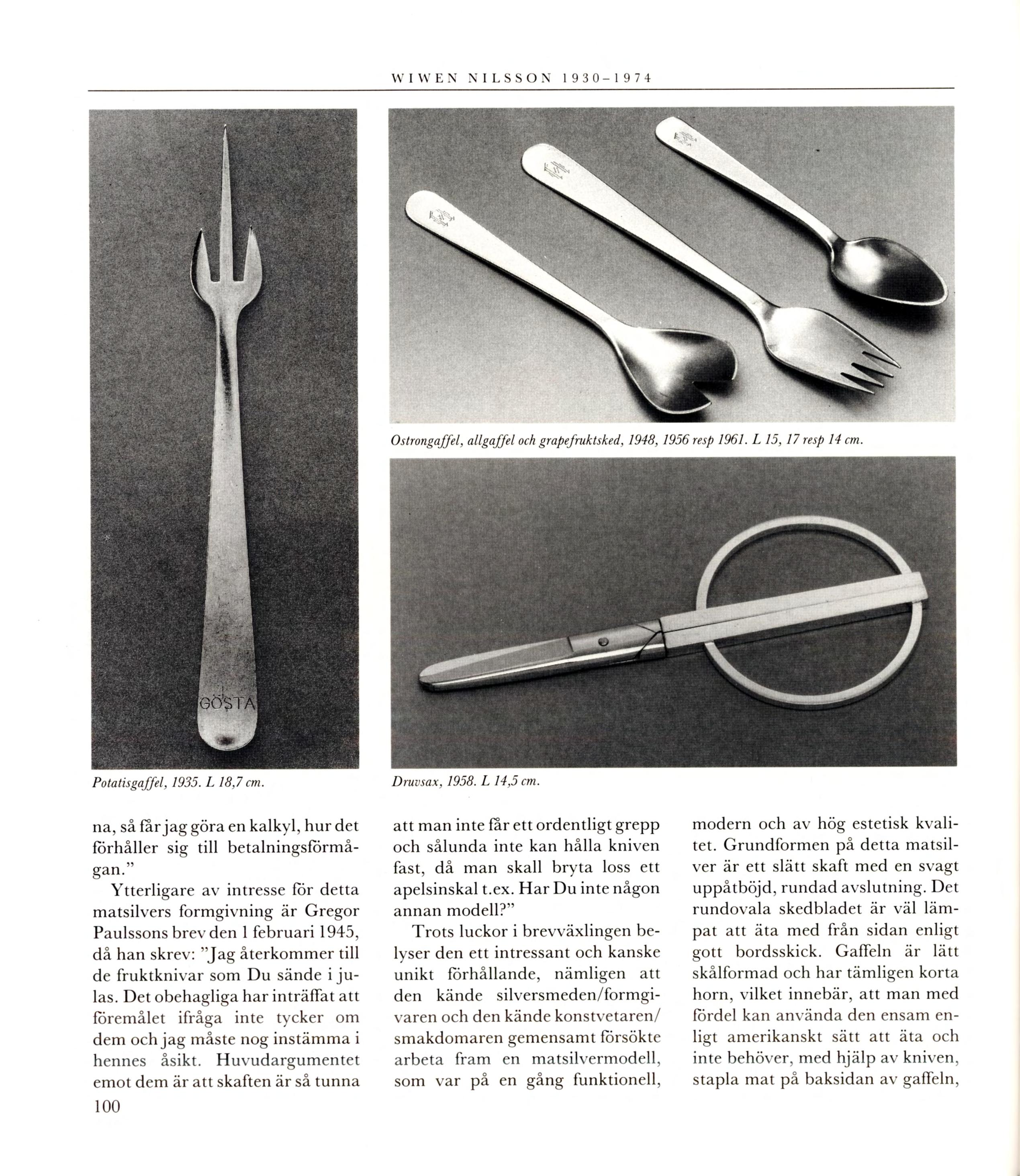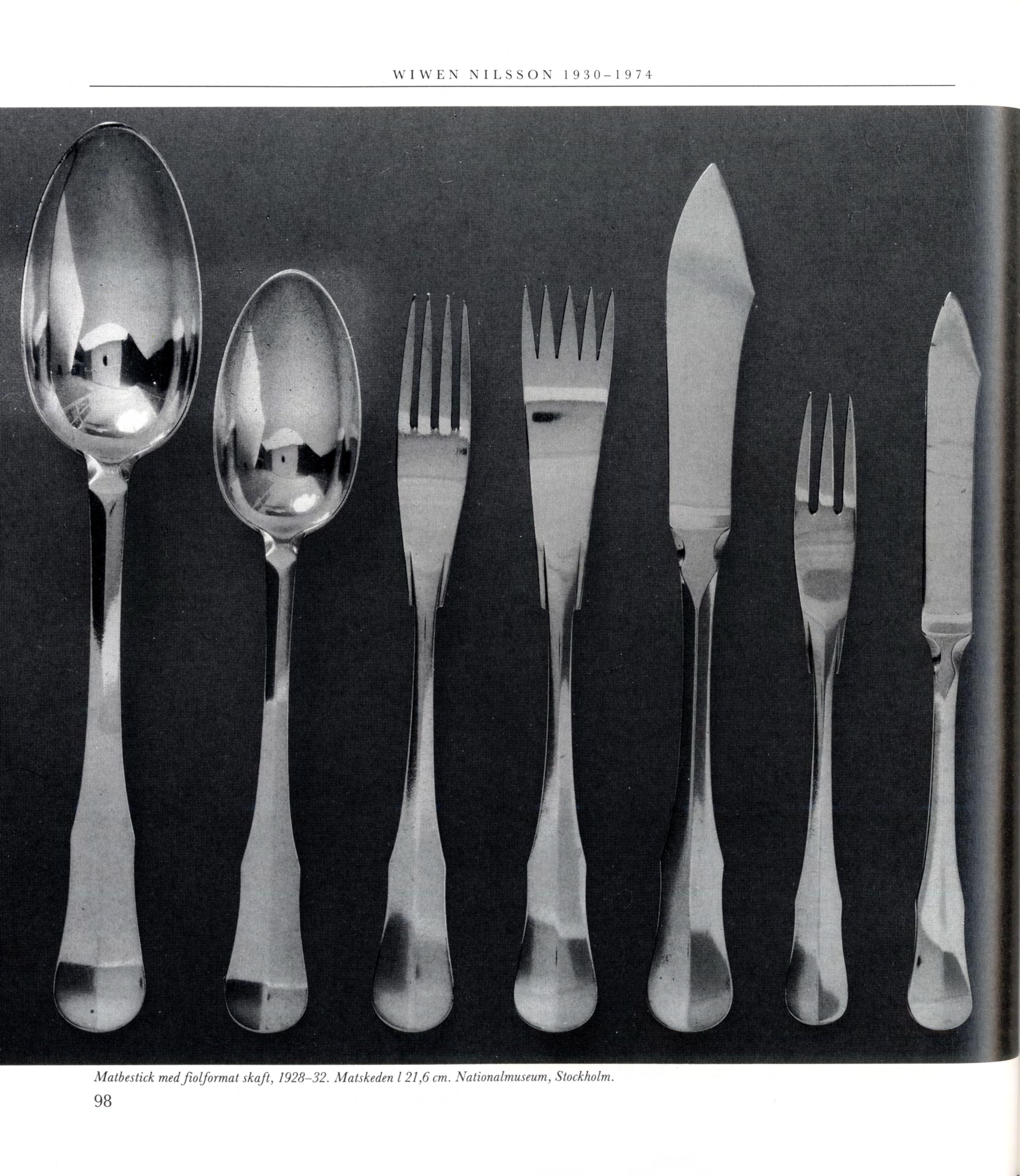 In the beginning of the l 930's Nilsson created a functionalistic silverware table service, to which he added more and more different kinds for example, an byster fork with sharp tines for easily slicing the oyster from its shell, and a grapefruit spoon with an exaggeratedly pointed tip. All the silverware was handmade, practically an economic impossibility today.