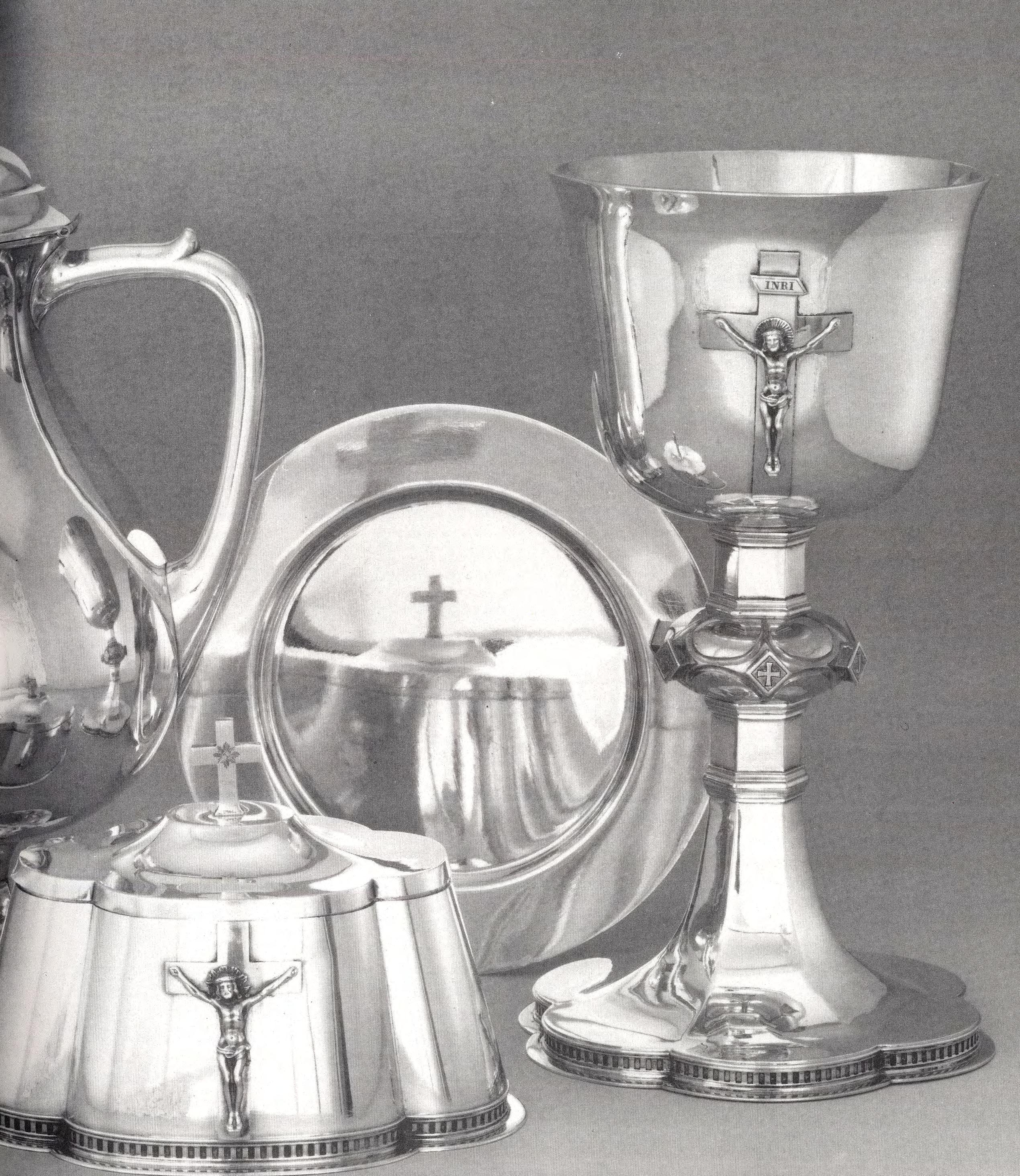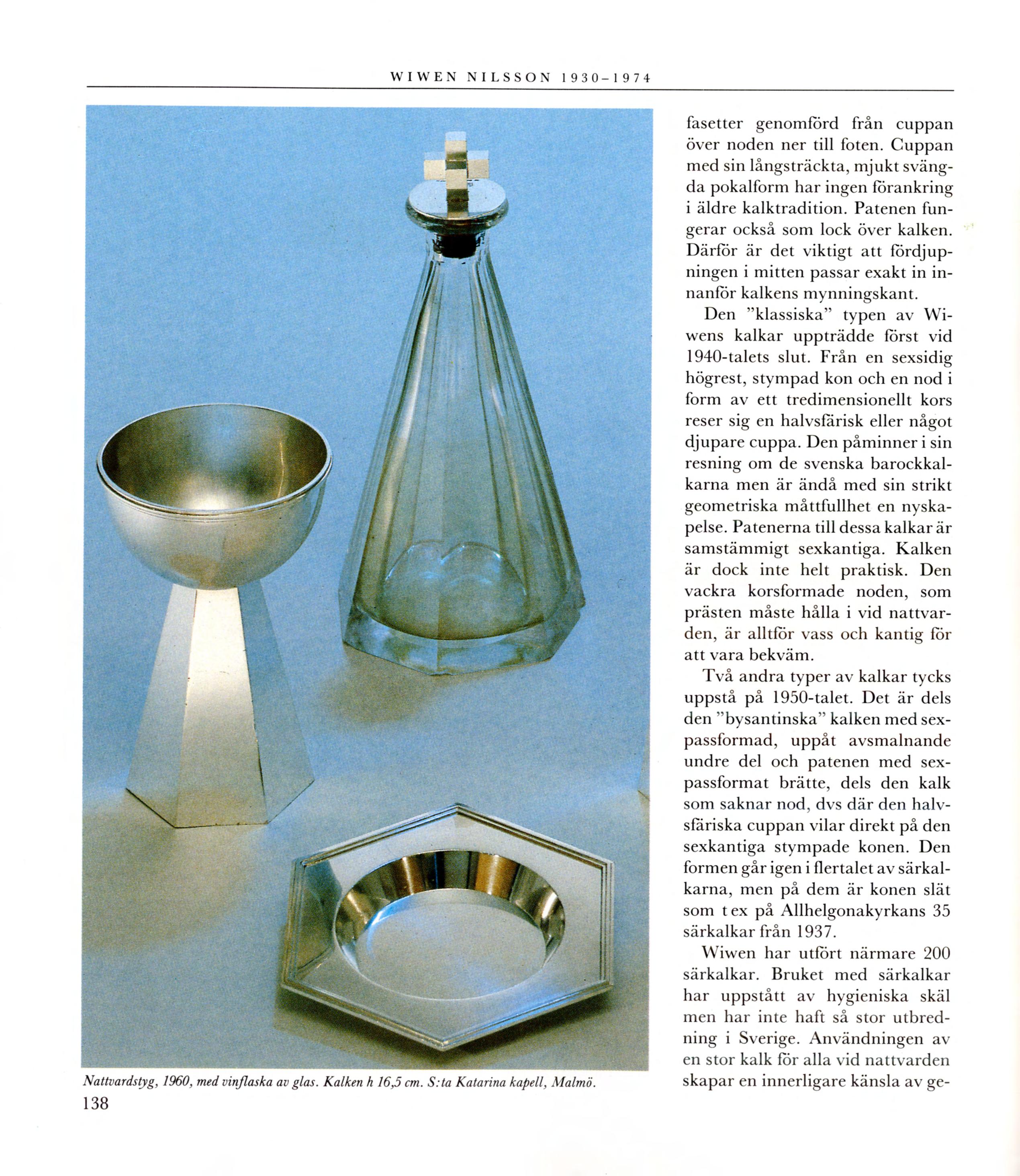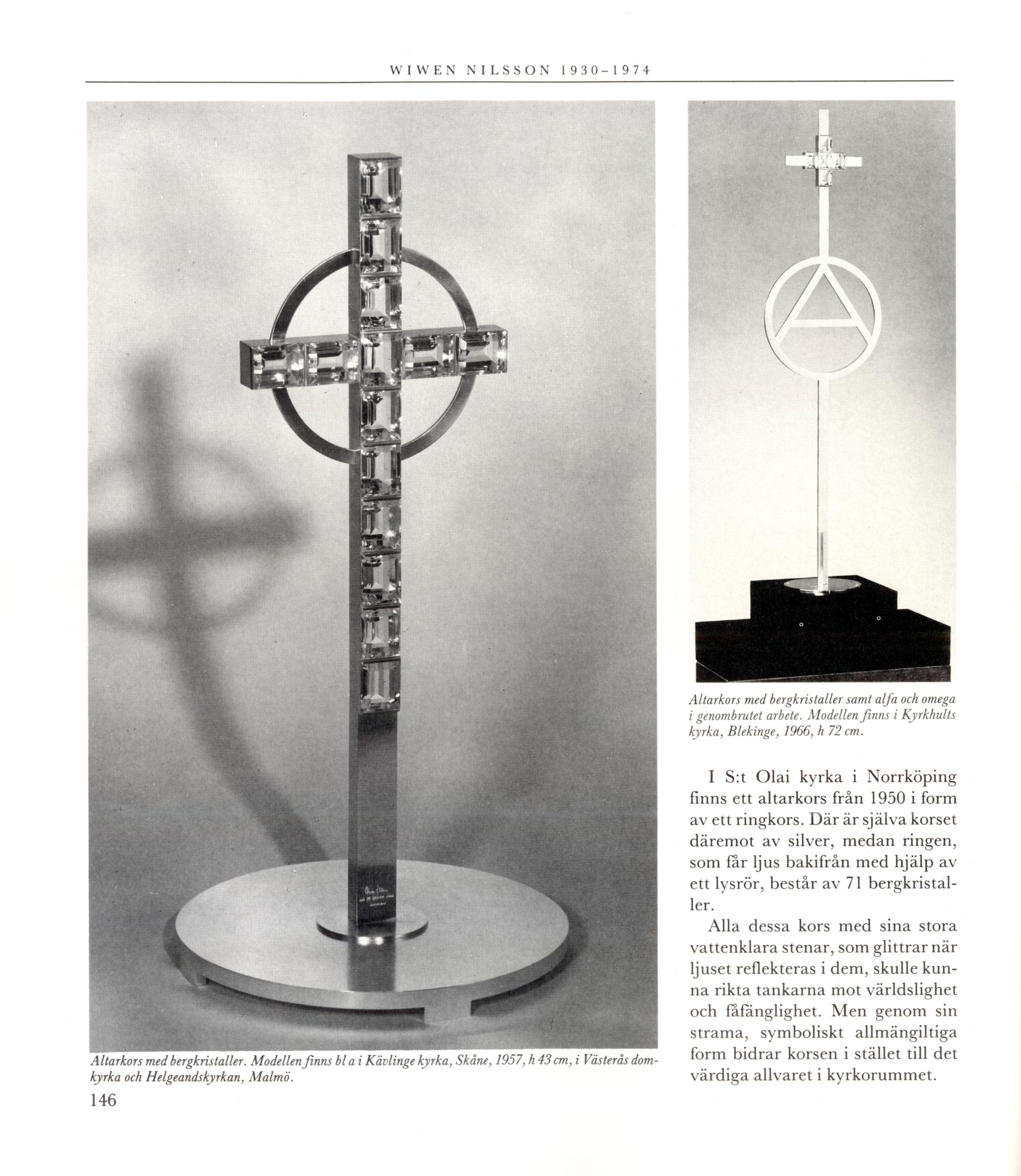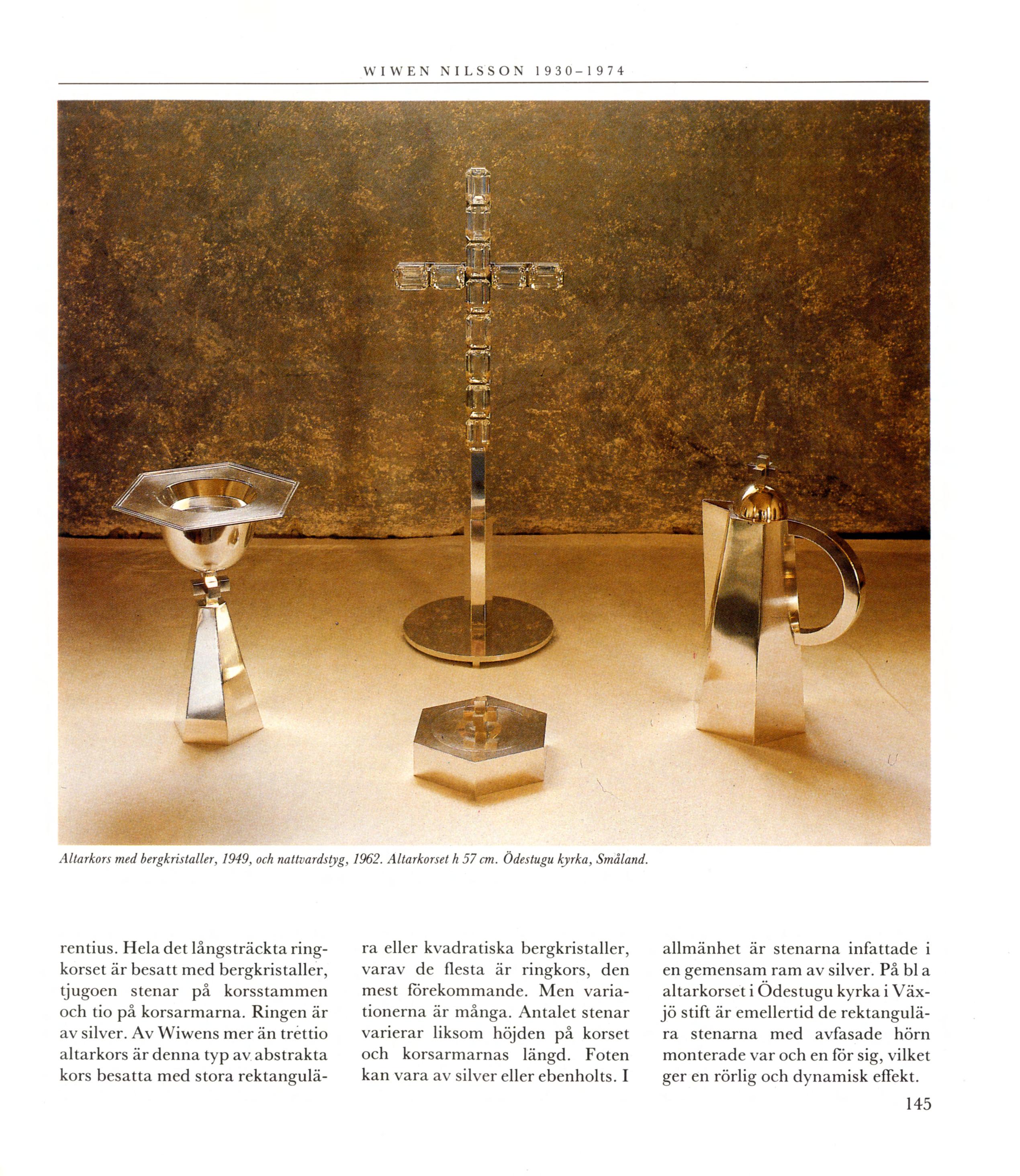 The church silver was designed with the same stringent, geometric forms as the secular silver. It gives a serious, often monumental impression, which is not unexpected considering the solemnity of church. His originality is particularl y seen in his altar crosses. Nilsson was against portraying Christ on the cross. All but one of his crosses ( the one in Lund Cathedral, modeled on a 12th century cross) are non-figurative. Some of them have five facetted stones symbolizing Christ's five wounds. Most of the crosses are made of very large, facetted, rectangular rock crystals, which allow the light to pass through and glitter impressively.