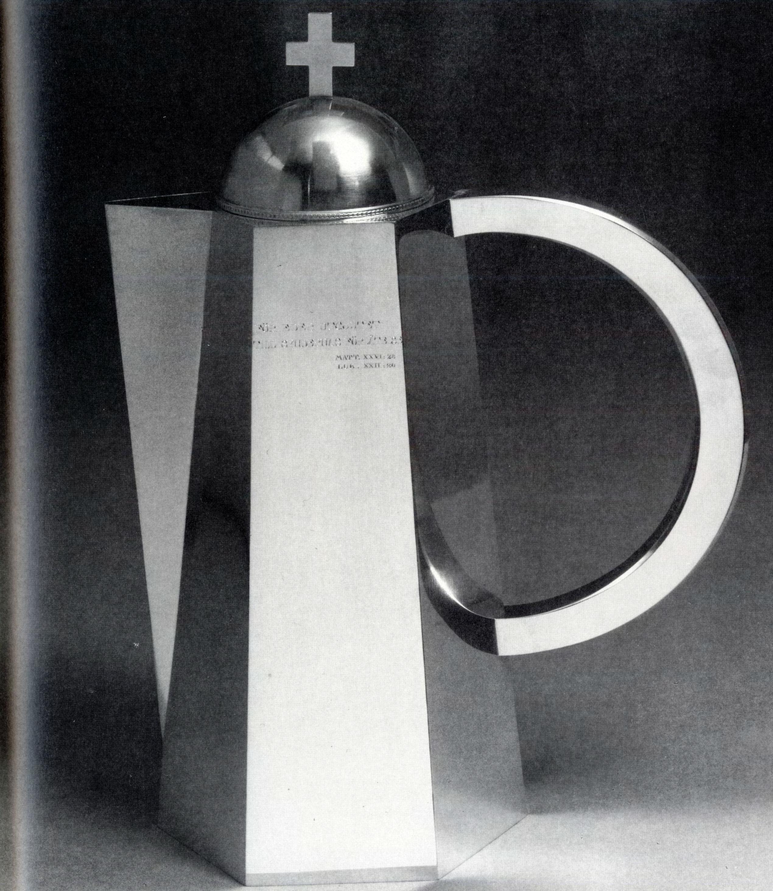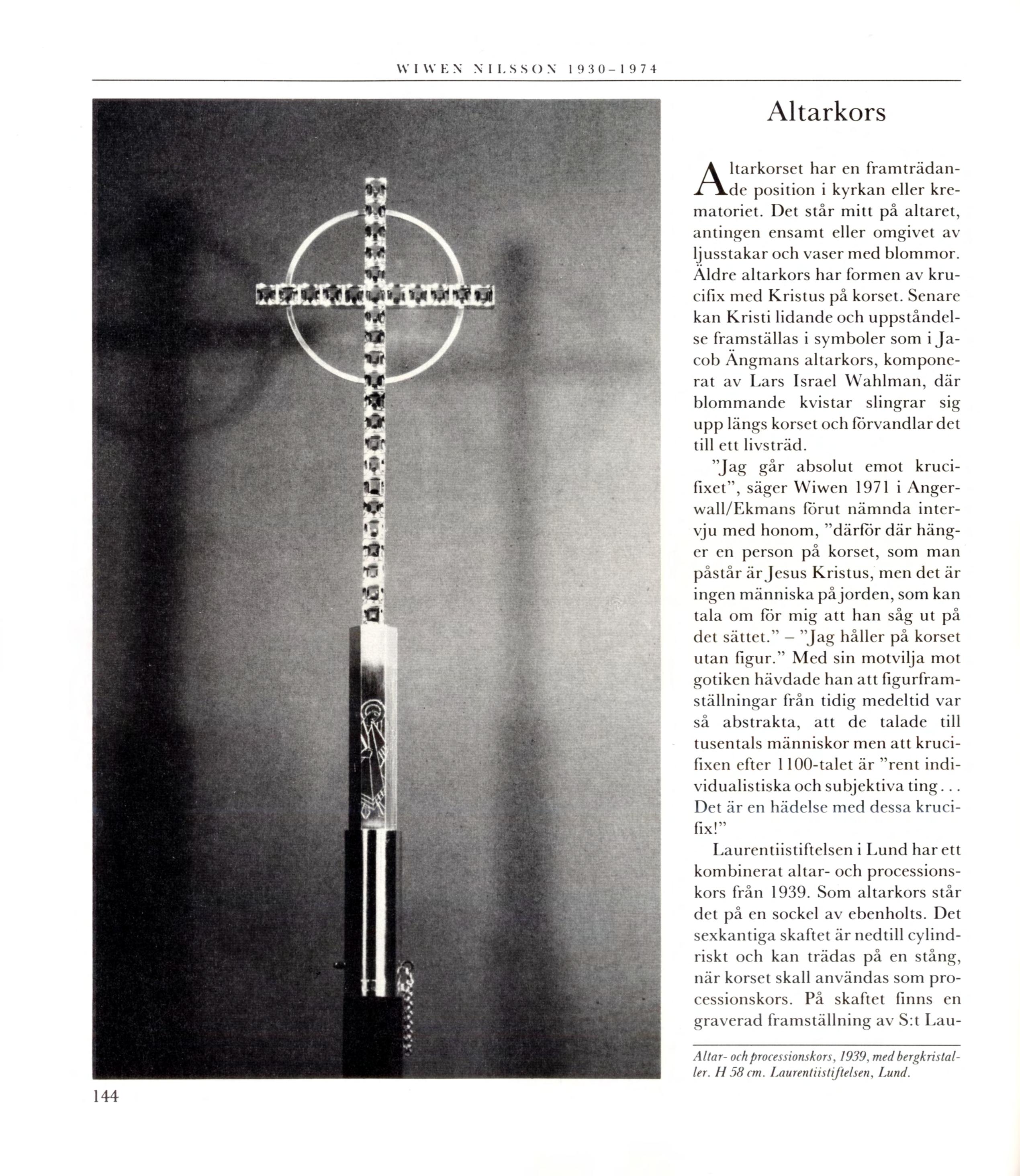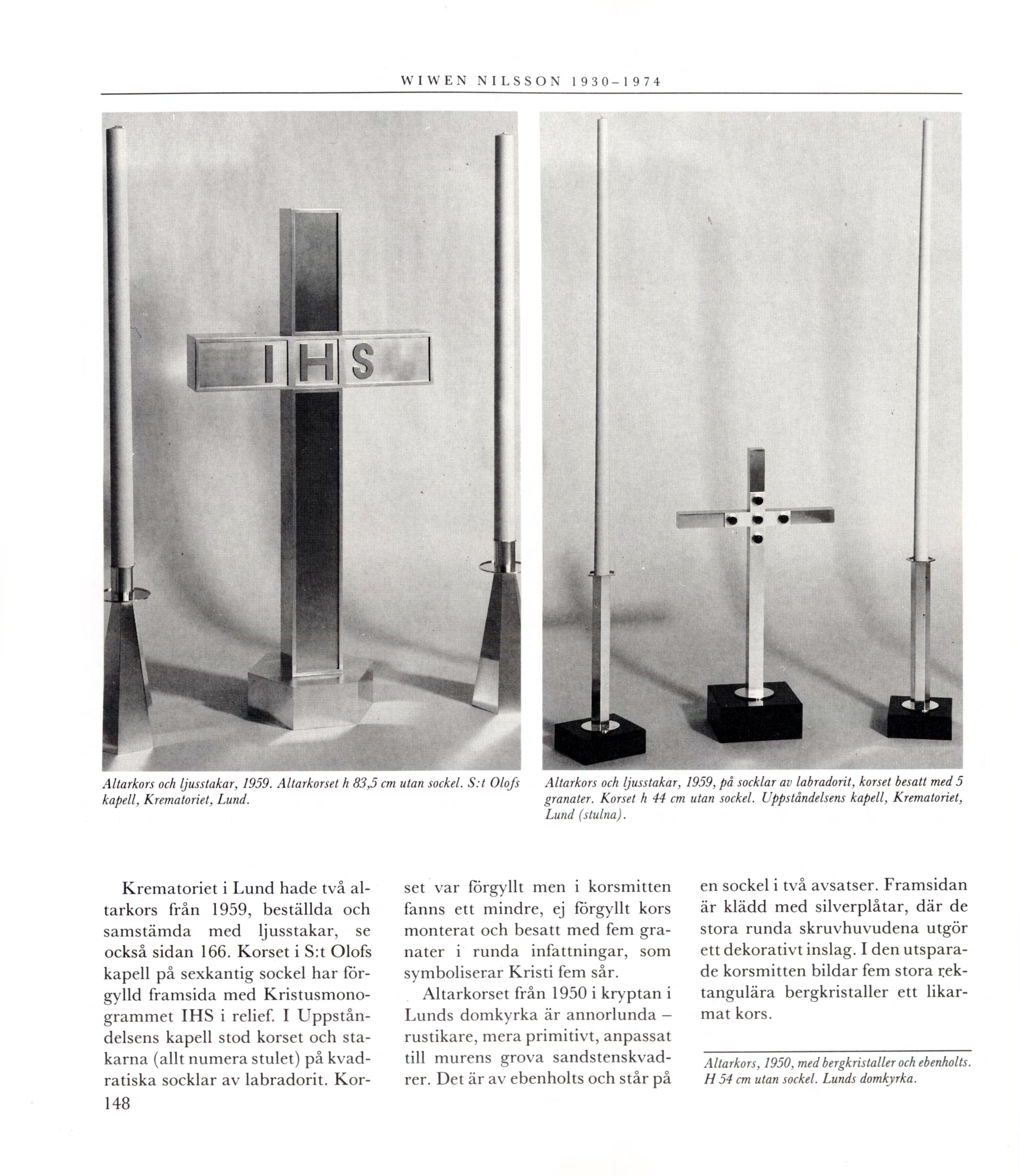 The church silver was designed with the same stringent, geometric forms as the secular silver. It gives a serious, often monumental impression, which is not unexpected considering the solemnity of church. His originality is particularl y seen in his altar crosses. Nilsson was against portraying Christ on the cross. All but one of his crosses ( the one in Lund Cathedral, modeled on a 12th century cross) are non-figurative. Some of them have five facetted stones symbolizing Christ's five wounds. Most of the crosses are made of very large, facetted, rectangular rock crystals, which allow the light to pass through and glitter impressively.
