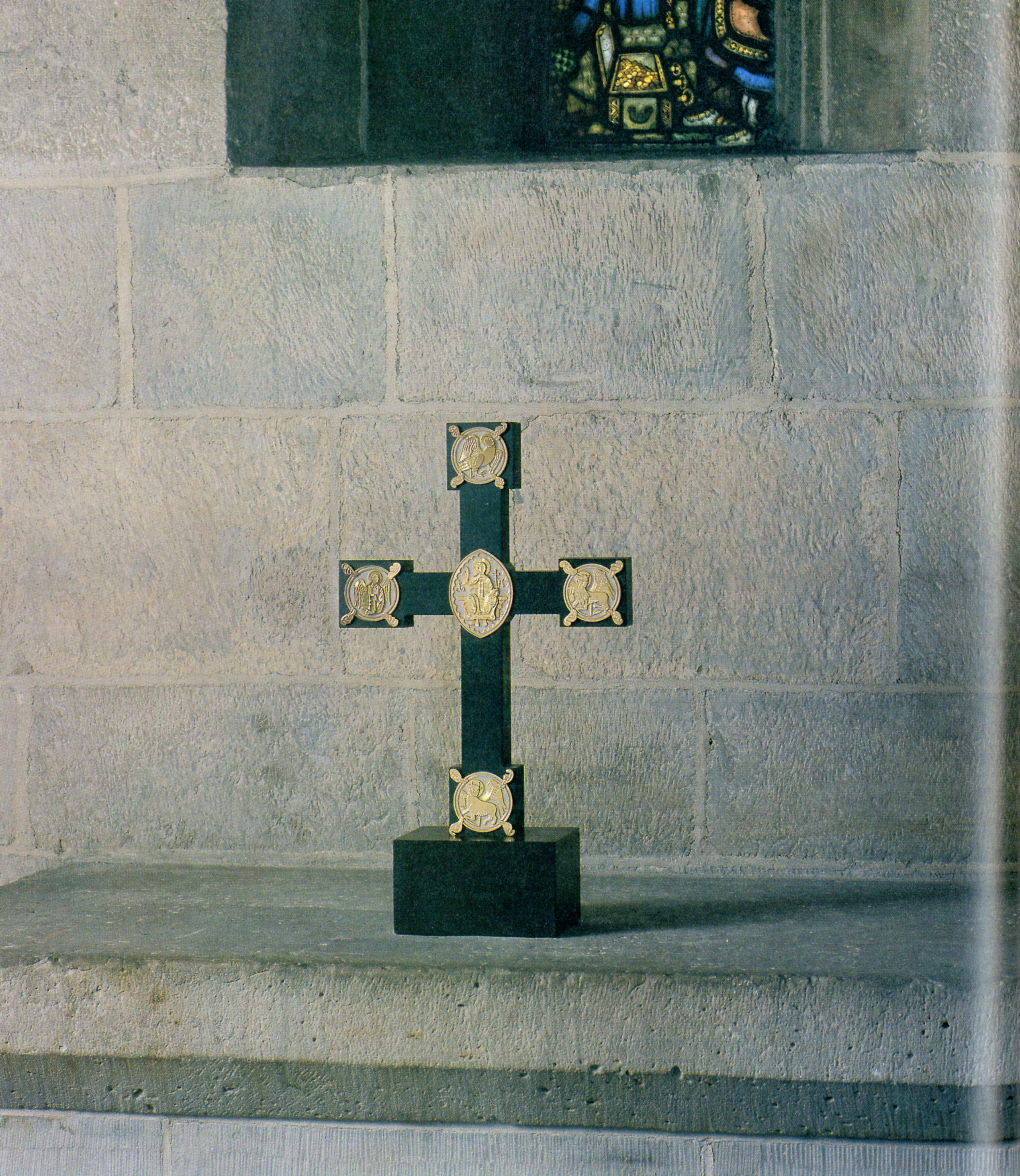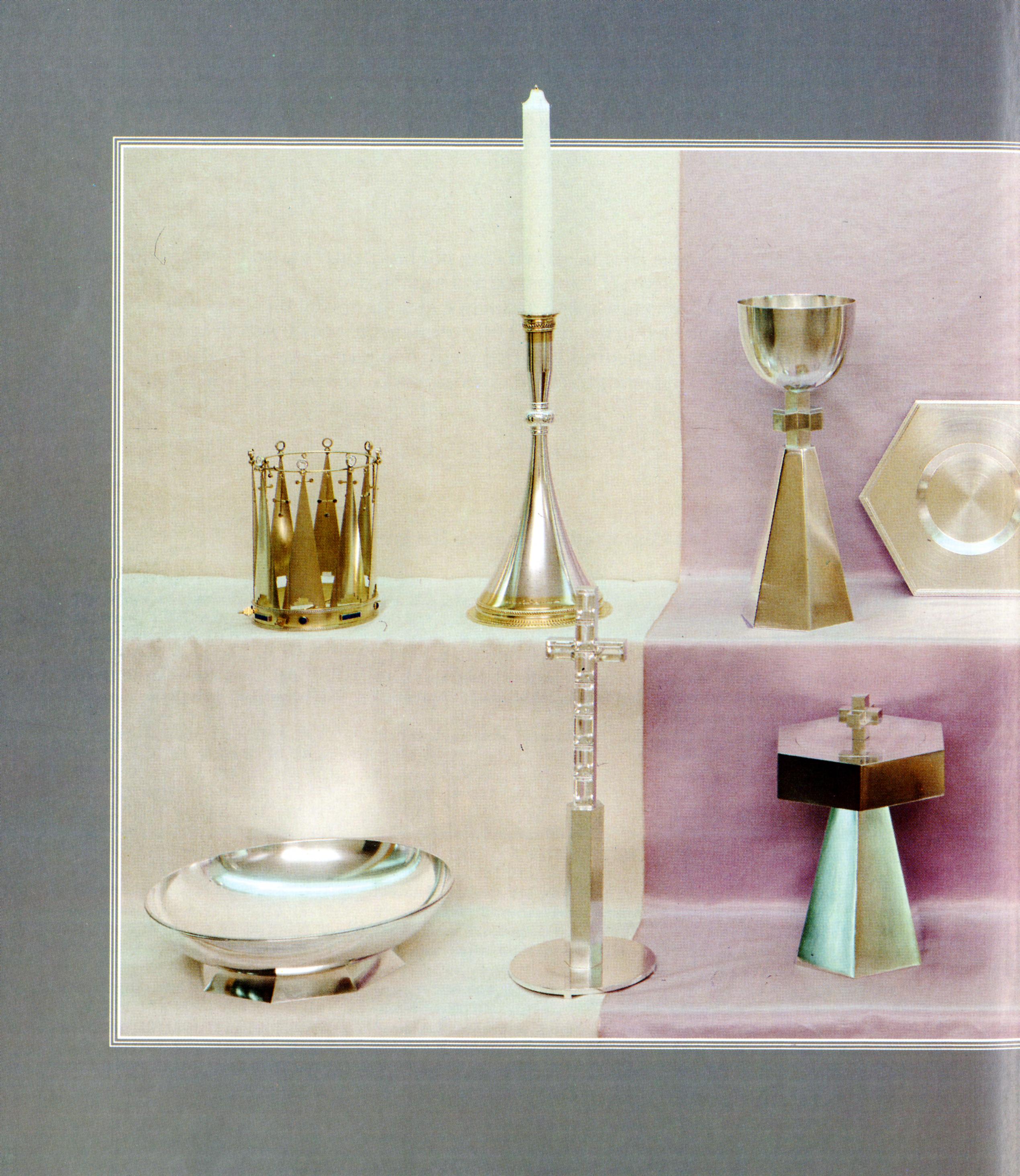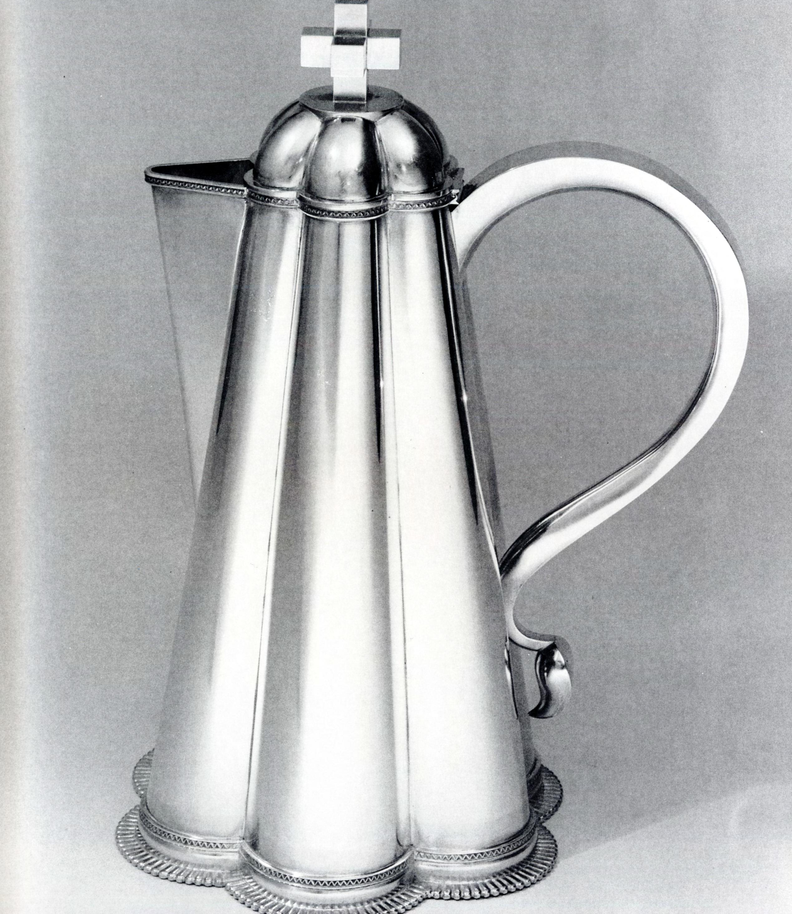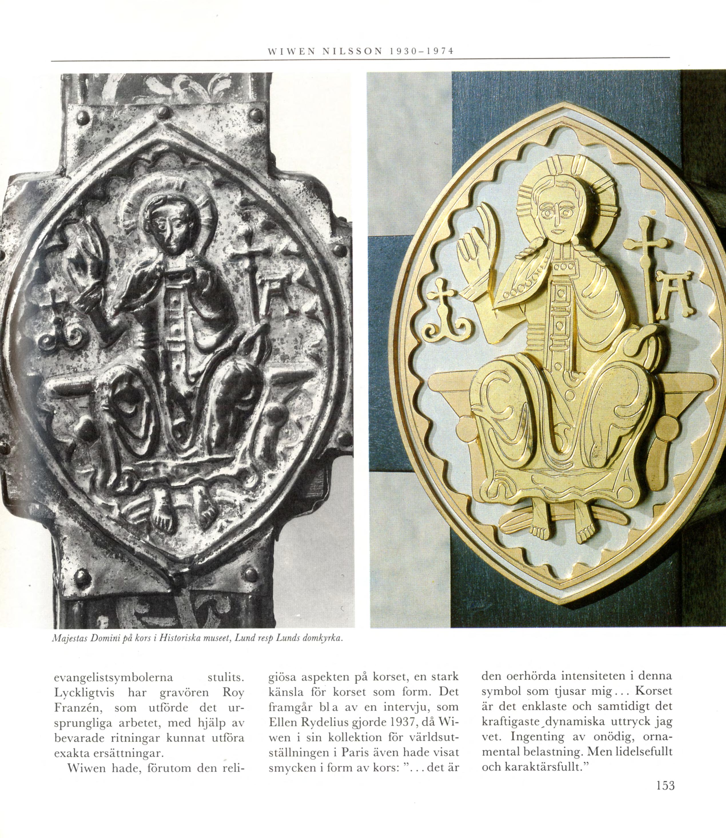 The church silver was designed with the same stringent, geometric forms as the secular silver. It gives a serious, often monumental impression, which is not unexpected considering the solemnity of church. His originality is particularl y seen in his altar crosses. Nilsson was against portraying Christ on the cross. All but one of his crosses ( the one in Lund Cathedral, modeled on a 12th century cross) are non-figurative. Some of them have five facetted stones symbolizing Christ's five wounds. Most of the crosses are made of very large, facetted, rectangular rock crystals, which allow the light to pass through and glitter impressively.