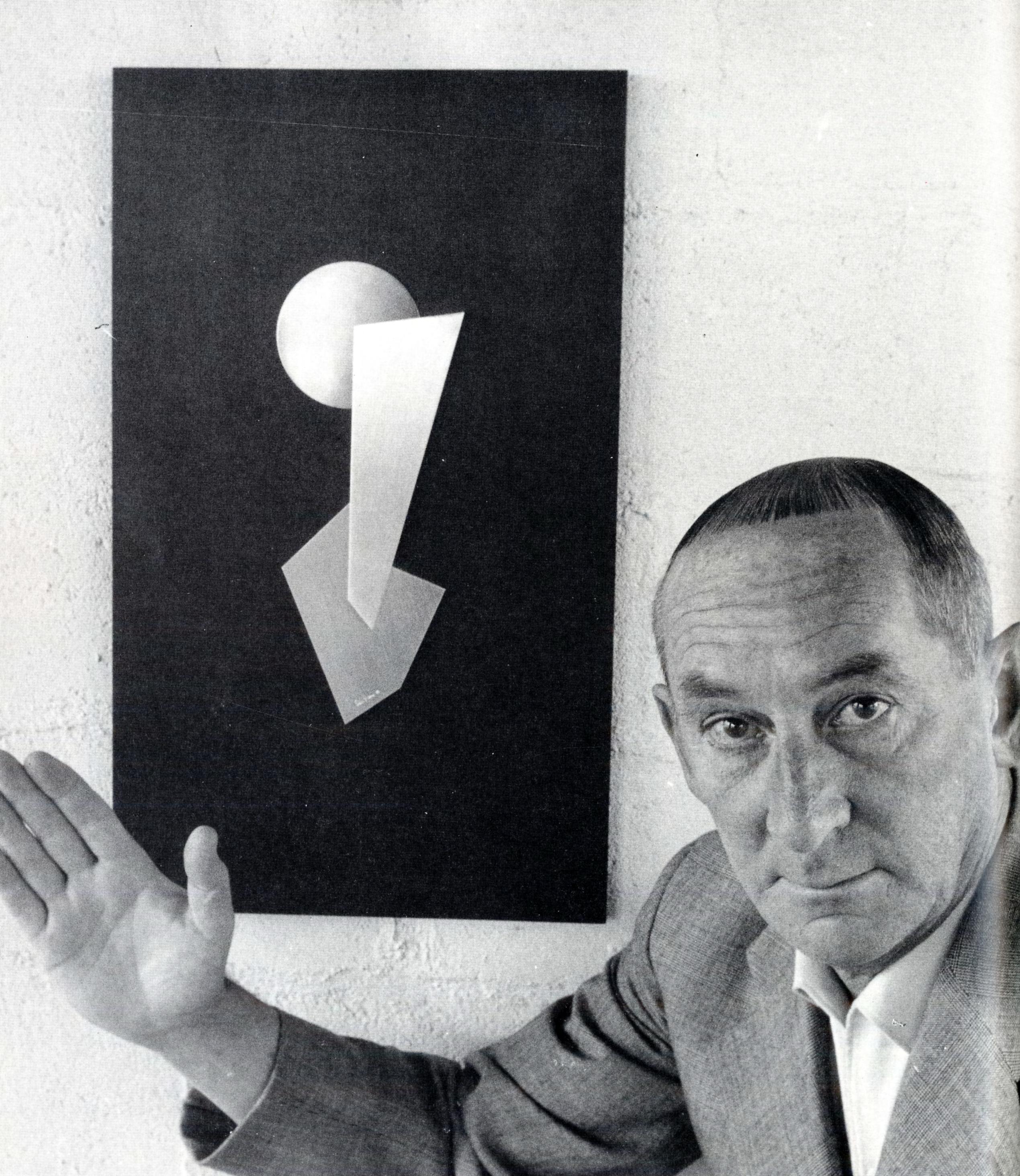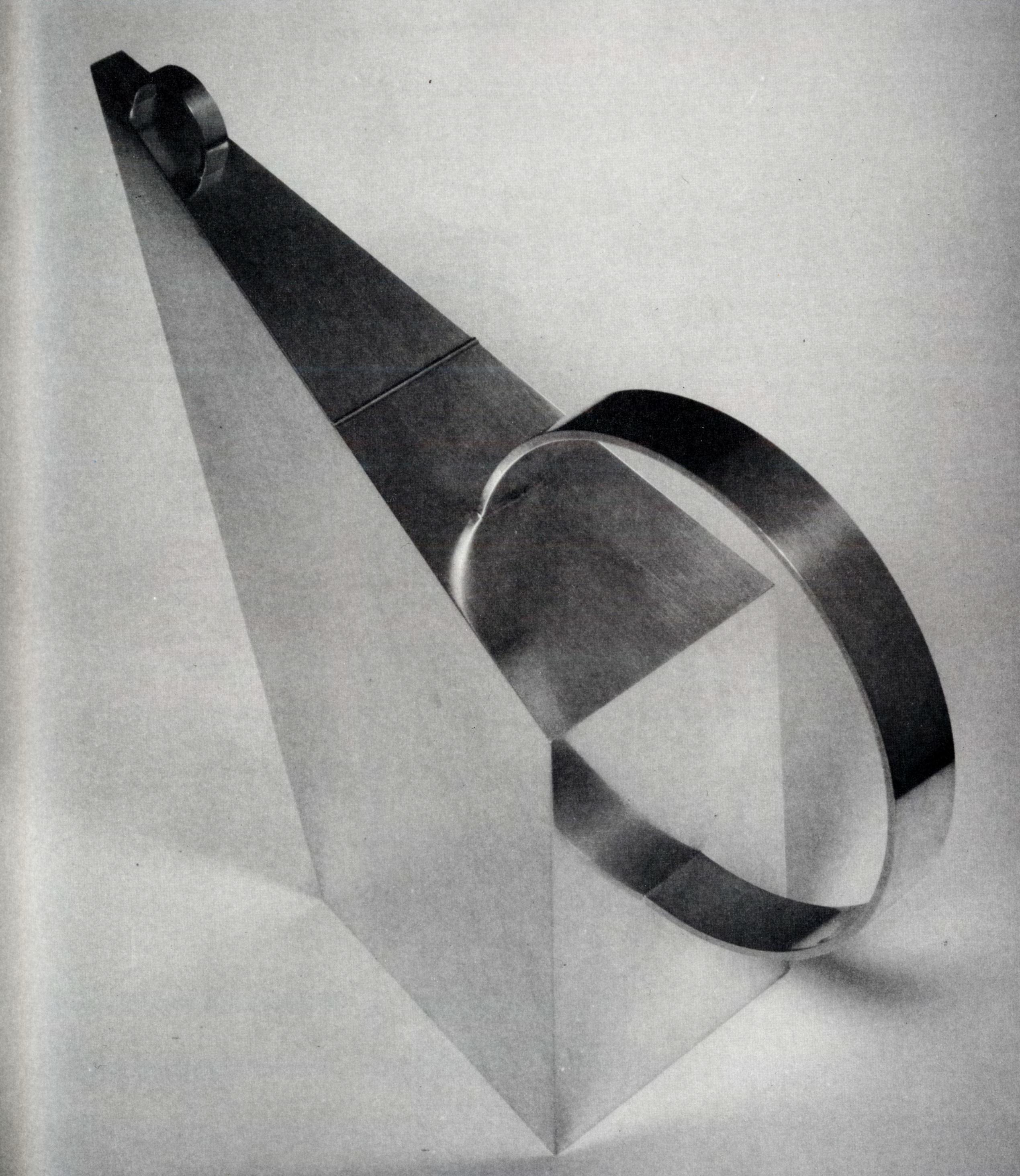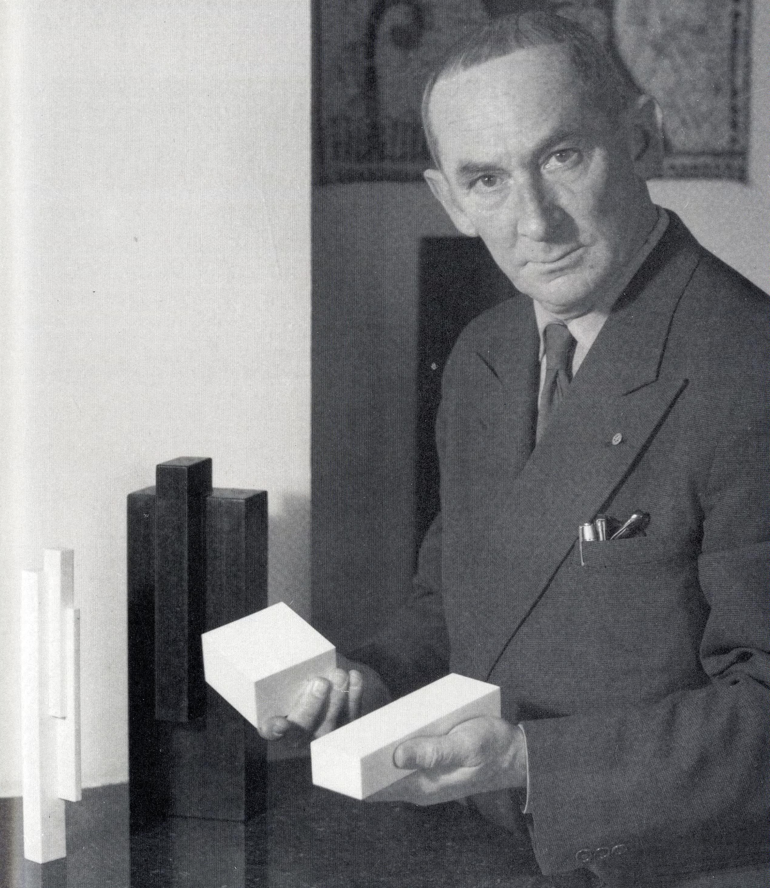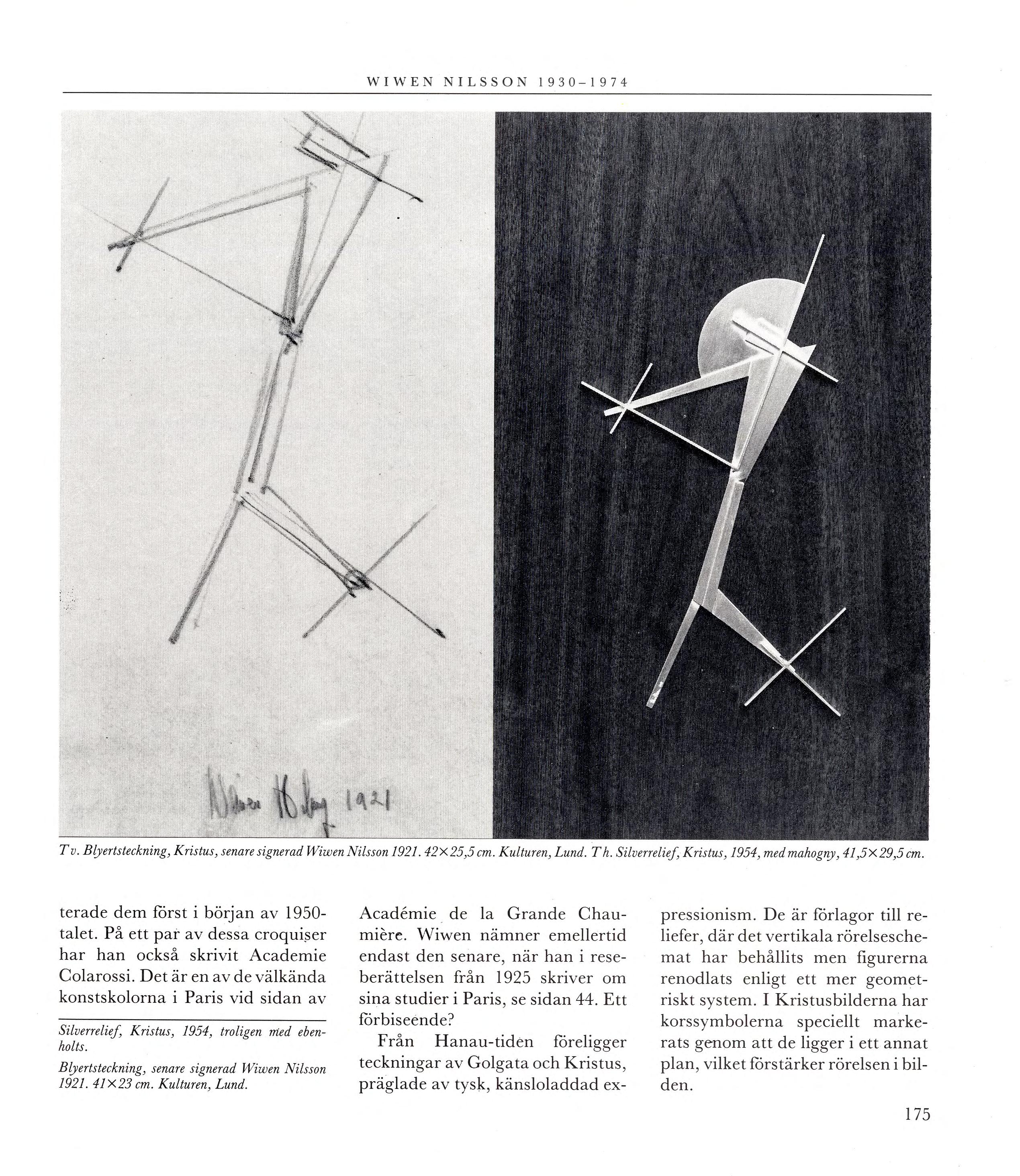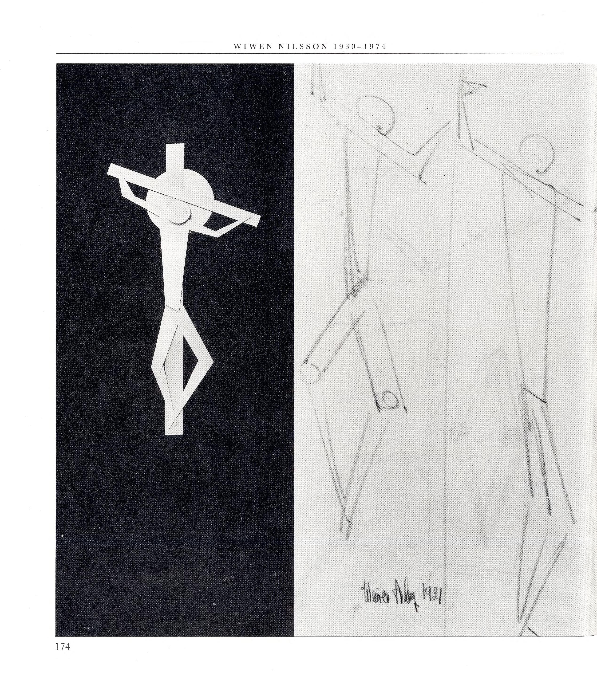 By the beginning of the 1950's a new generation of Swedish silversmiths had established itself. Nilsson was no longer the young revolutionary on the contrary, he was now considered a "classic". He refused to renounce the design ideals based on mathematical calculations, and used them in the sculptures and reliefs which he started to work on at this time. The sculptures are usually made of black granite (diabase) , labradorite and white marble, and have a purely geometric, vertical design. The reliefs are made of overlapping flat silver sheets and attached to a dark, rectangular background of ebony or mahogany. ilsson took his inspiration from his own drawings and sketches from the period in Hanau and Paris in the twenties. Several reliefs, among them a Golgotha scene, are influenced by German expressionism while others exhibit clear traces of French cubism. The flat, geo metric, neo-plasticist reliefs were inspired by his friend GA 's neoplasticist paintings from the beginning of the thirties.