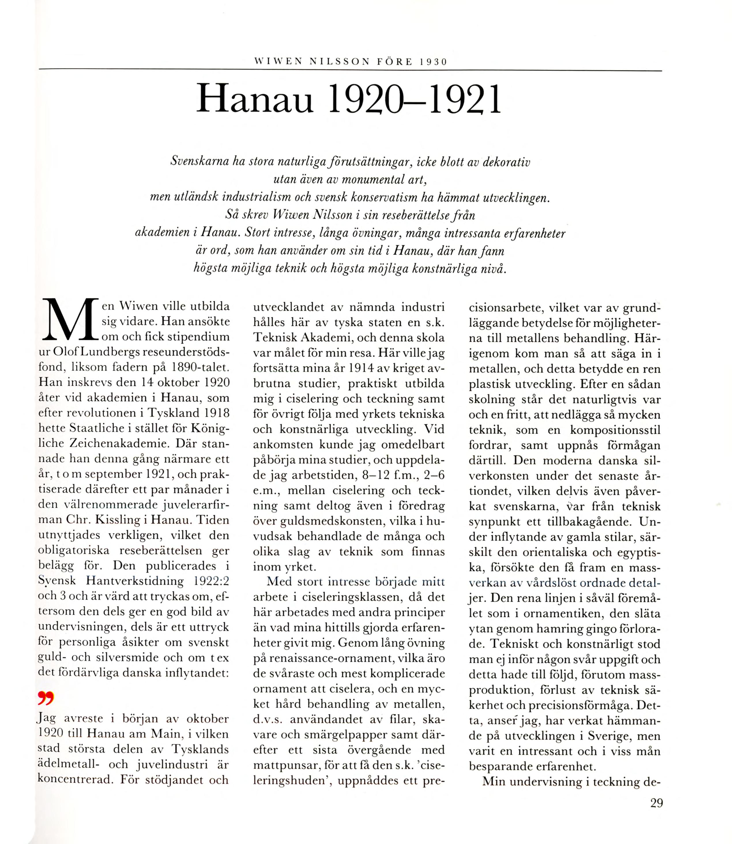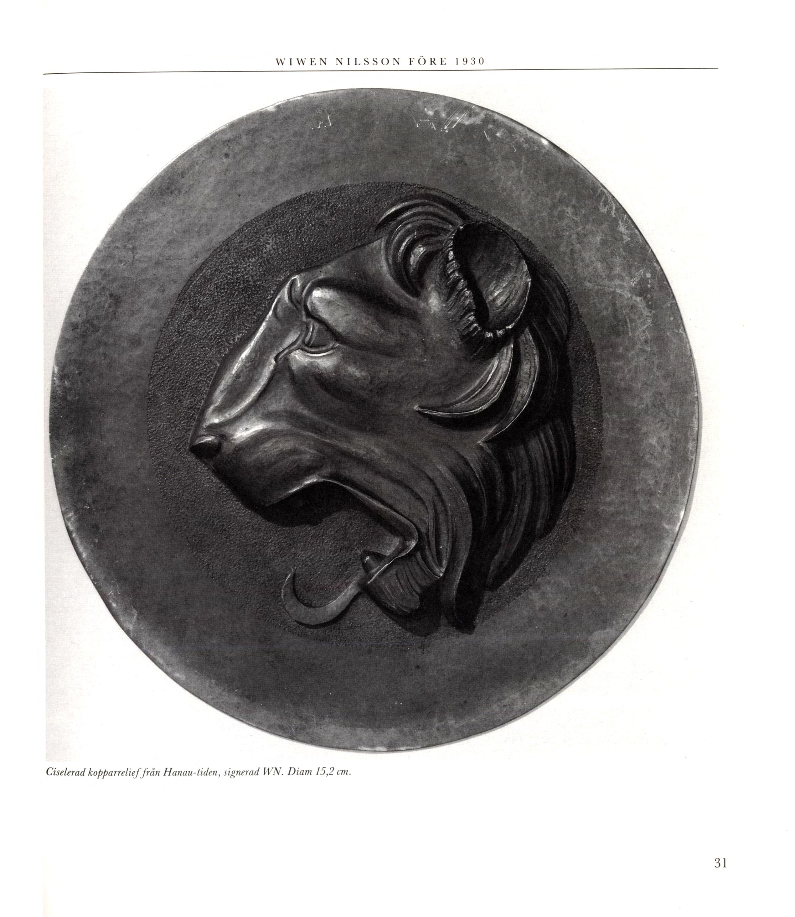 The Königliche Zeichenakademie in Hanau am Main near Frankfurt, West Germany is Germany's oldest and most wellknown go ld smithery school. It was founded in 1772 by Crown Prince Wilhelm ofHessen. Wiwen Nilsson was enrolled there in the autumn of 1913 and the spring of 1914, but had to interrupt his training due to the outbreak of the First World War. He continued in his father's workshop and went for a while to the Tekniske Selskabs Skole in Copenhagen. He also took private lessons in chasing from a goldsmith and sculptor in Copenhagen. On May 2, 1919 he received a certifi cate attesting to the fact that he was a qualified chaser and silversmith and was awarded the Swedish Craft Organization's !arge silver medal for ski ll in his trade.