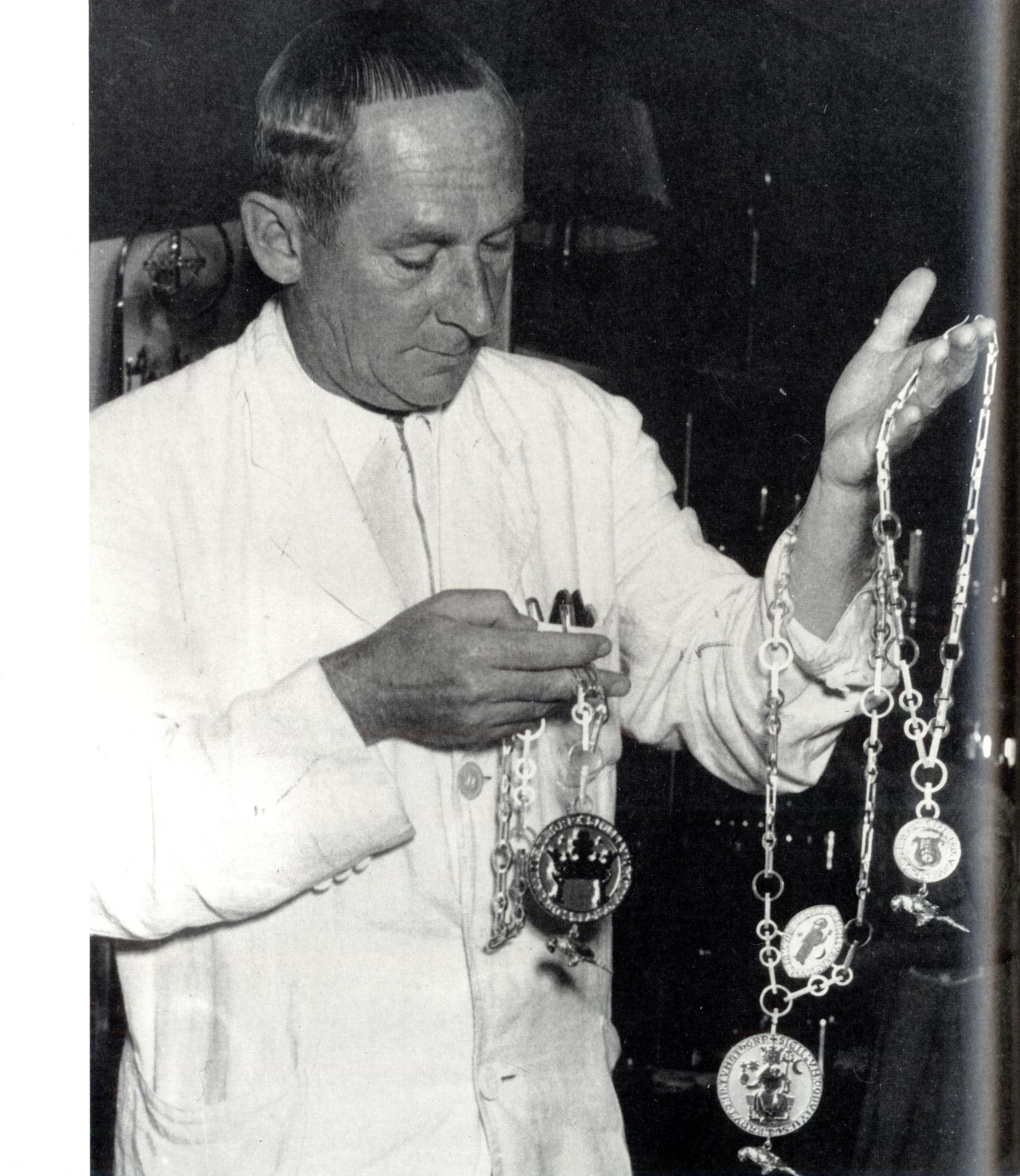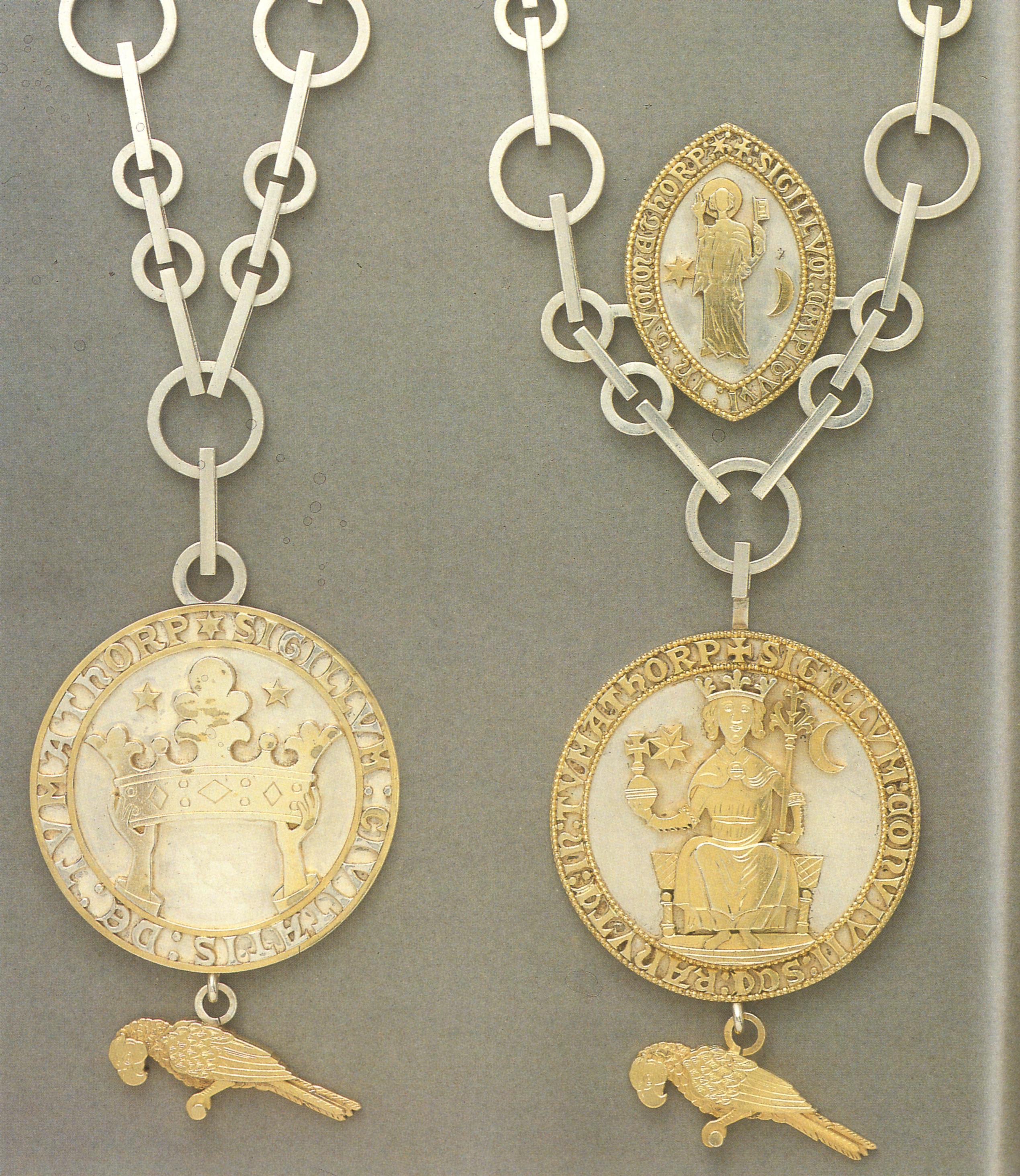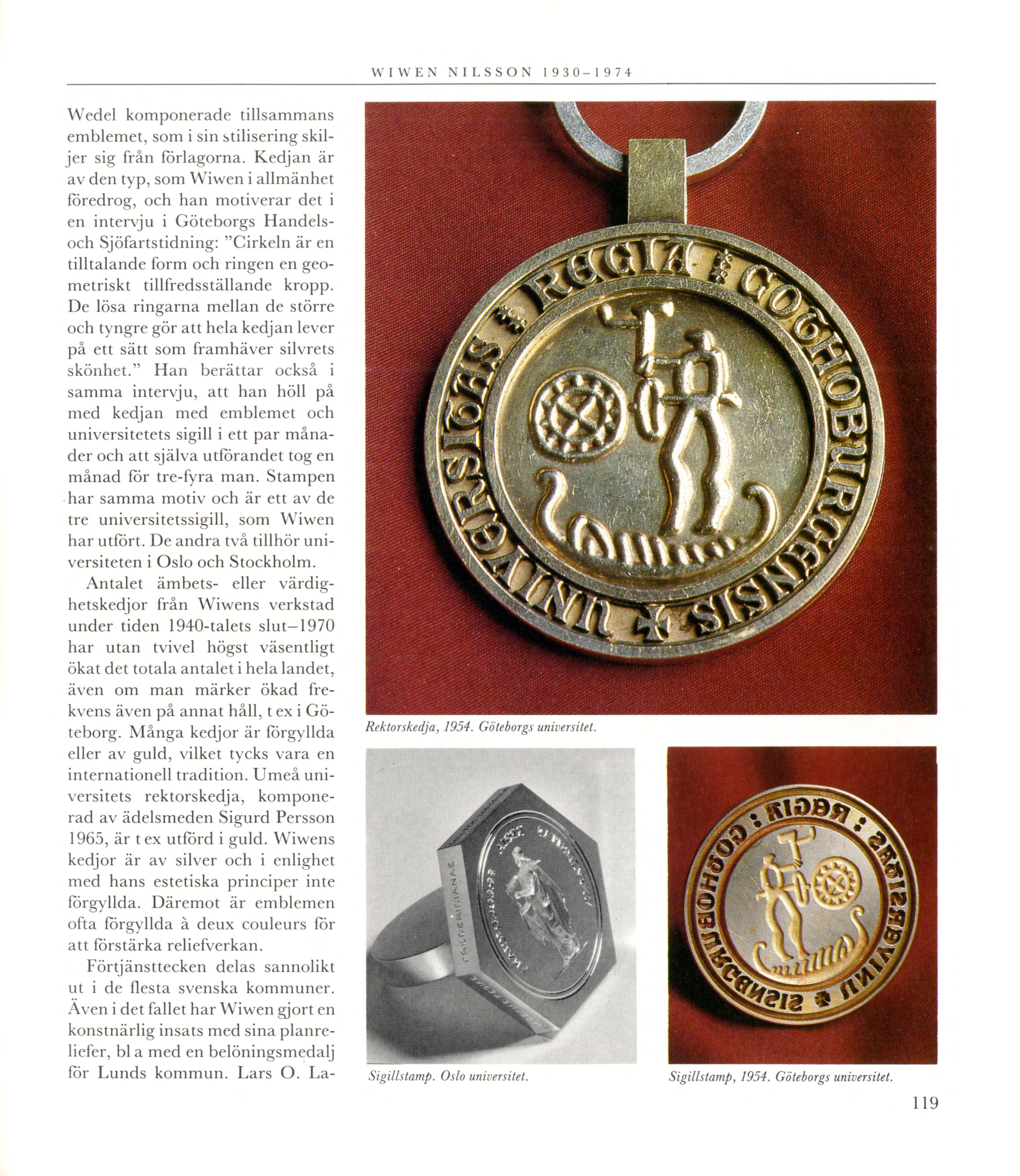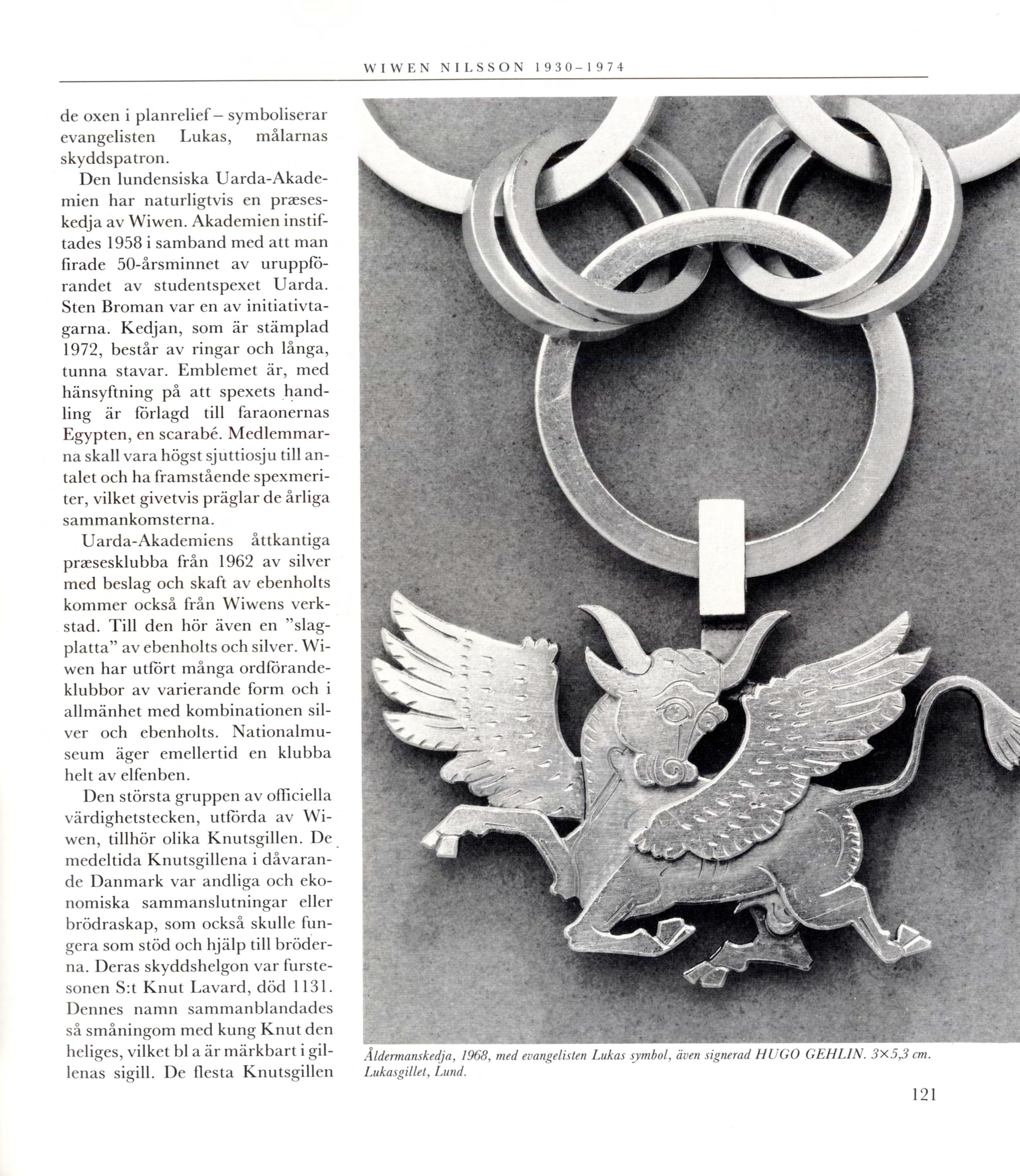 Nilsson made a large number of official chains for university deans, the mayor of Lund, the heads of various organizations and aldermen in different associations The official medallions hanging from the chains are often modeled on medieval seals, carefully interpreted by Nilsson hut simultaneously new , independent creations, characterized by his ·special way of creating depth by building up the different elements of the design