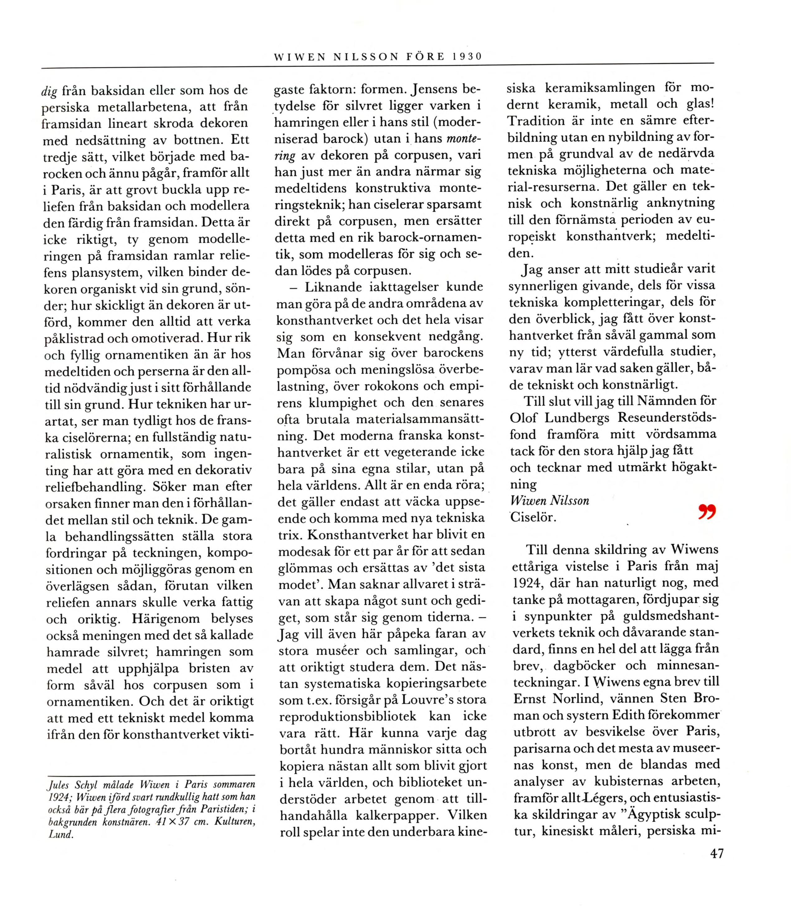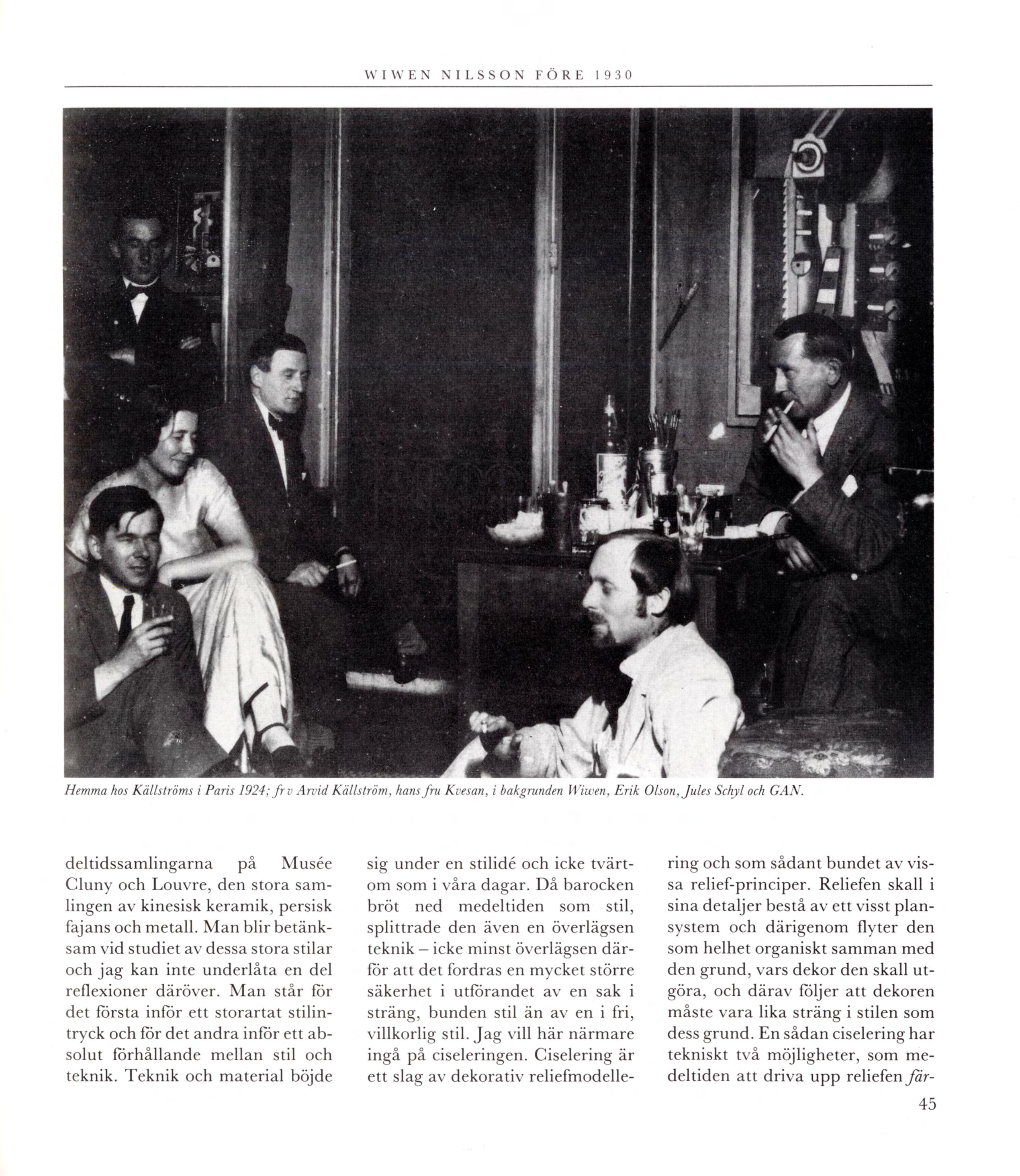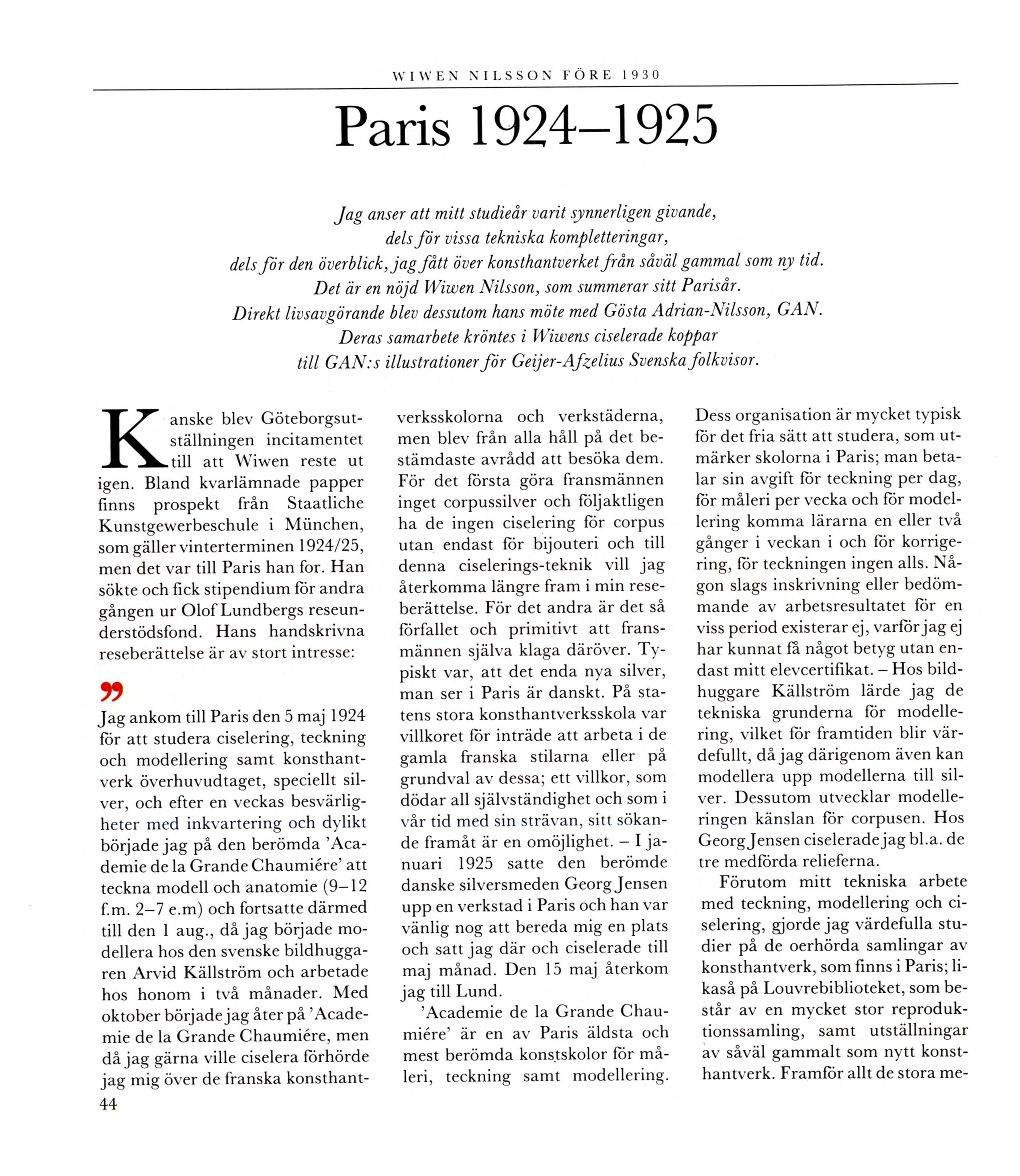 Once again Nilsson left the country, in May 1924 quite possi bly due to the bad reception he got in Gothenburg. This time he went to Paris , where he stayed fora year. He felt that there was not so much more to learn concerning his trade instead he devoted much of his time to studying art and crafts in the Parisian museums and libraries. More than anything else he was fascinated by Byzantine art, whose principles of design and