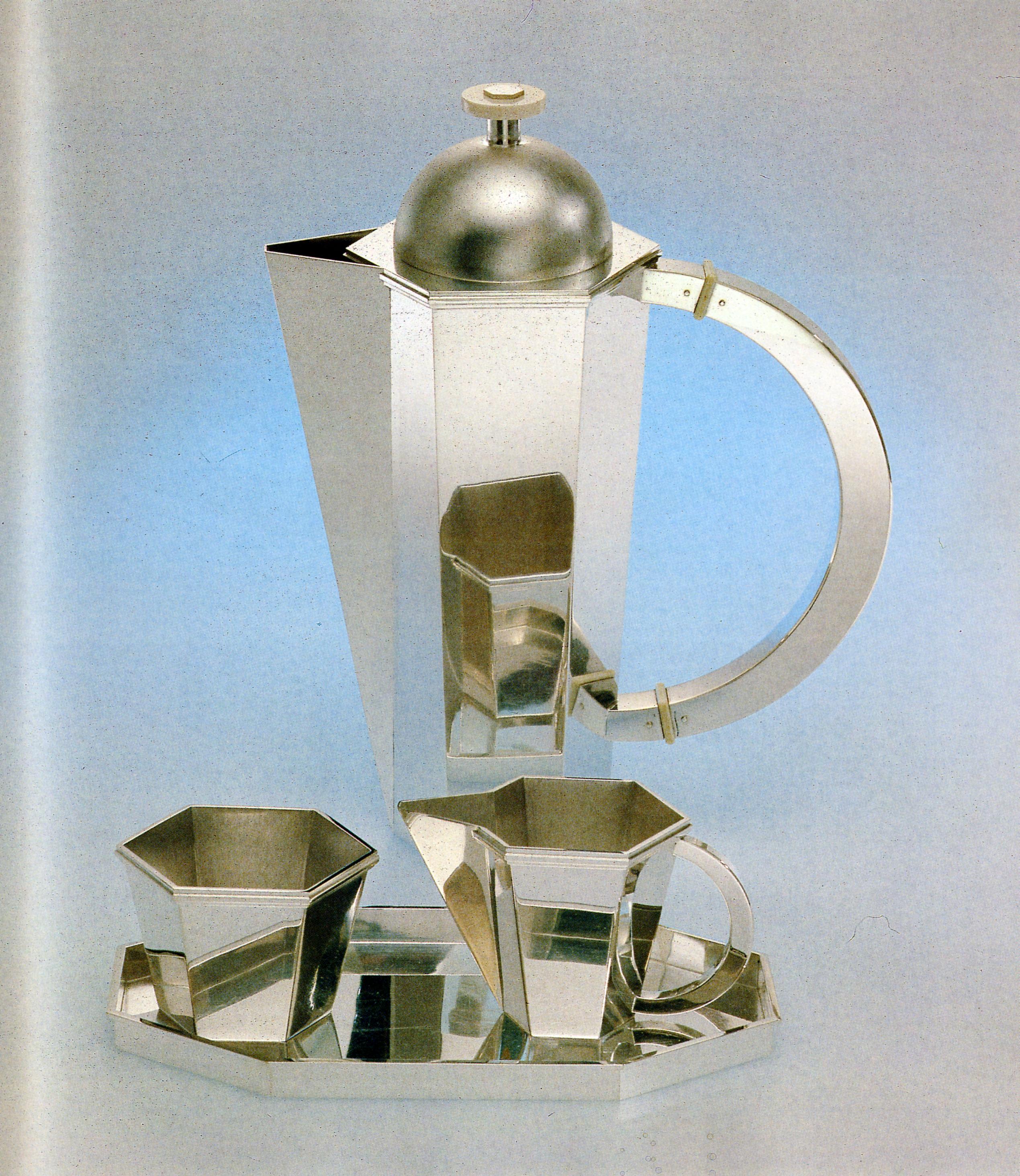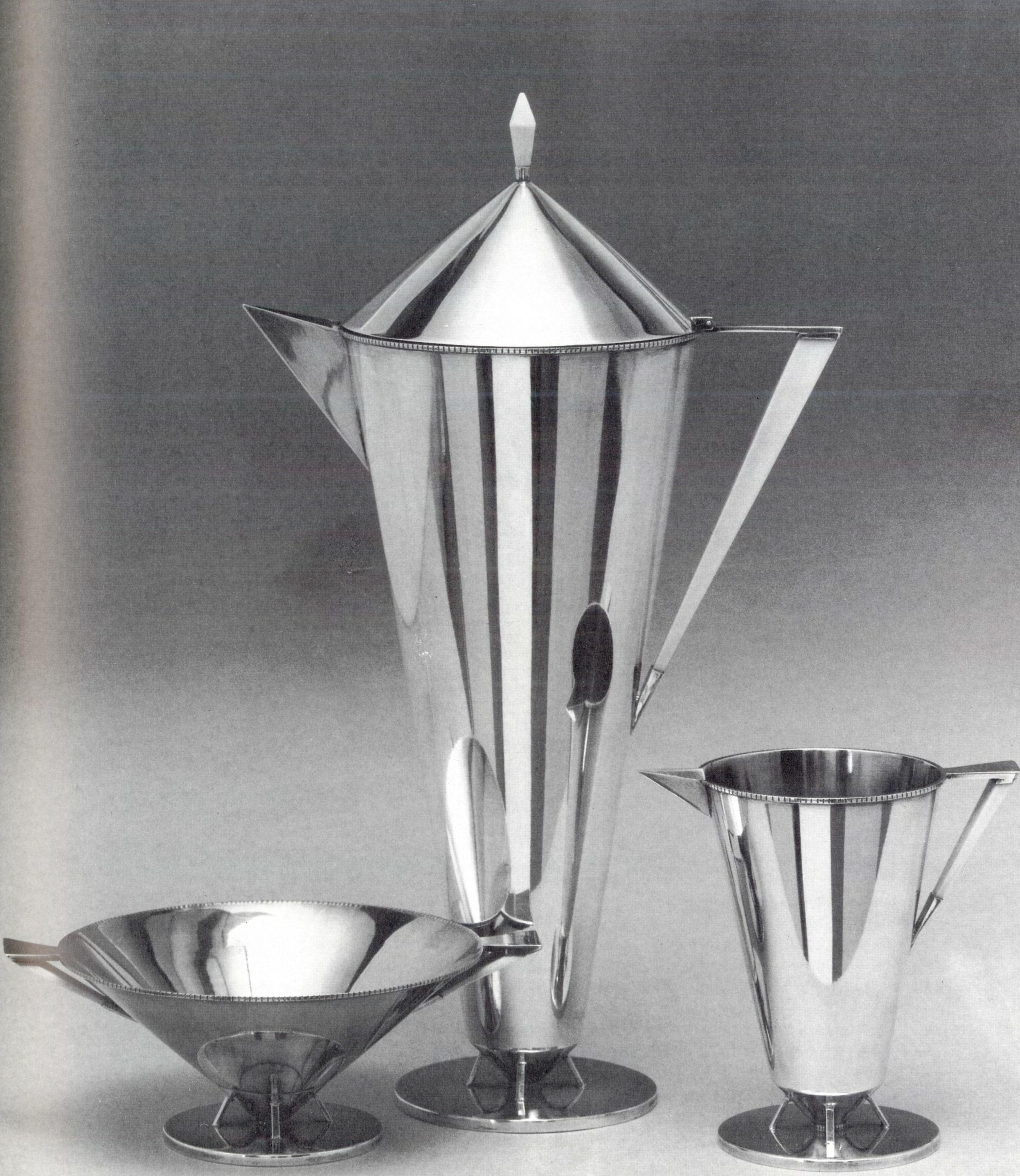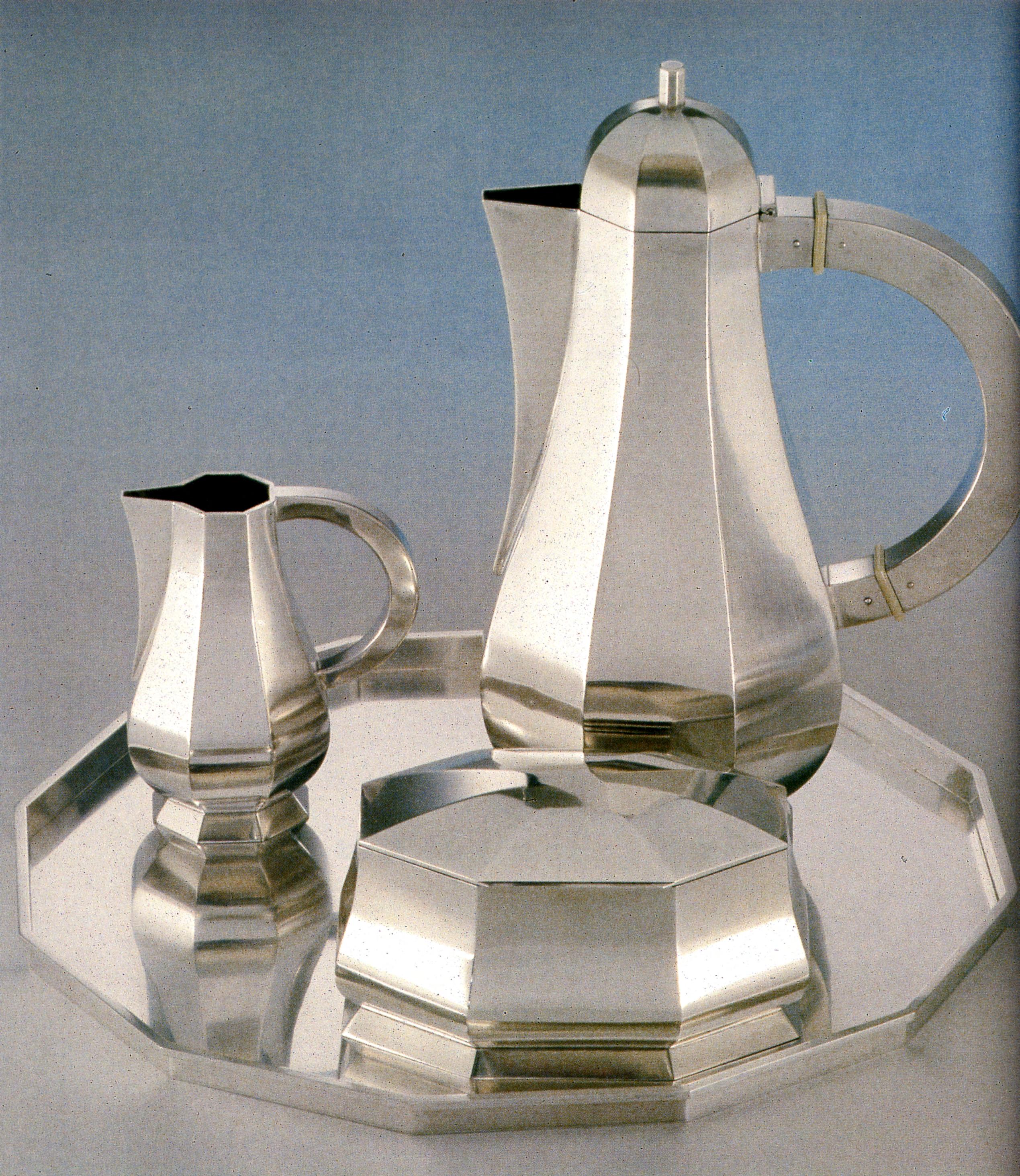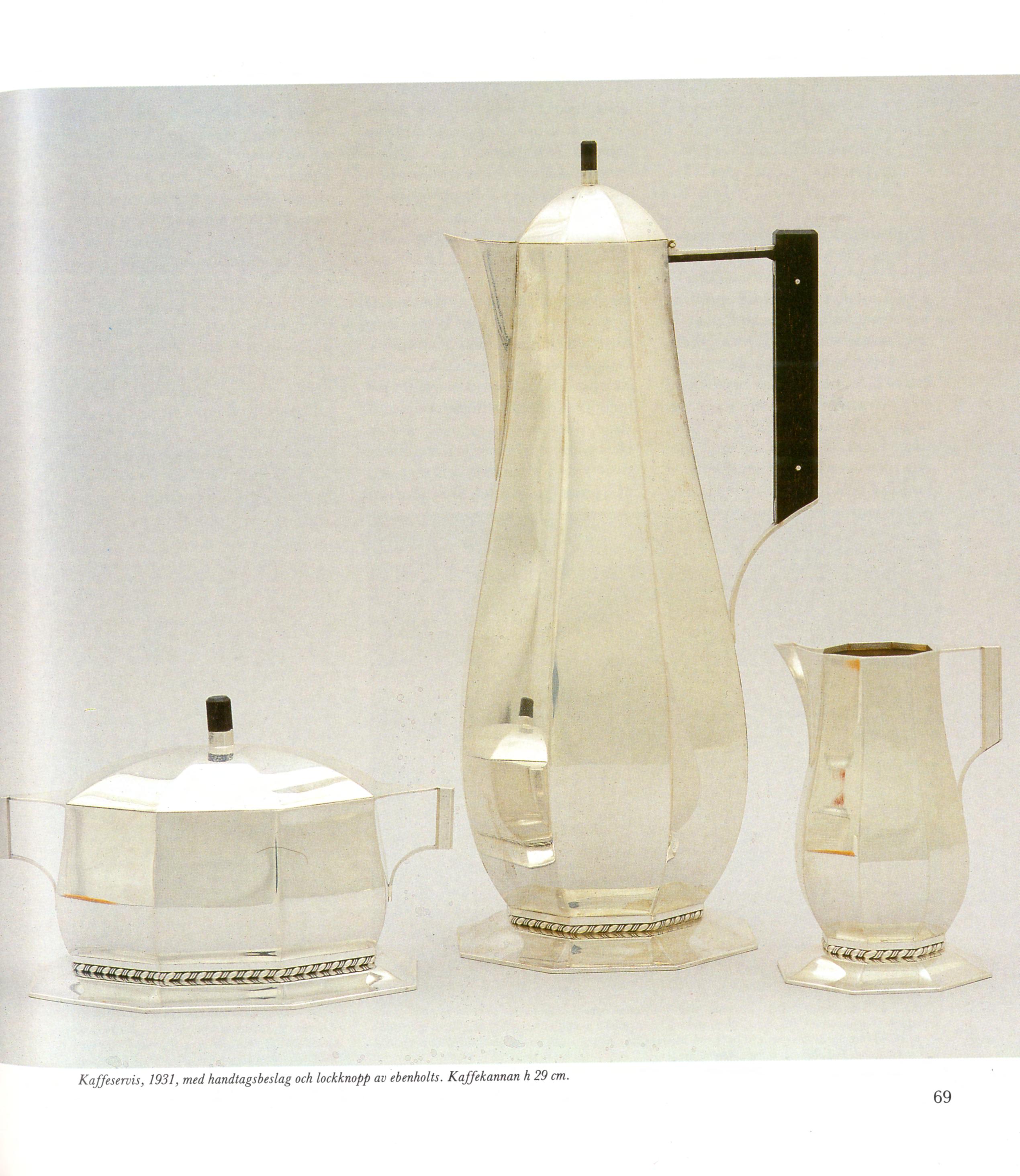 Wiwen Nilsson had a large, purely handmade production of tableware, personal objects, specially designed honorary presents and symbols of office and dignity. His range of forms included the cylinder, the cone, the cube and the hemisphere on top of other geometric forms acting as the hearing elements . He liked to work with well calculated facetting which was perfectly executed by his staff of skilled craftsmen . His extravagant hut serious way of playing with geometric forms can be studied for example in his coffee and tea services , which all varied in different ways.