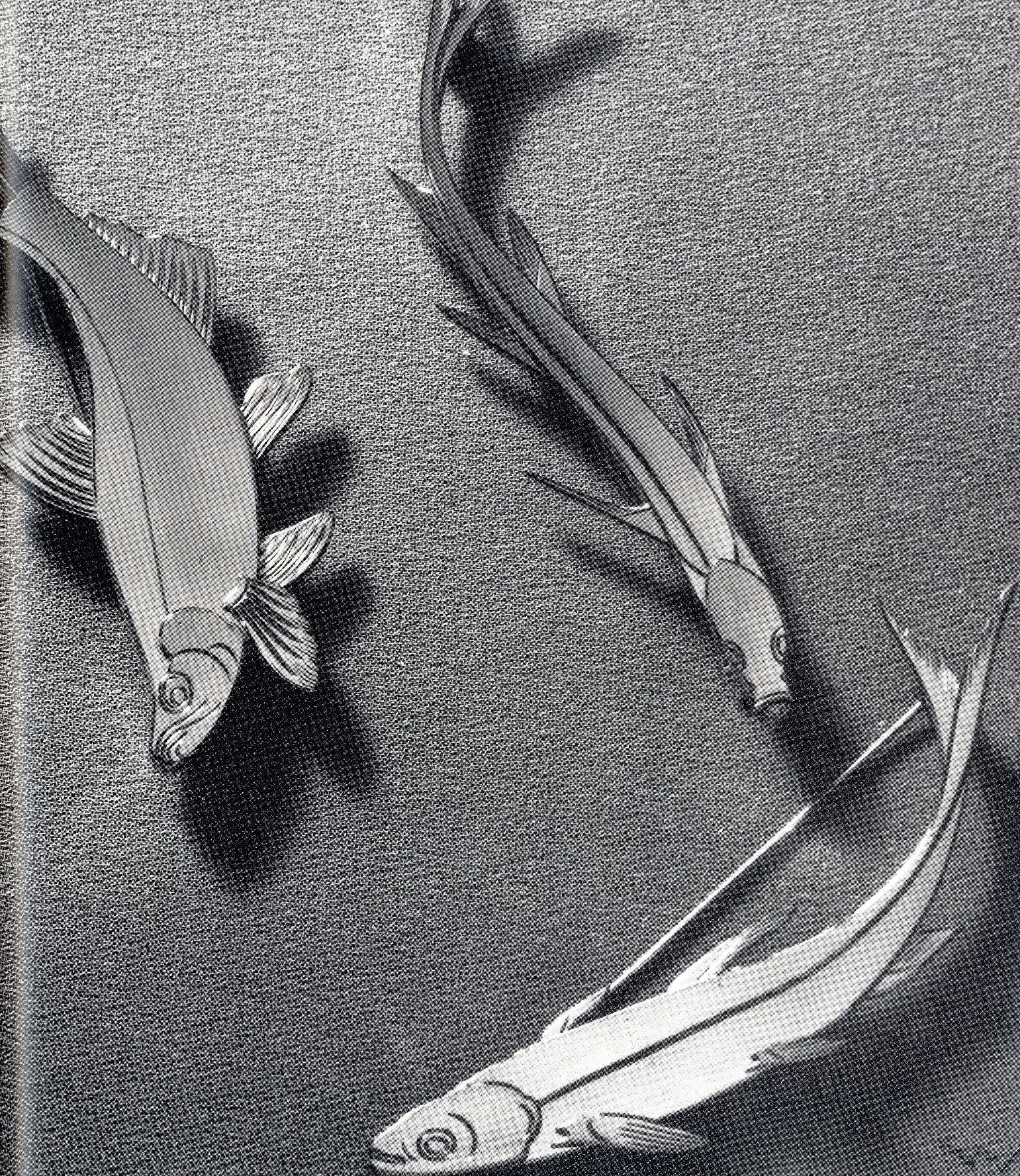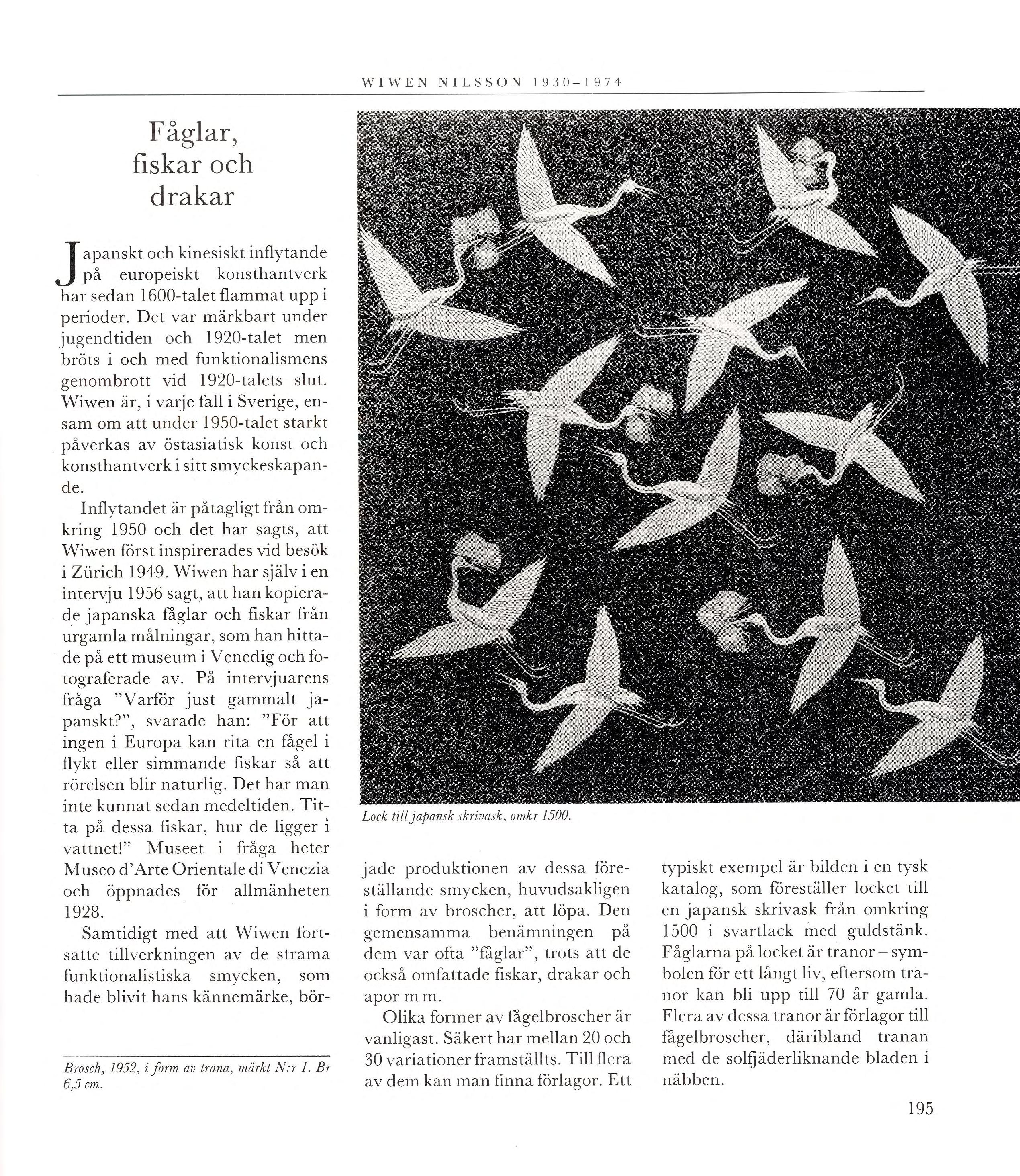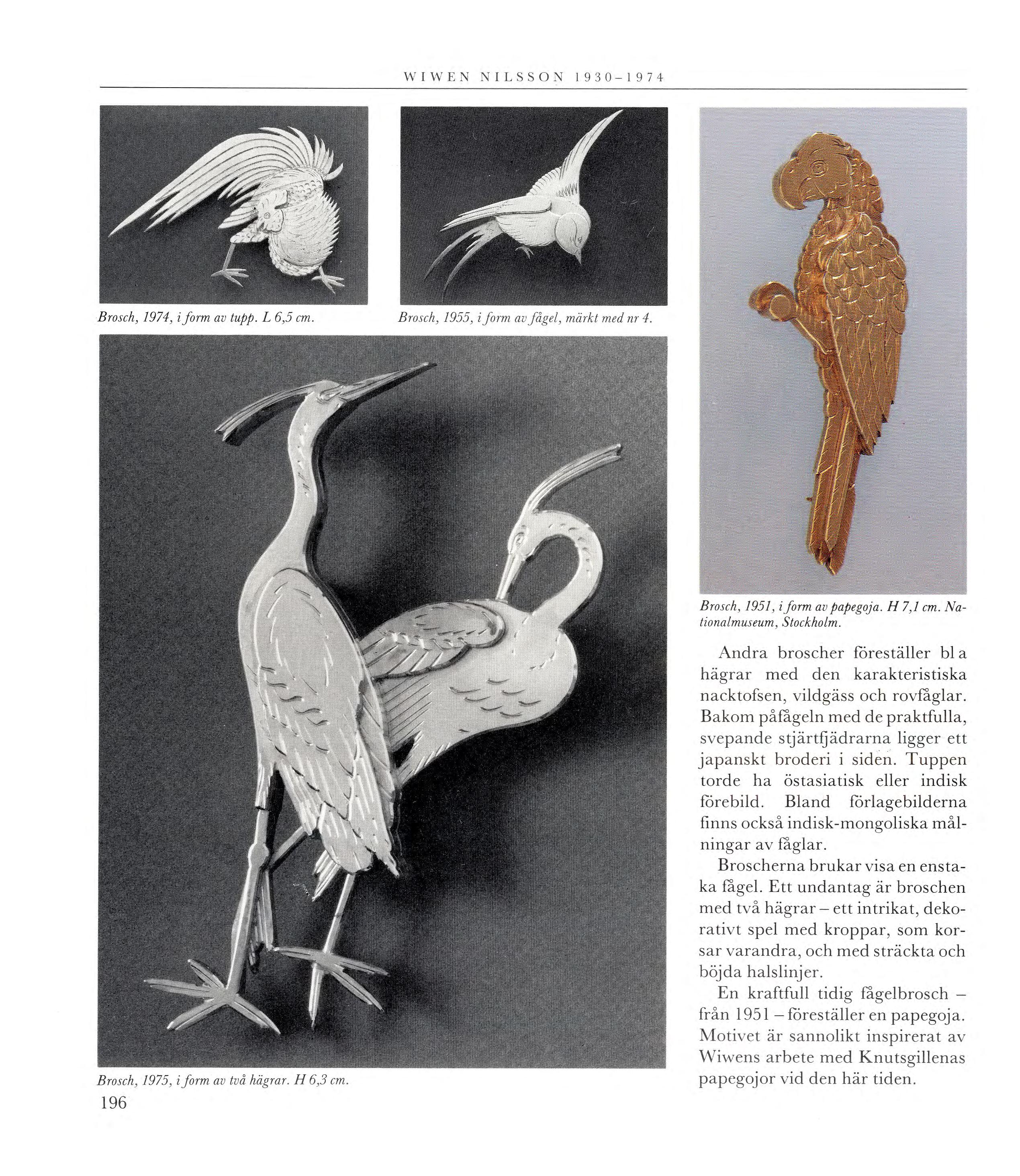 A fascination withjapanese and Chinese art became apparent in the fifties ilsson started to make brooches formed like flying birds, fish, dragons and plants , clearly inspired by Chinese painting and Japanese woodcuts. They were a success. Through their design and the sheet-on-sheet technique special for Nilsson , they acquired their own artistic expression.