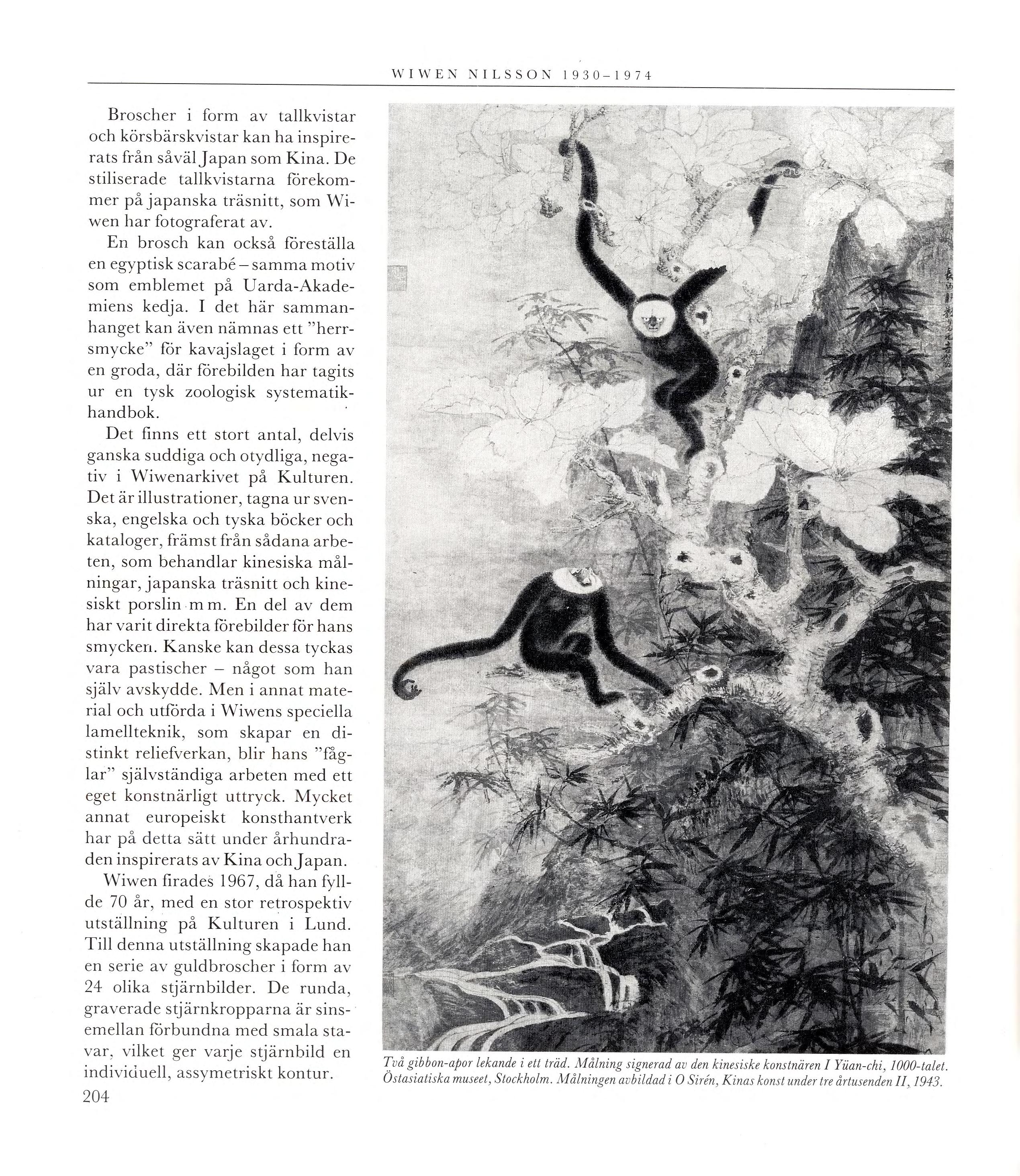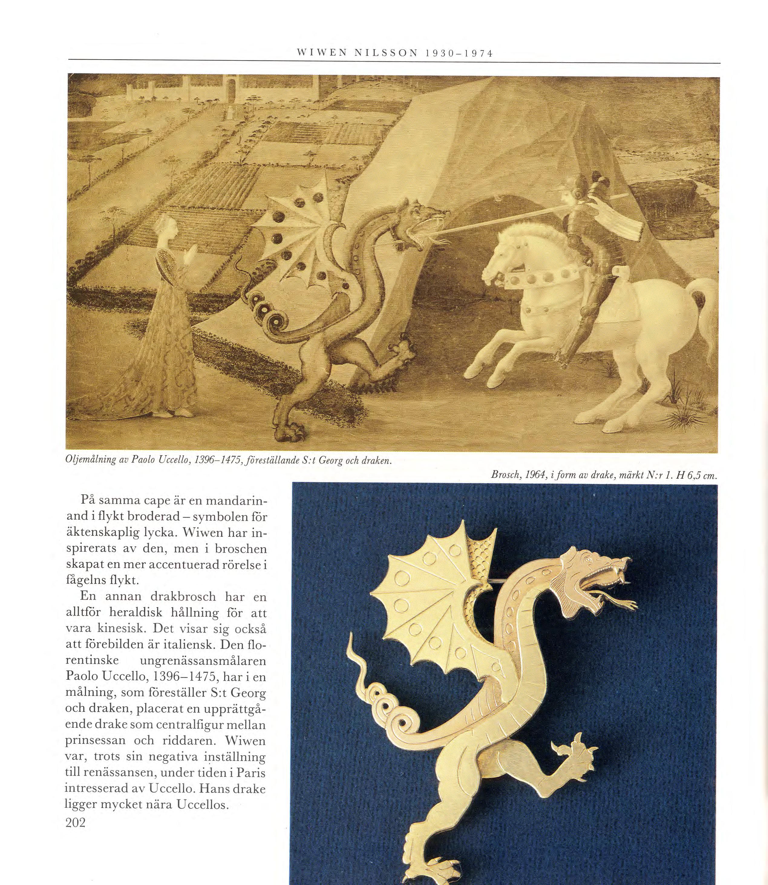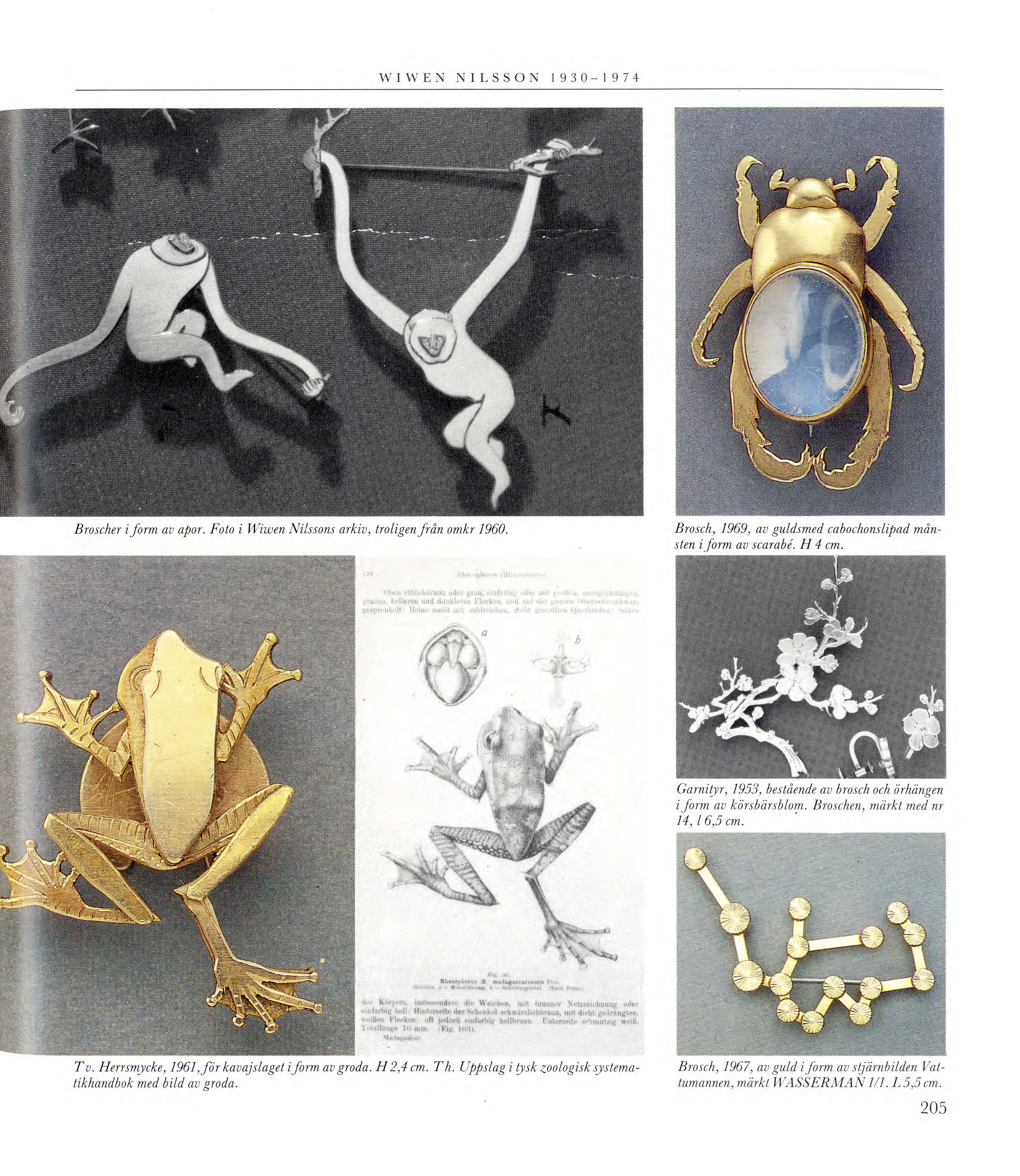 A fascination withjapanese and Chinese art became apparent in the fifties ilsson started to make brooches formed like flying birds, fish, dragons and plants , clearly inspired by Chinese painting and Japanese woodcuts. They were a success. Through their design and the sheet-on-sheet technique special for Nilsson , they acquired their own artistic expression.