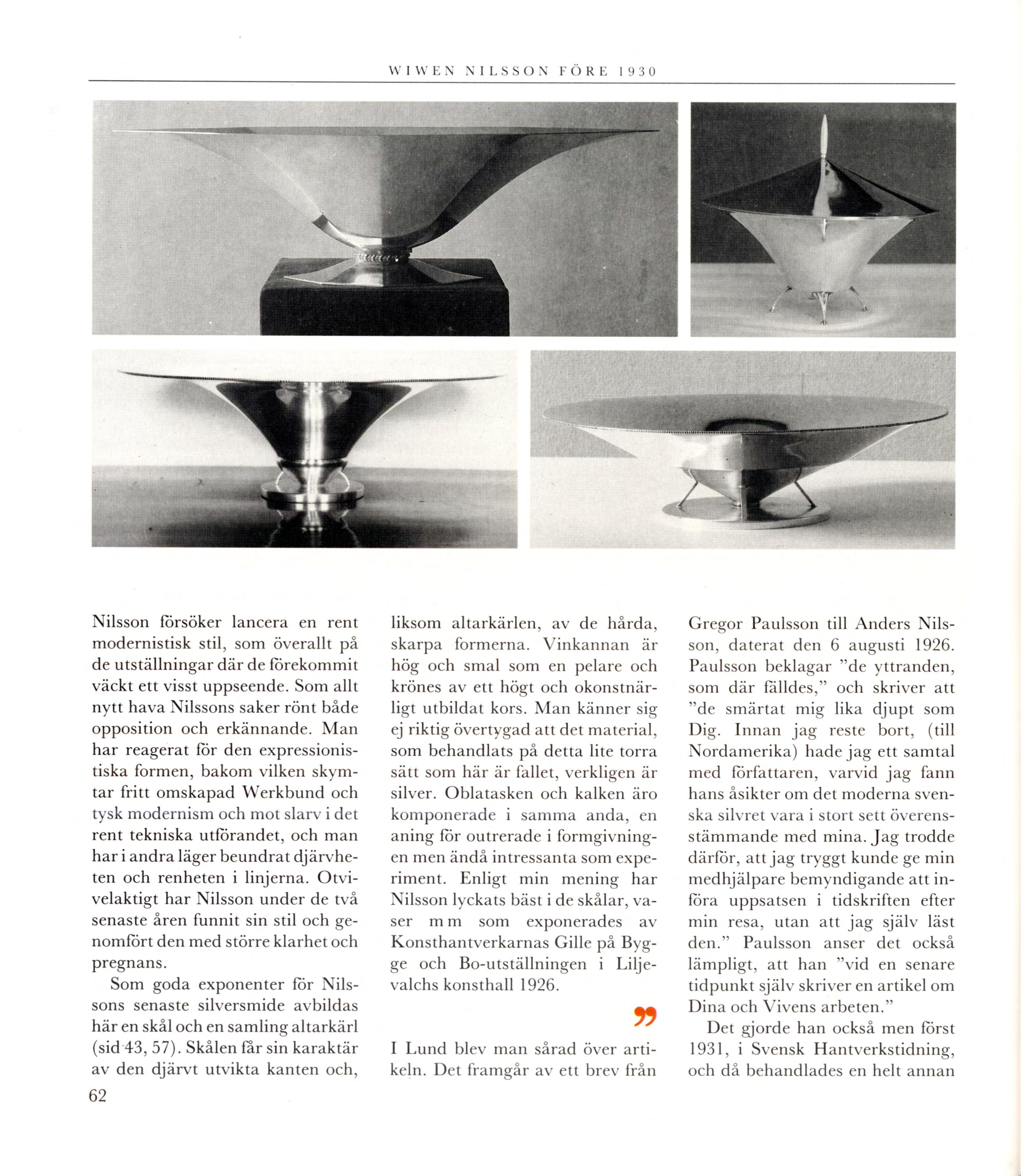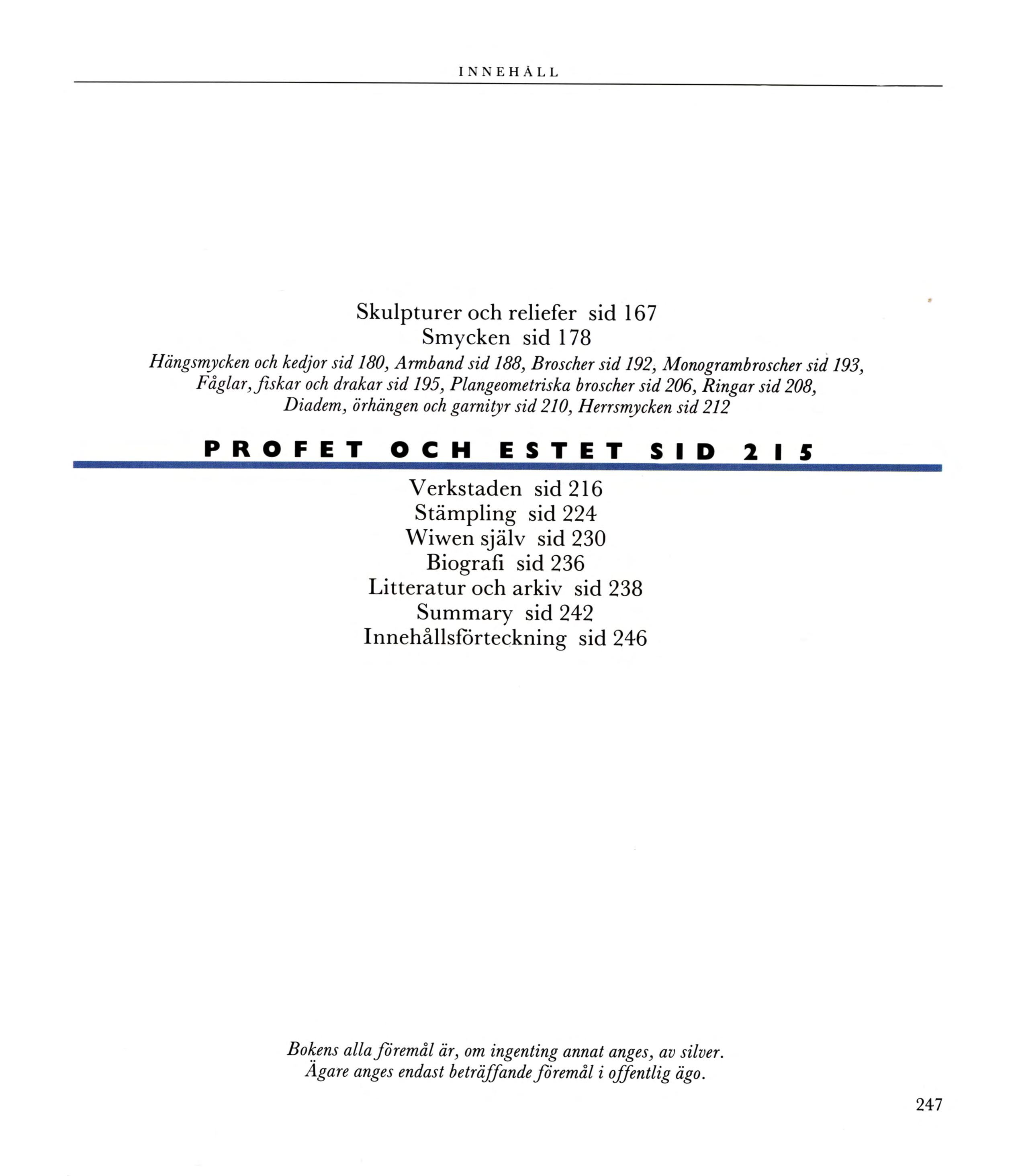 Sakralt silver under 1920-talet sid 57, Världsutställningen i Paris 1925 sid 60, Ofta dispyter , Wiwenfick ta över sid 66, Frigörelse , nytt formspråk sid 67, Sport- och idrottspriser sid 70