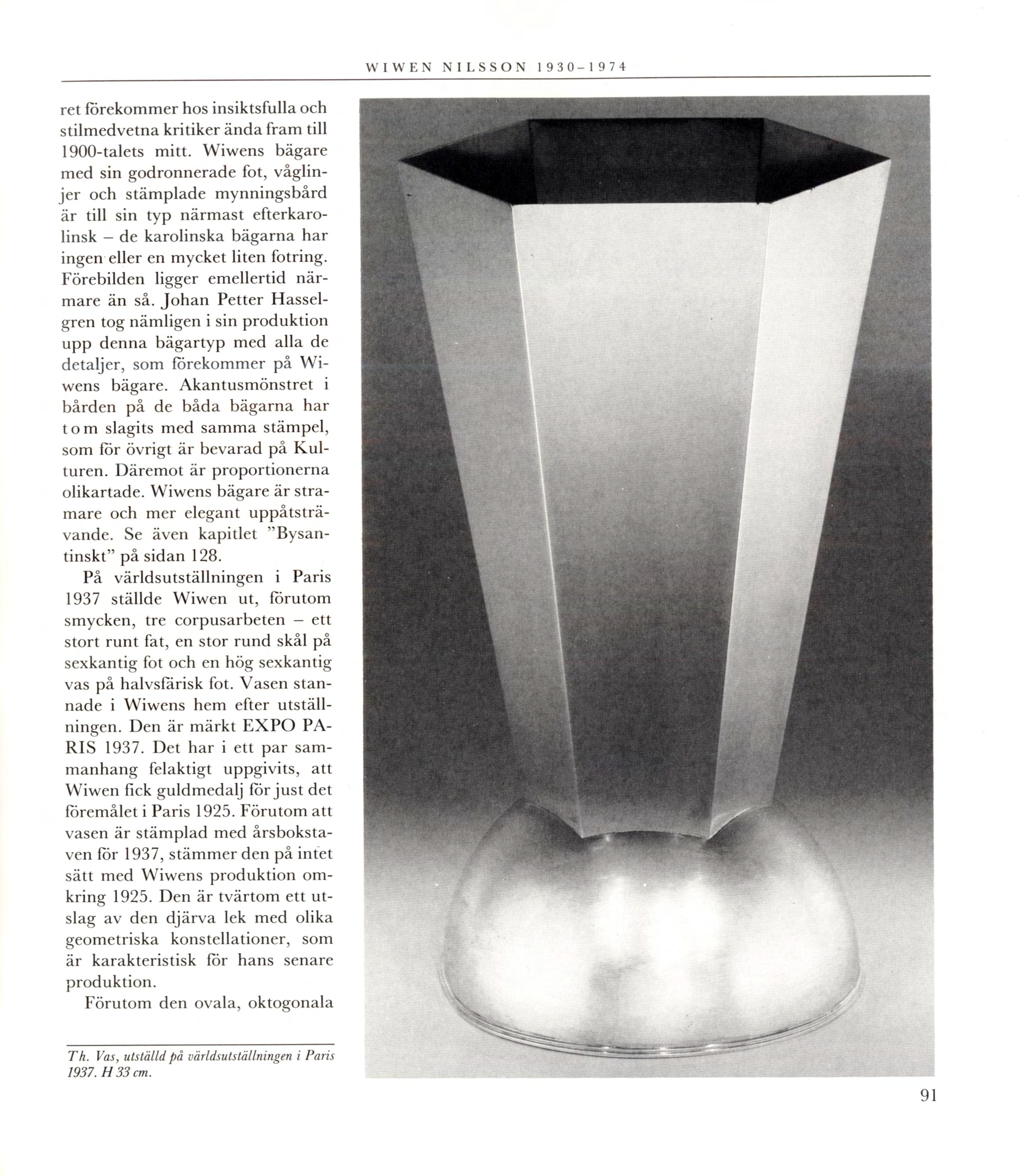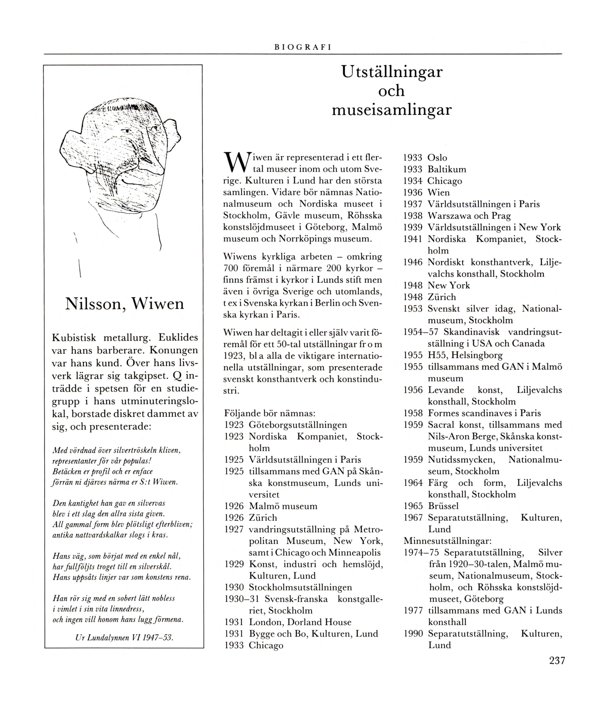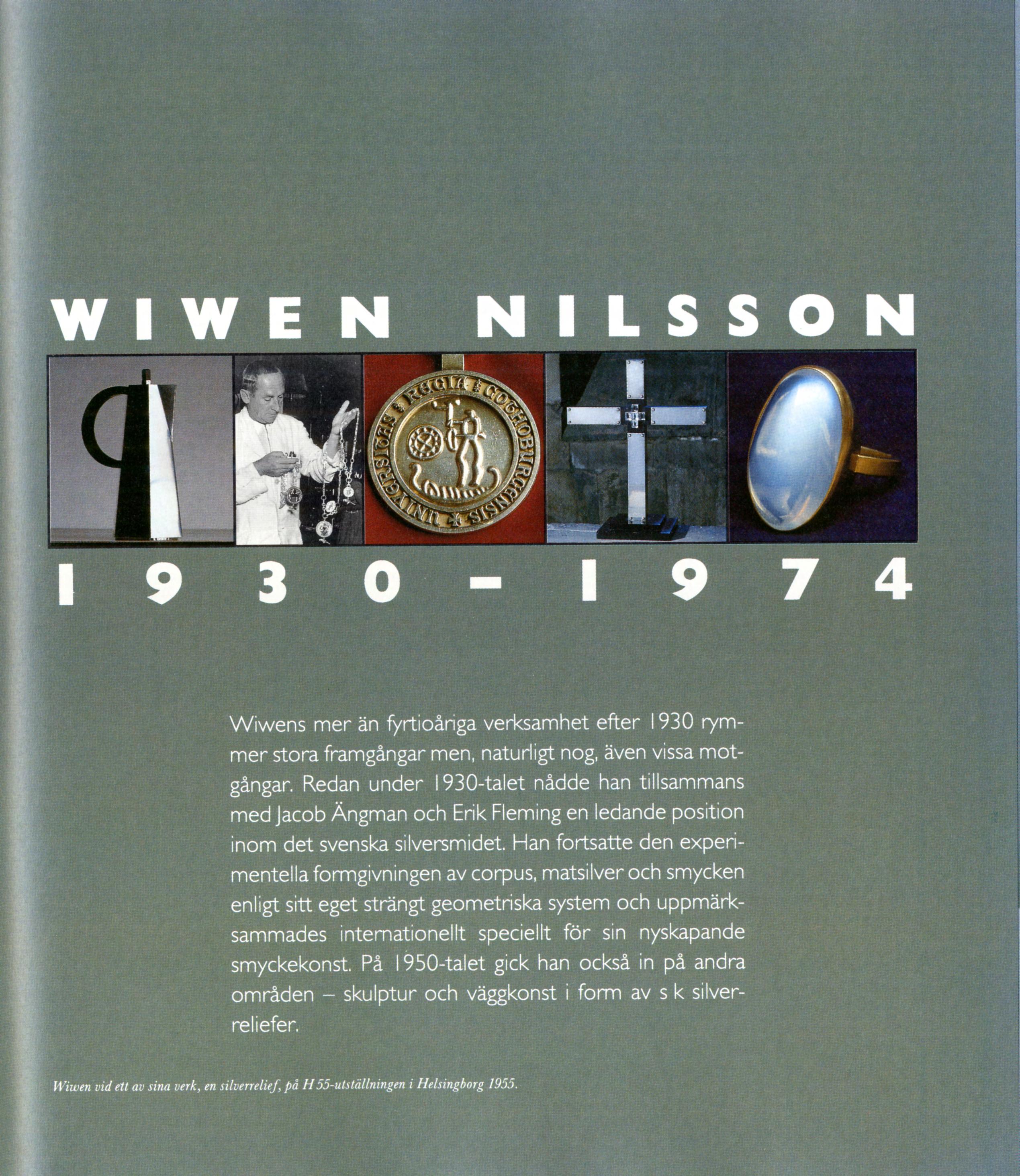 Wiwen Nilsson, 1897-1974, den lundensiske silversmeden och konstnären var under mer än femtio års tid en av förgrundsgestalterna inom svenskt konsthantverk. Han debuterade inför bl a en oförstående samling konstkritiker vid Göteborgsutställningen 1923 med silverarbeten i kubistisk expressionism, uppmärksammades internationellt på Parisutställningen 1925 och slog igenom med en fullt genomförd funktionalistisk form på Stockholmsutställningen 1930. Under de kommande decenniernas många framgångsrika internationella utställningar av svensk konstindustri och svenskt konsthantverk, arrangerade av Svenska Slöjdföreningen, var han en självklar representant för svenskt silversmide och smyckekonst ofta endast tillsammans med Erik Fleming, Atelier Borgila.