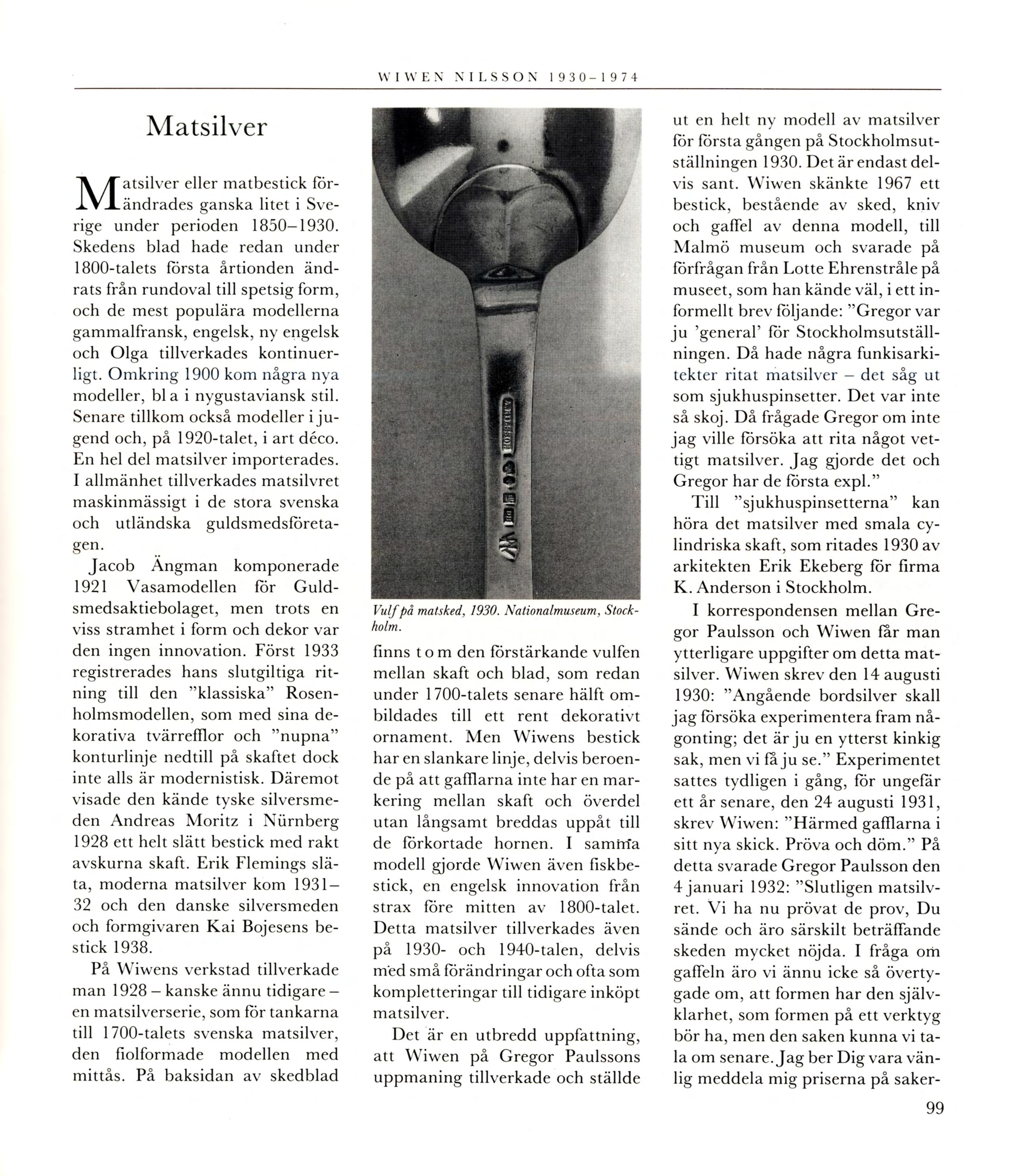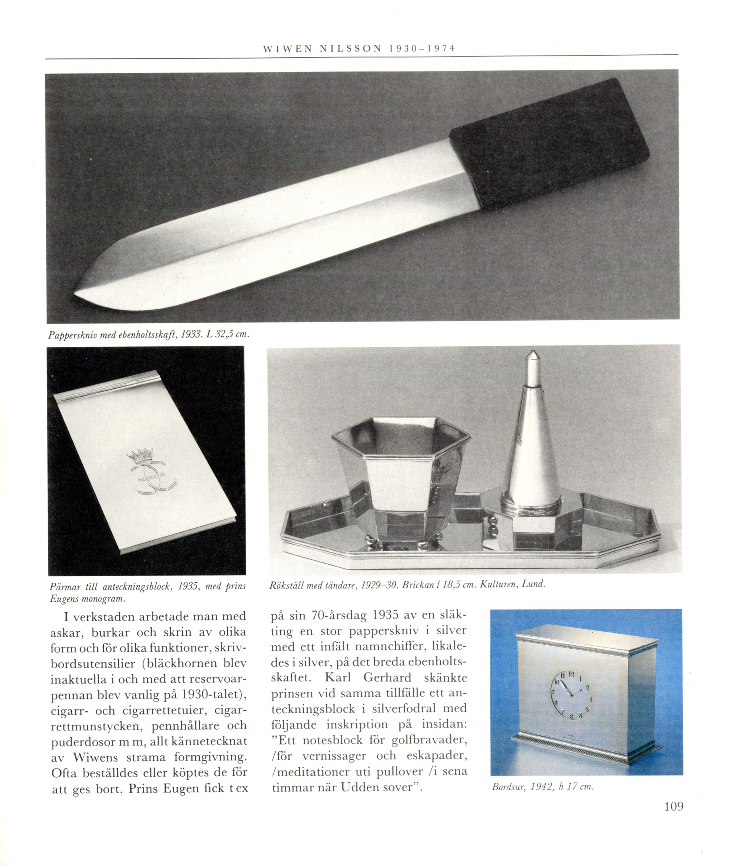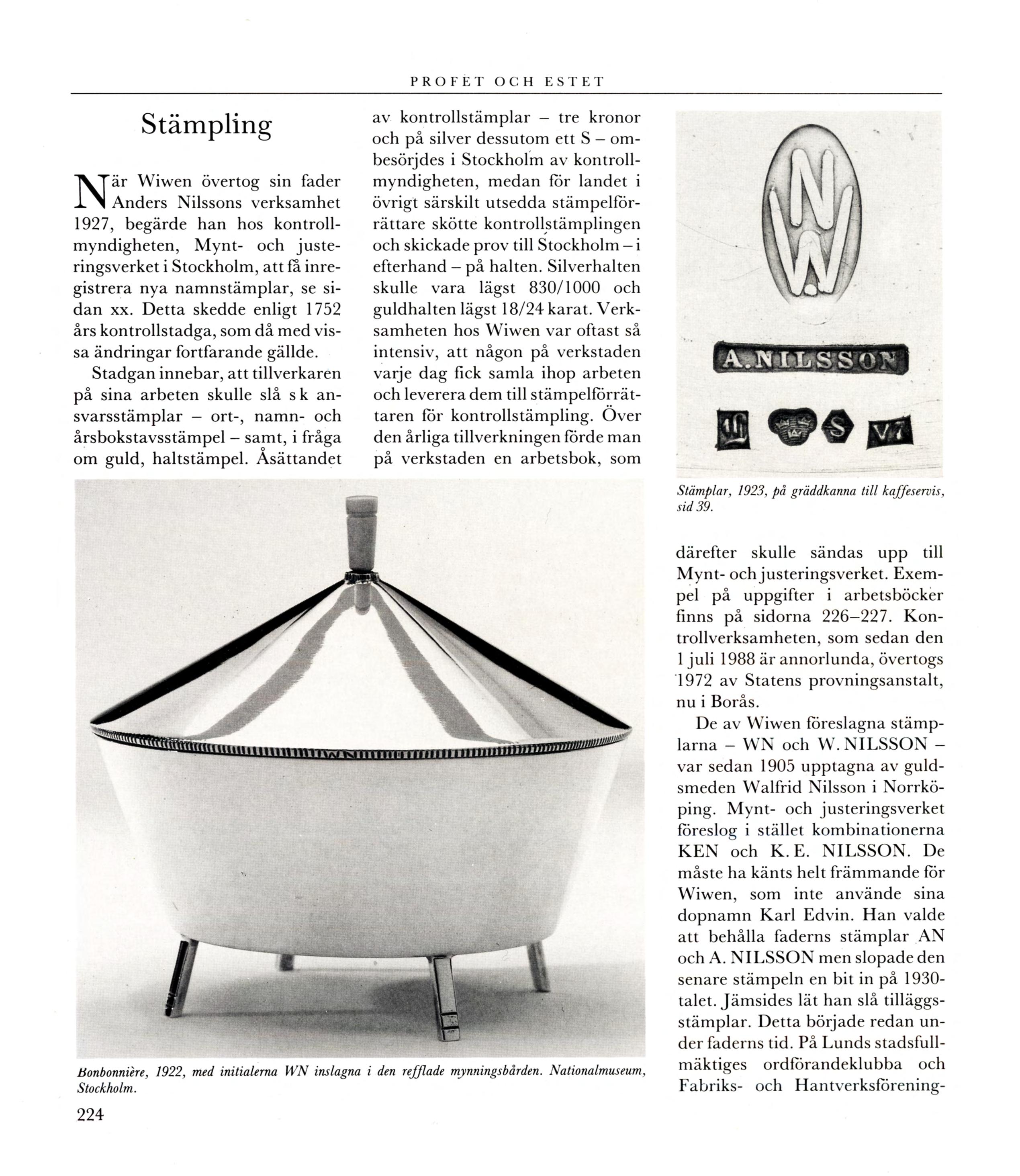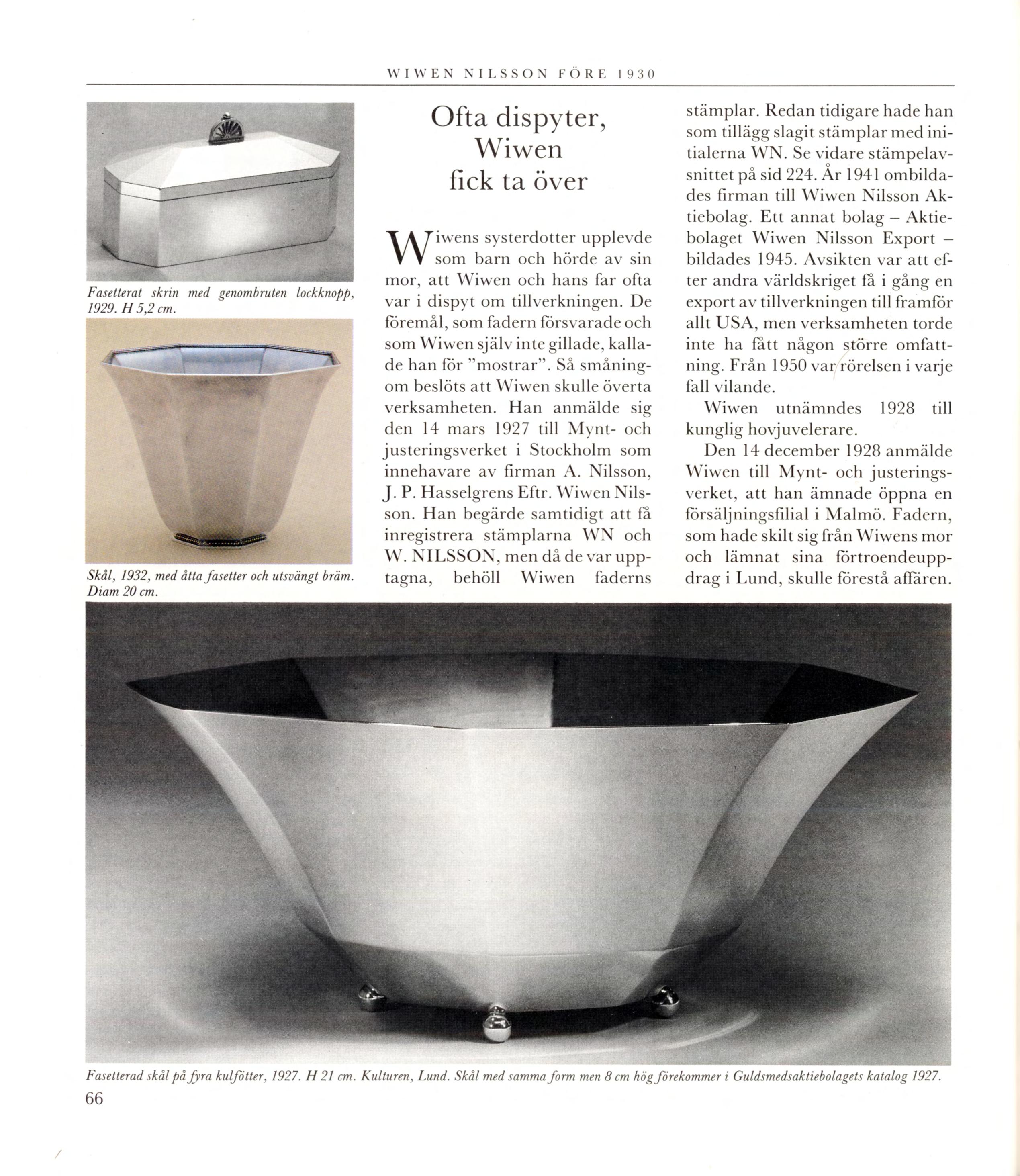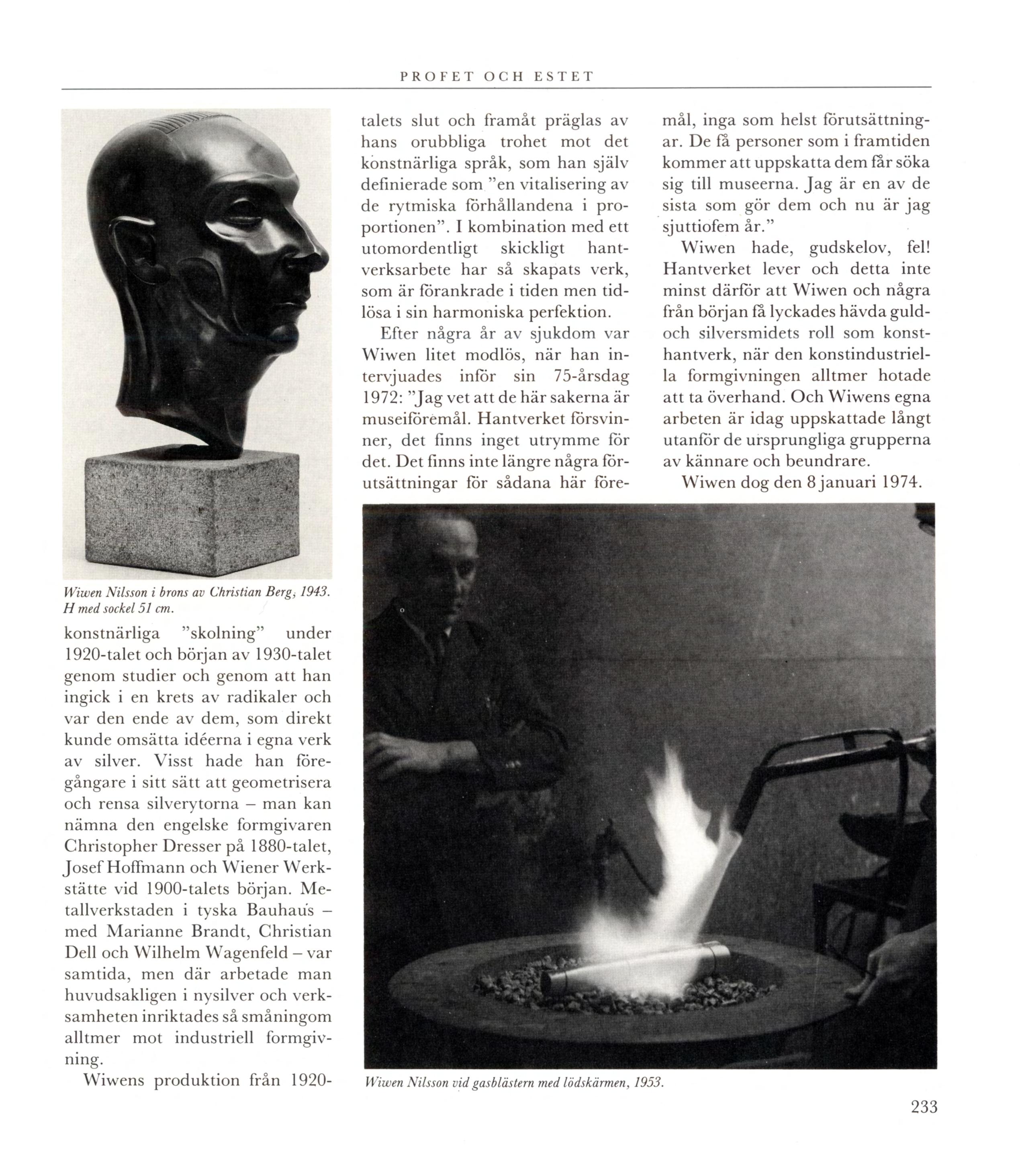 Wiwen Nilsson was one of the leading figures within silver- and goldsmithery from the 1920 's until his death. He was eminently competent in his craft, to which he added artistic consciousness and a strong sense of design.