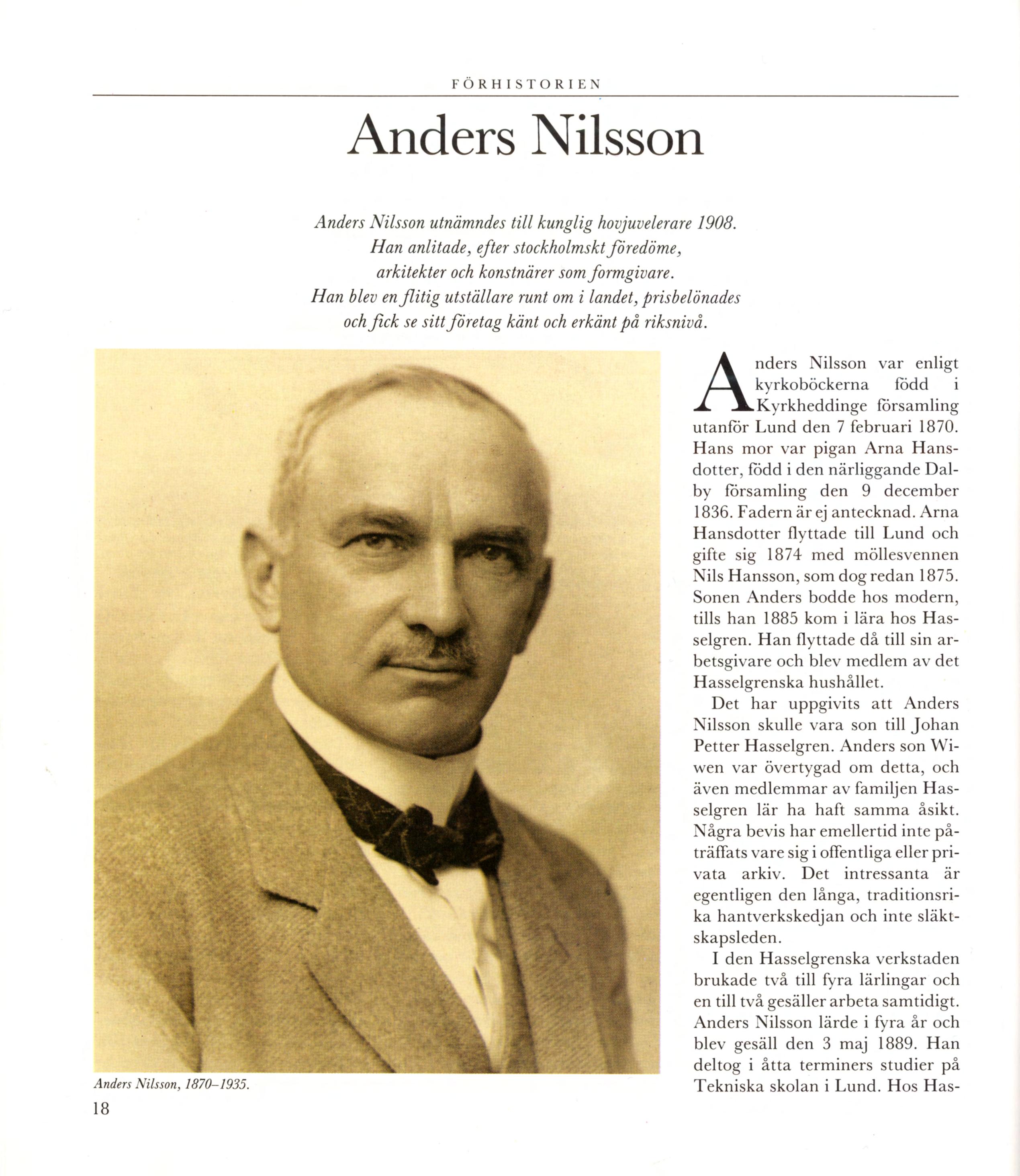 Anders Nilsson utnämndes till kunglig hovjuvelerare 1908. Han anlitade, efter stockholmsktfaredöme, arkitekter och konstnärer som /ormgivare.