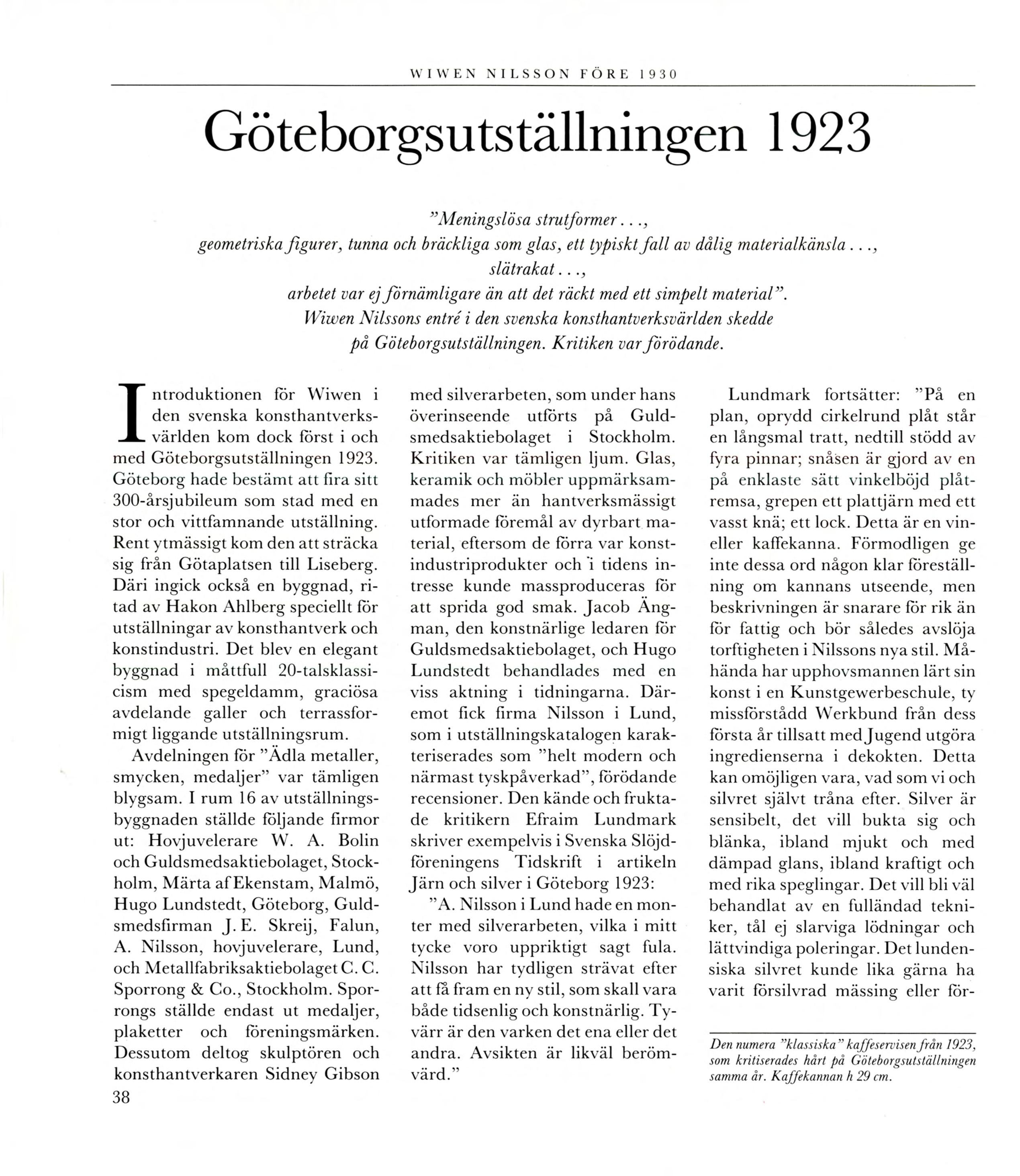 Nilsson made his debut at the Gothenburg Exhibition of 1923 , where there was a large section devoted to Swedish arts and crafts. His work was received very badly by the critics. One of them wrote that it balances on a thin si lver lin e between German Expressionism and thejugend style and consists of geometric figures, thin and fragile as glass a typical example ofin sensitivity to his material. One who did understand his skill and originali ty however was the head of the Exhibition , Erik Wettergren, who was also the curator of the Department of Applied Art at the National Museum in Stockholm.