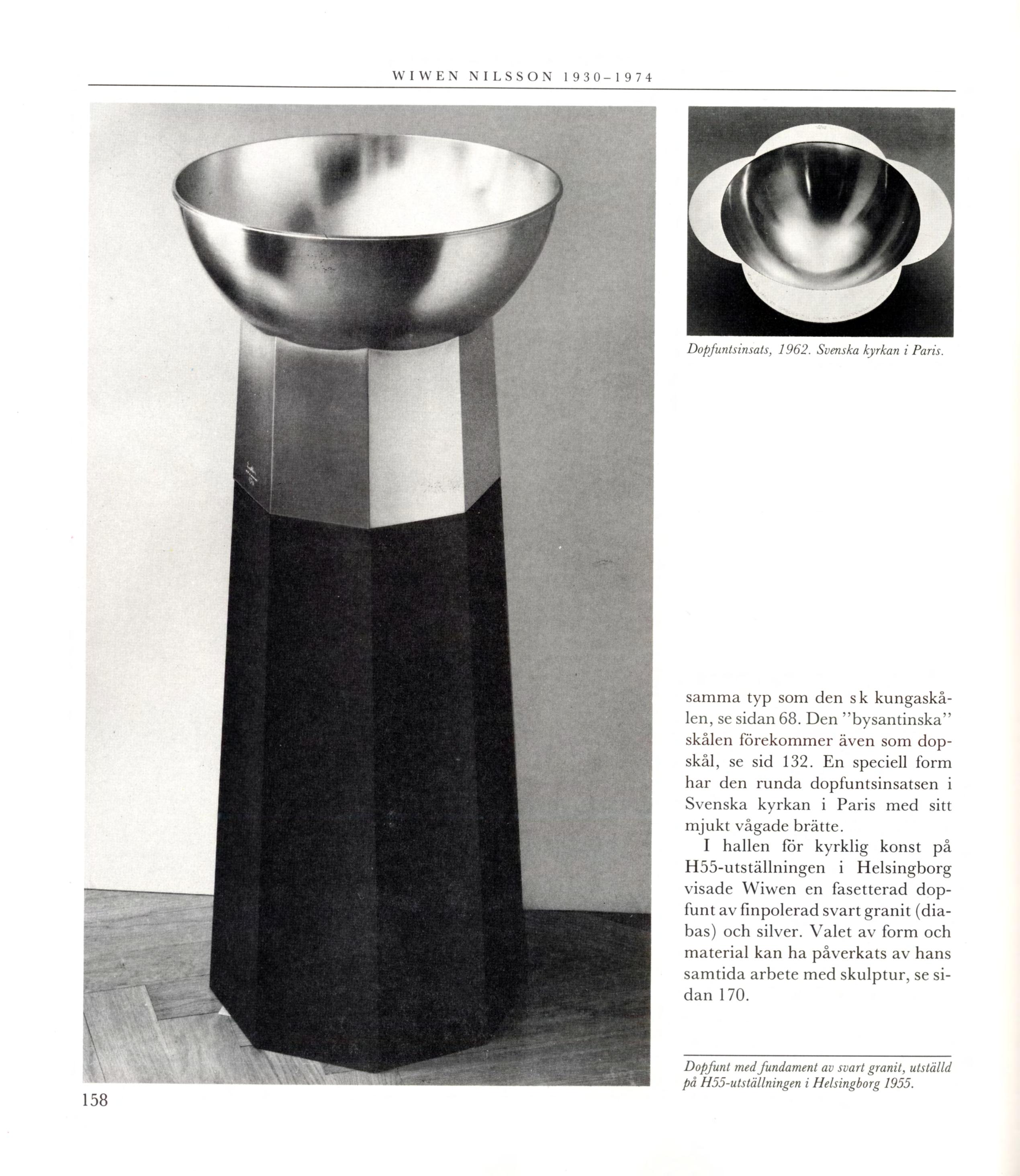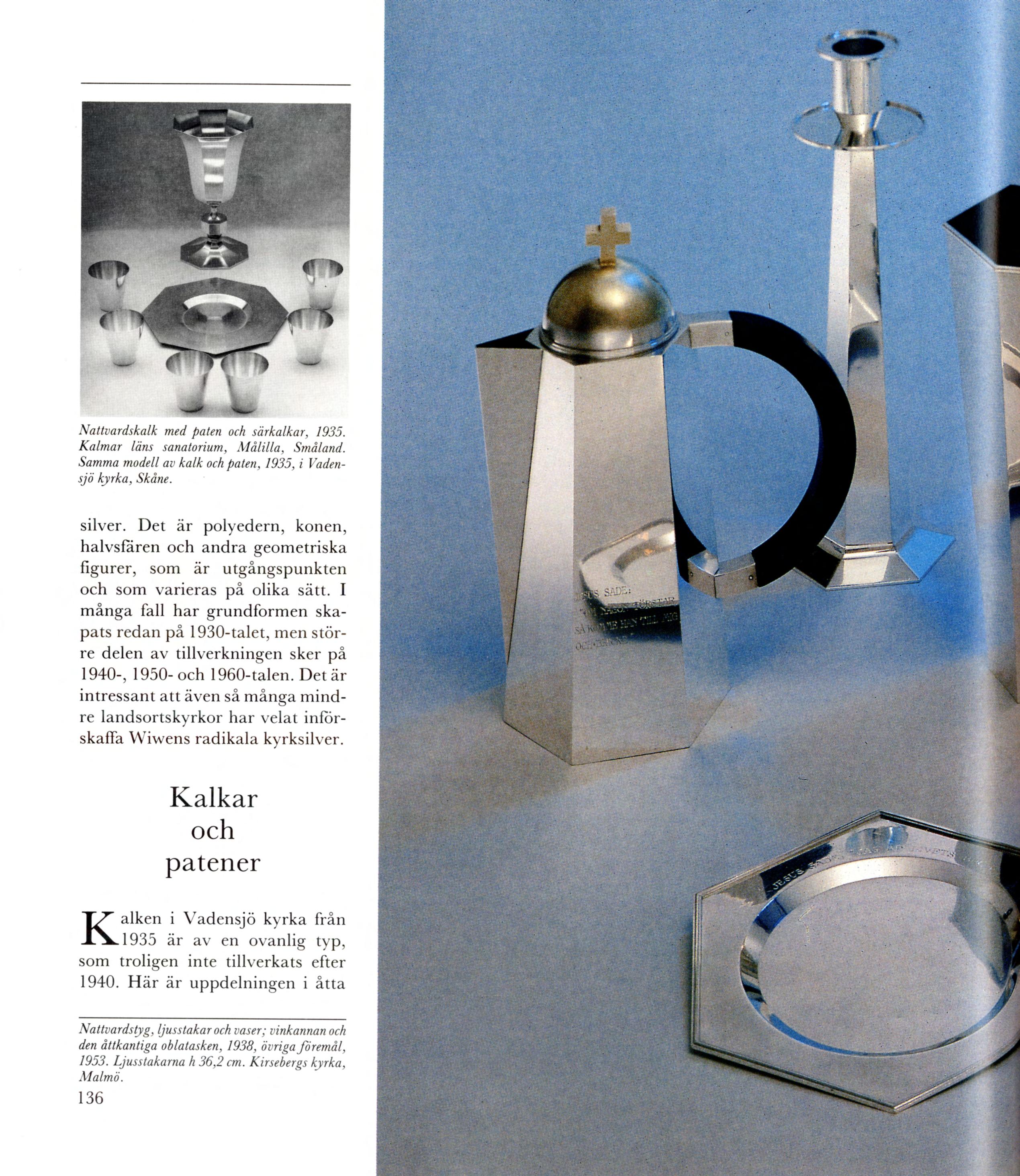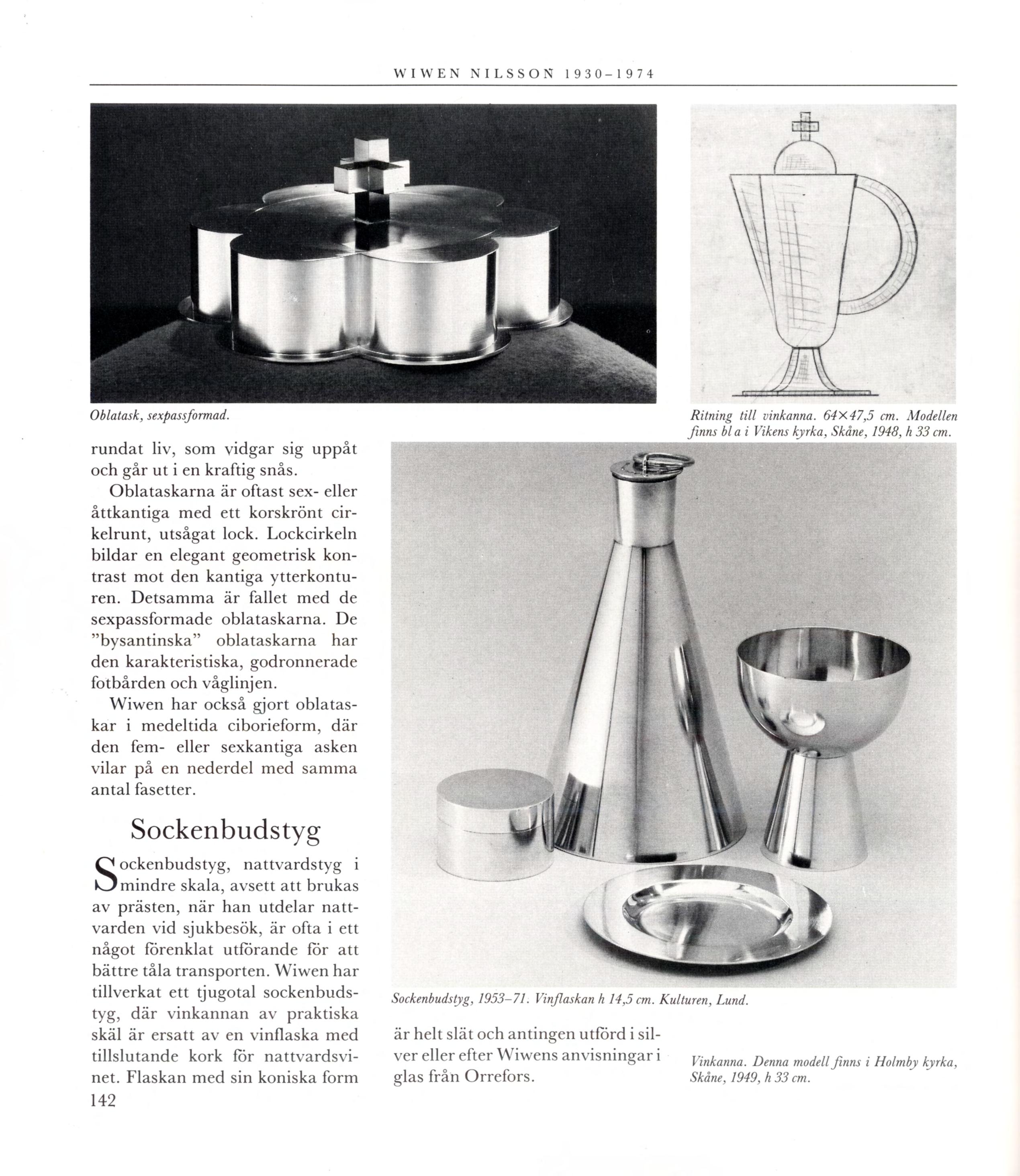 No Swedish smith has ever made as much church silver as Nilsson around 700 pieces in about 200 churches and crematoriums, mainly in southern Sweden but also in other parts of the country and abroad. In addition to chalices, patens, communion wafer boxes and wine pitchers, he has also designed inserts for baptismal fonts, candlesticks and vases.