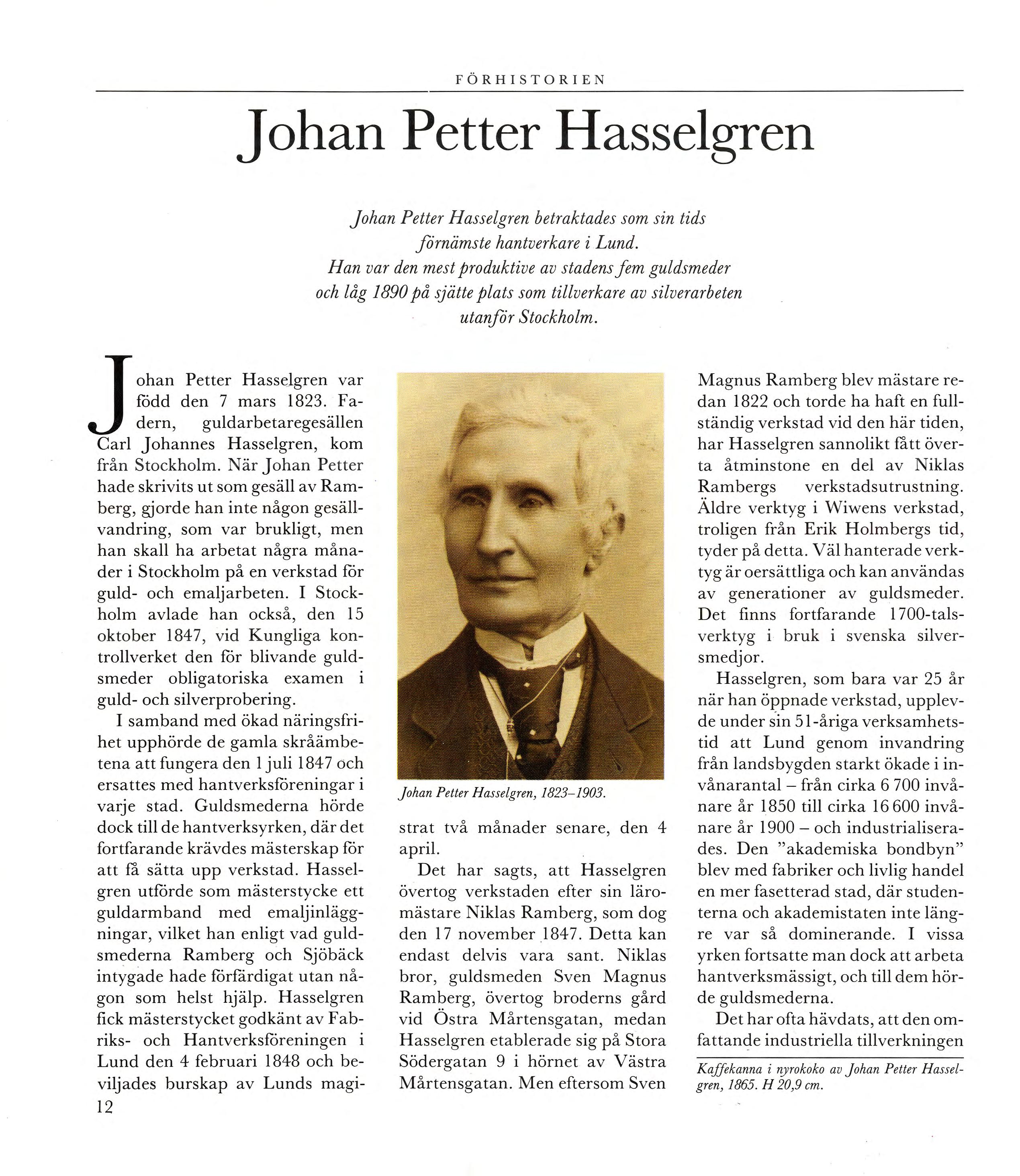 Johan Petter Hasselgren betraktades som sin tids förnämste hantverkare i Lund. Han var den mest produktive av stadens fem guldsmeder och låg 1890 på sjätte plats som tillverkare av silverarbeten utanför Stockholm.