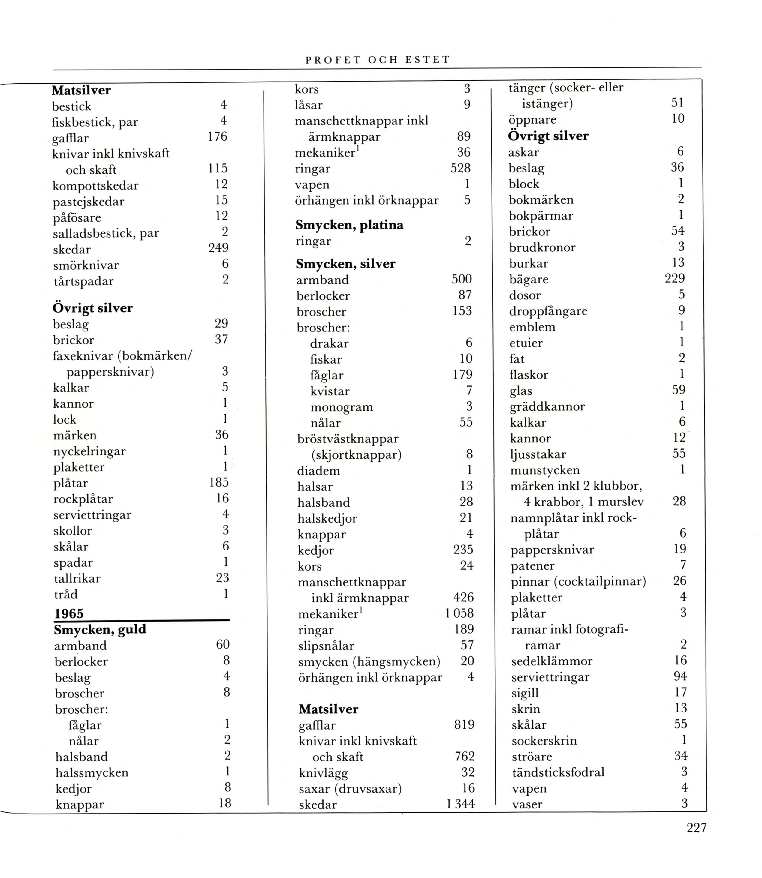 Bordskärl sid 82, Matsilver sid 99, Ljusstakar sid 104 , Hedersgåvor och presenter sid 108, Ämbetskedjor och vär dighetstecken sid 117 "Bysantinskt" sid 128 Tenn sid 133 Sakralt silver sid 135