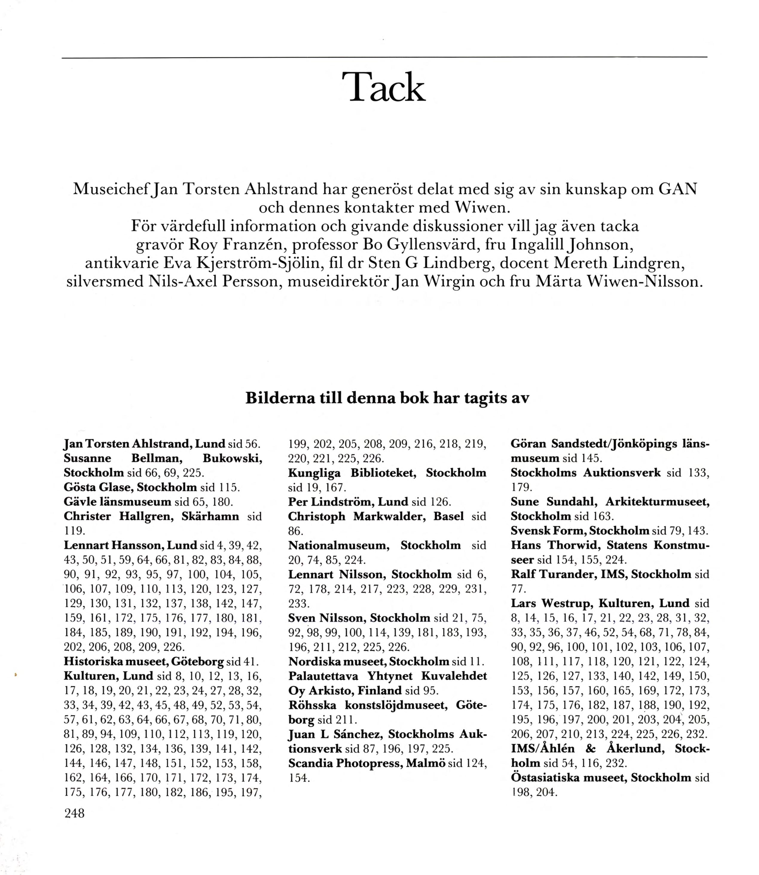 Mus e ichefJan Tor s t e n Ahlstr a nd h a r ge n e röst del a t m e d si g av s in kunskap om GAN och d e nn e s kontakt e r m e d Wiwen . För v ärdefull inform a tion och gi v ande diskussion e r v ill jag ä ve n t a ck a g r av ör Ro y Fr a nz e n , profe ssor Bo G y ll e ns vä rd , fru ln g alillJohn s on , a ntik va ri e E va Kj e rström-Sjölin , fil dr St e n G Lindb e r g, docent M e reth Lindgr e n , sil ve rsm e d Nils-A xe l P e rsson , mus e idir e ktör J a n Wir g in och fru Märt a Wi we n-Nils so n.