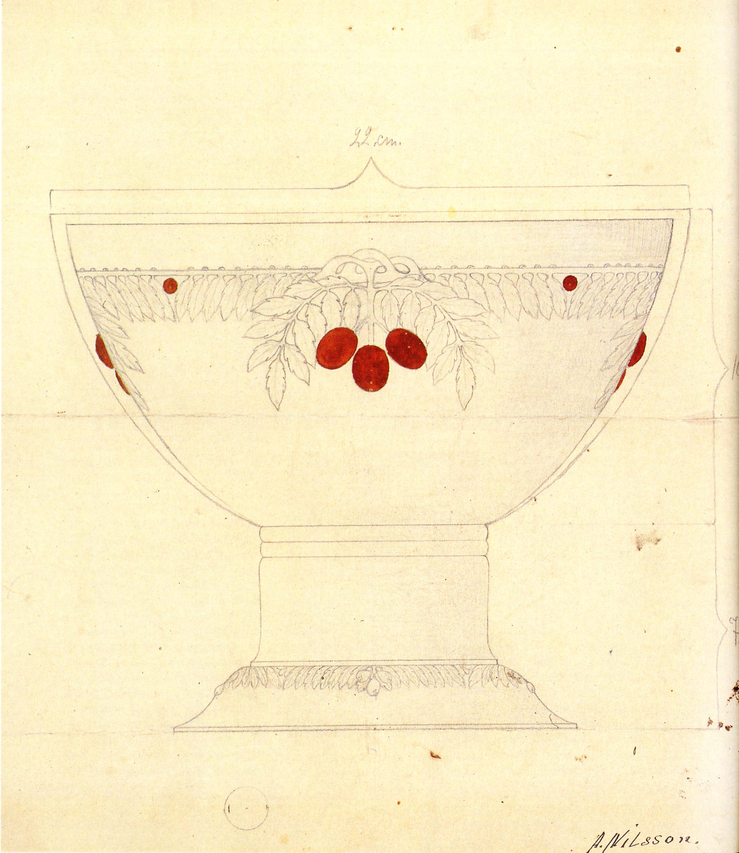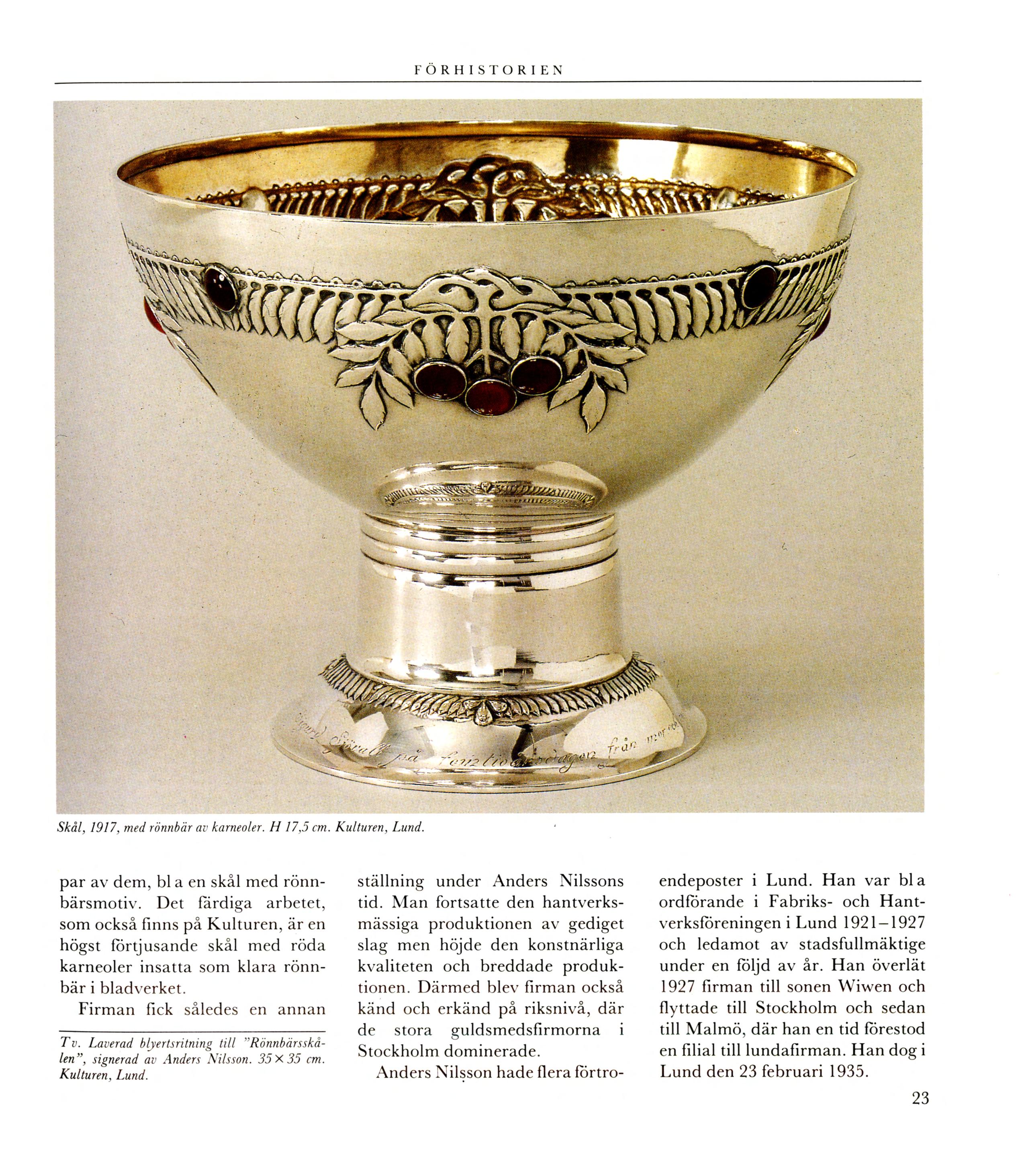 utställningen 1909 enligt Nordisk Guldsmeds-Tidning med "fat, pokaler m.m. , komponerade och modellerade af flere framstående arkitekt er och modellörer. " I tidskriften av bildas också en ganska praktfull fruktskål , som var med på utställningen. Skålen med sin platå är helförgylld med ornament av stiliserade rönnbärskvistar ett symboliskt svenskt jugendmotiv. Det p å p e kas särskilt i texten , att "här tillämpats ett ur yrkessynpunkt sä rd e les beaktansvärdt tillv er knin gssätt samt att h e la den stora pjäsen, som är af oval form , är från undre kanten ända upp till munstycket hamrad upp efter gamma ld ags ar b ets metod ." D e tta uttalande tyder ju p å att man på annat h å ll gic k vissa genvägar i arbetet. Skåle n har lfomponerats av d e n väl-