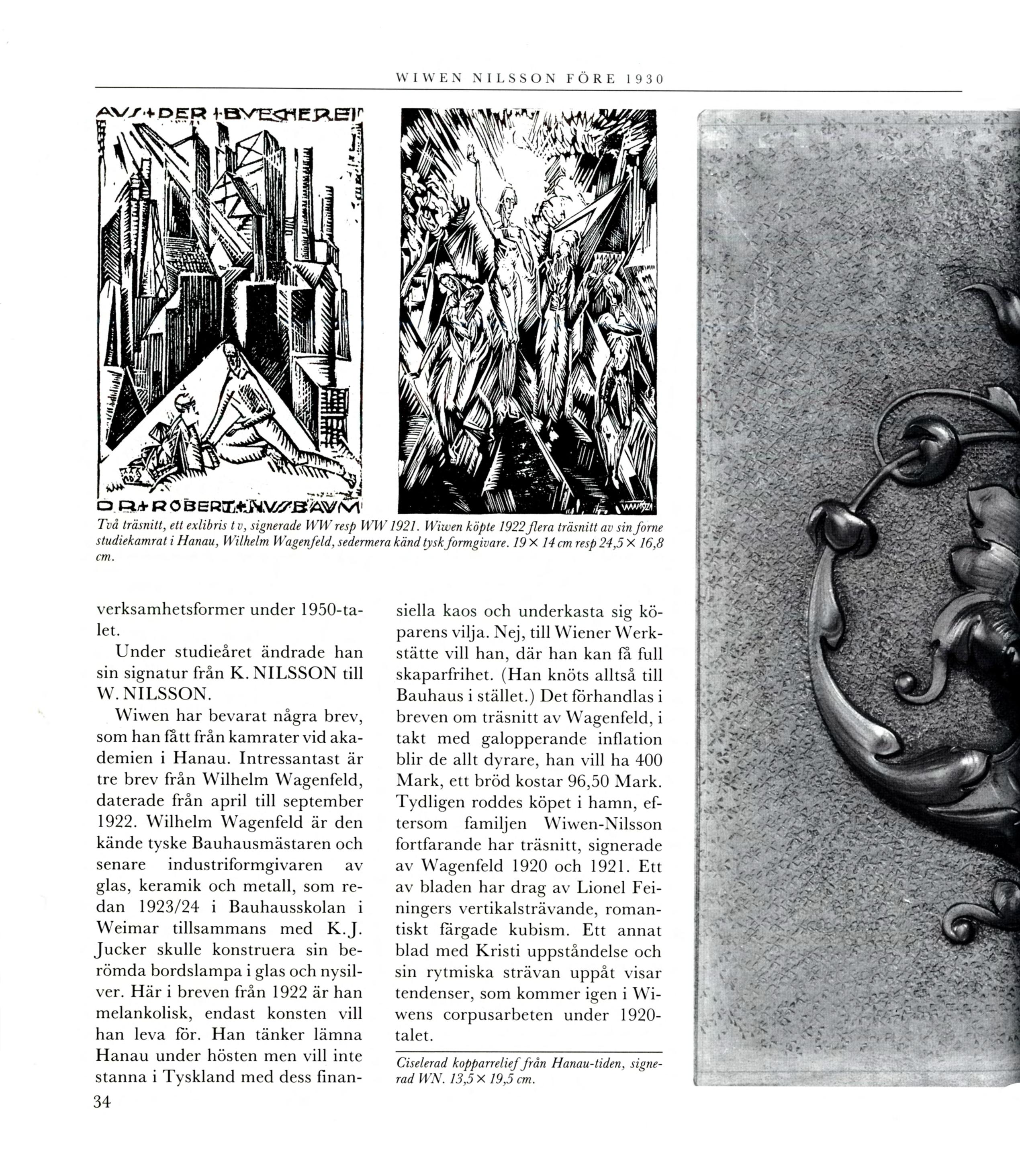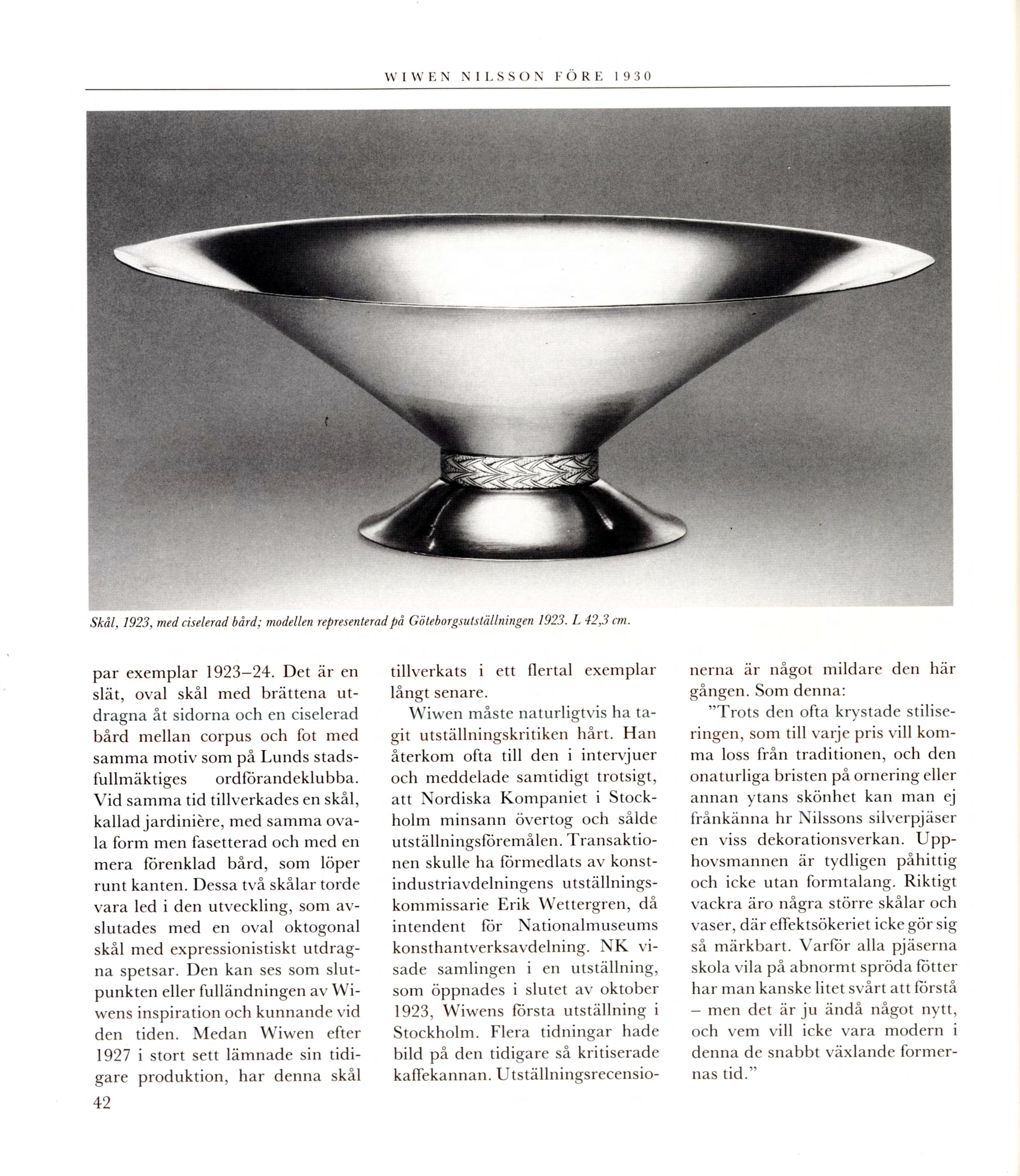 knowledge but also acquired an overview ofthe development ofhis craft outside Sweden. One of his fellow students was Wilhelm Wagenfeld, later to become a very famous German designer in metal, g lass and pottery. Nilsson was a lso exposed to the German expres sionist movement while there.