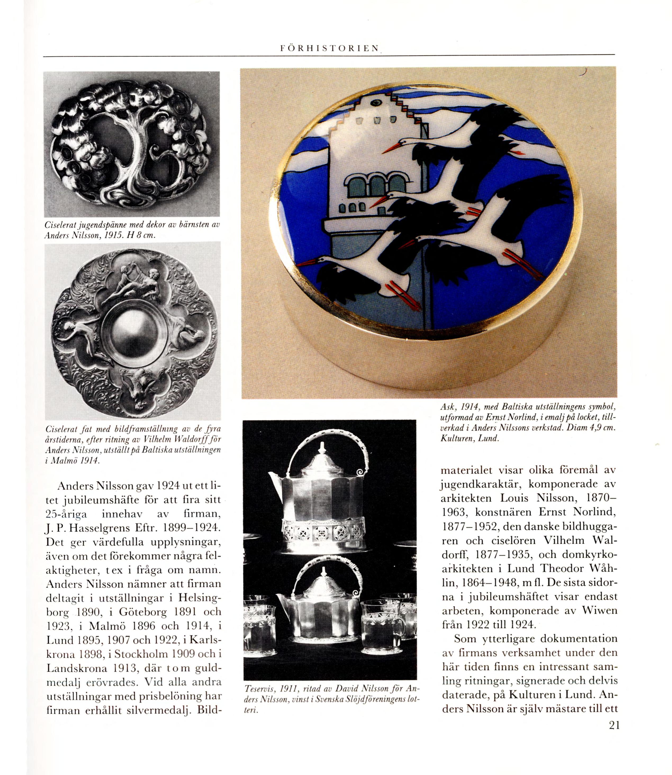 And e rs Ni l sson gav 1924 ut e tt l it e t jubil e um s häft e for a tt fir a s itt 25 å ri ga inn e h av av firm a n , J. P . H asse lg r e ns Eftr. 1899-1924. D e t ge r värdefu ll a u pp lys ningar , även o m d et för e komm e r n åg ra fe laktigheter , t e x i fr åga o m n a mn. And e r s Ni lsson nämn e r att firm a n d e lt aa it i ut s t ä ll nin gar i H e ls in g bor g 1890, i Göteborg 189 l oc h 1923 , i Malmö 1896 oc h 19 14 , i Lund l 895 , 1907 oc h 19 22 , i K a rl s kr o n a l 898, i Sto c kh o lm 19 09 oc h i L a nd s kr o n a 19 13 , d är to m gu ld m ed a lj e rövrad e s Vid a ll a a ndr a ut s t ä llnin gar m e d pri b e löning har firm a n e rh å llit s il ver m eda lj. Bild-