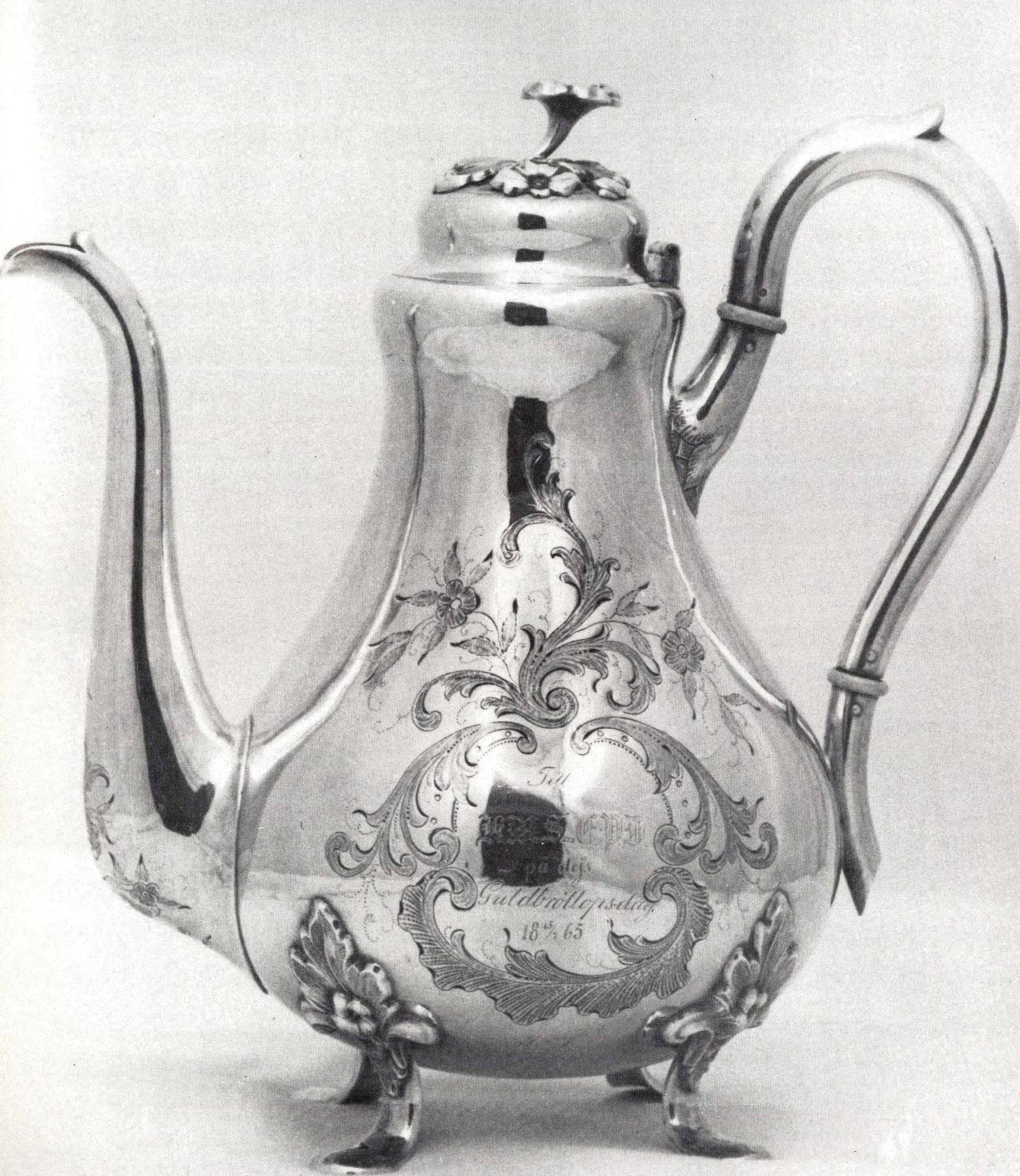 Kaffekanna i nyrokoko av Johan Petter Hasselgren, 1865. H 20,9 cm.