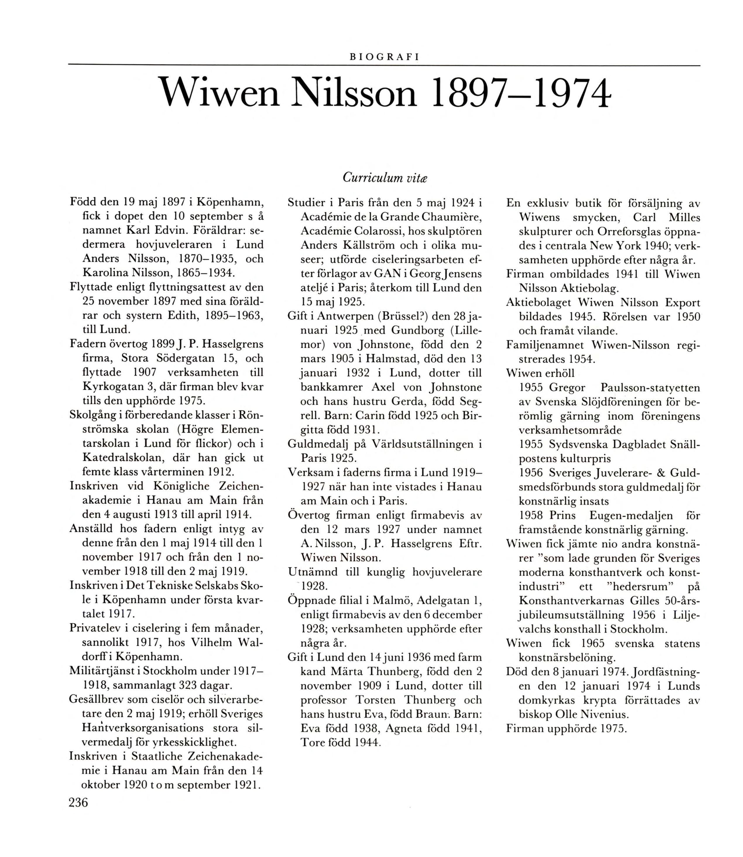 Wiwen Nilsson was bom on May 19 , 1897 to Swedish parents in Copenhagen, DenmarkJ where his father Anders Nilsson, l 870-1935, was employed in one of Copenhagen's largest goldsmith firms . The family moved back to Lund in 1897, and in 1899 Anders Nilsson took over his former teacher's goldsmith firm, at that time the biggest in Lund. Anders Nilsson , who was named court jeweler in 1908, ordered designs from architects and artists as his models. He participated in many exhibitions, won many prizes, and made the company nationally known.