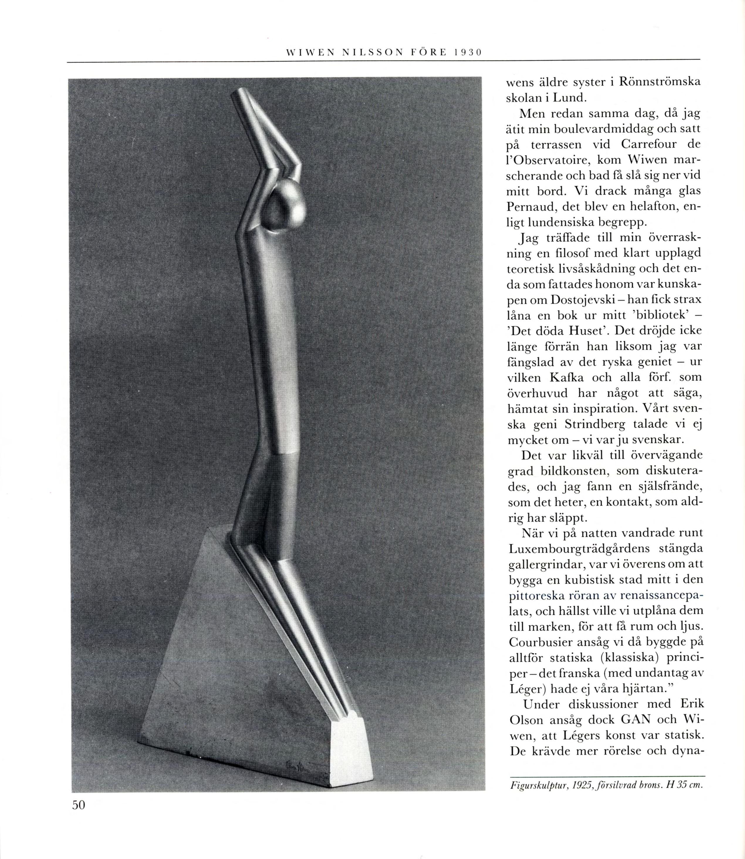 execution were to be an important esthetic for his art in the future. He also worked with modernistic sculpture of an expressionist, abstract type and went around with a group of Swedish artists in Paris centered around Fernand Leger and his studio and school at 86 , rue Notre Dame <les Champs in Montparnasse. The single rriost important influence for ilsson however was the contact he had with the modernistic Swedish artist Gösta Adrian-Nilsson, known as GAN . The latter stayed in Lund for several years after his Paris sojourn , moving to Stockholm in the beginning of the l 930's. The two men began a correspondence which was to continue until GA died in 1965, often going into deep and comlicated questions of art in their letters.