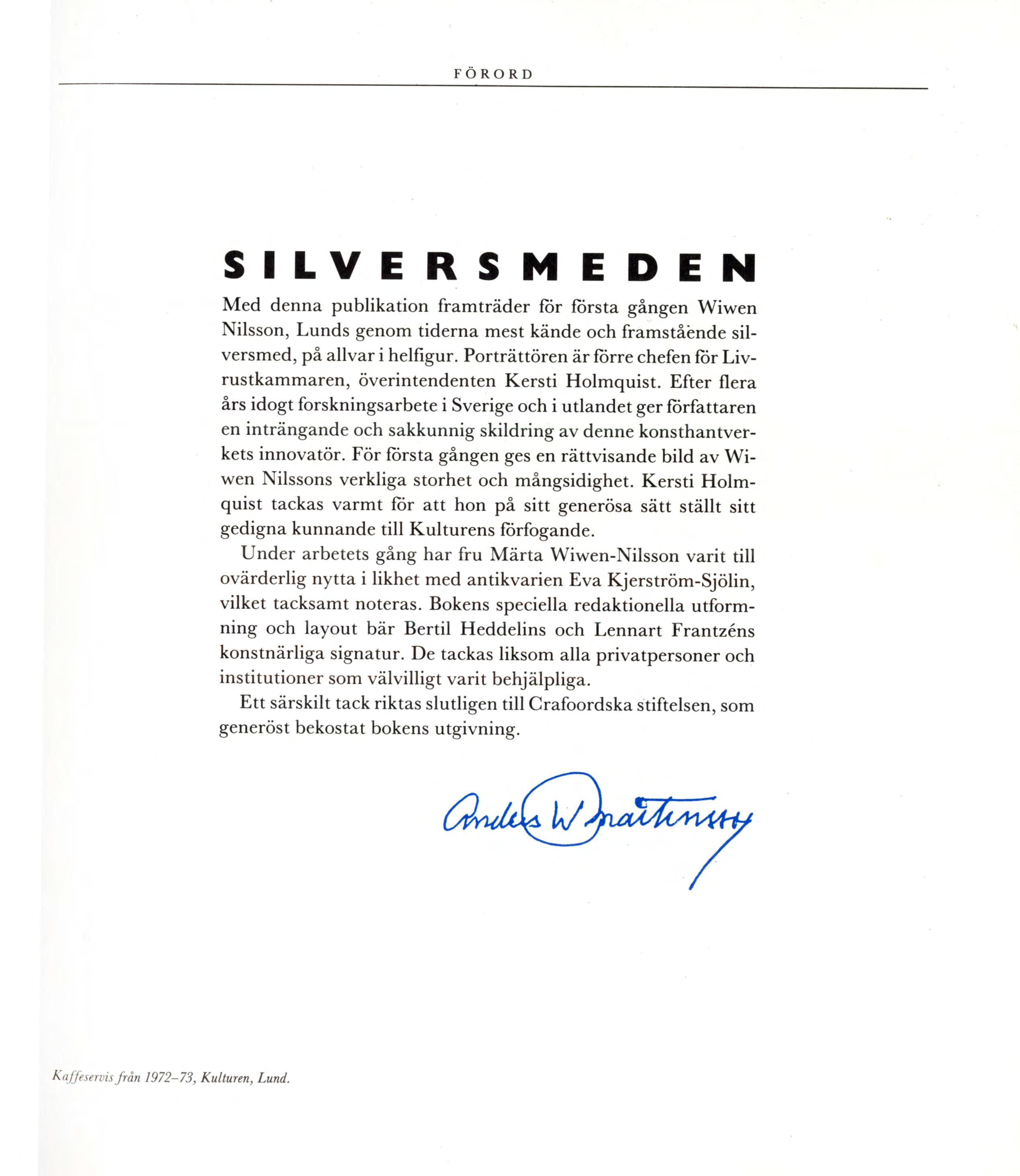 Med denna publikation framträder för första gången Wiwen Nilsson, Lunds genom tiderna mest kände och framstående silversmed, på allvar i helfigur Porträttören är förre chefen för Livrustkammaren, överintendenten Kersti Holmquist. Efter flera års idogt forskningsarbete i Sverige och i utlandet ger författaren en inträngande och sakkunnig skildring av denne konsthantverkets innovatör. För första gången ges en rättvisande bild av Wiwen Nilssons verkliga storhet och mångsidighet. Kersti Holmquist tackas varmt för att hon på sitt generösa sätt ställt sitt gedigna kunnande till Kulturens förfogande.