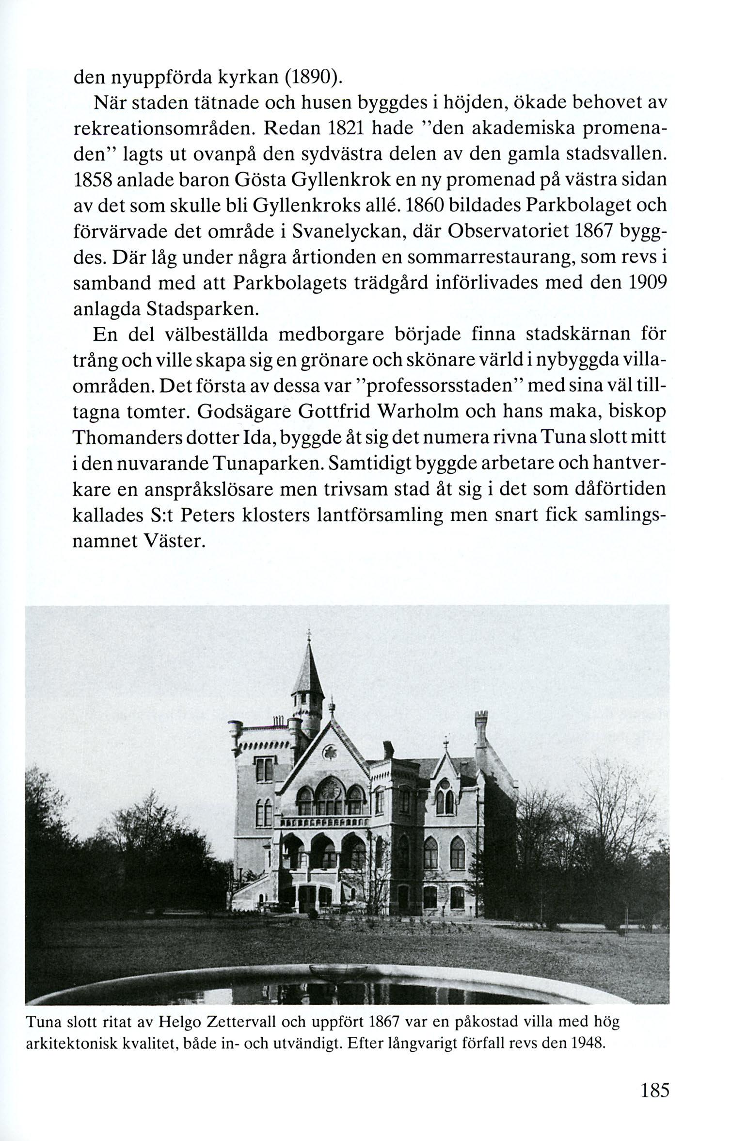 En del välbeställda medborgare började finna stadskärnan för trång och ville skapa sig en grönare och skönare värld i nybyggda villaområden. Det första av dessa var "professorsstaden" med sina väl tilltagna tomter. Godsägare Gottfrid Warholm och hans maka, biskop Thomanders dotter Ida, byggde åt sig det numera rivna Tuna slott mitt i den nuvarande Tunaparken. Samtidigt byggde arbetare och hantverkare en anspråkslösare men trivsam stad åt sig i det som dåförtiden kallades S:t Peters klosters lantförsamling men snart fick samlingsnamnet Väster.